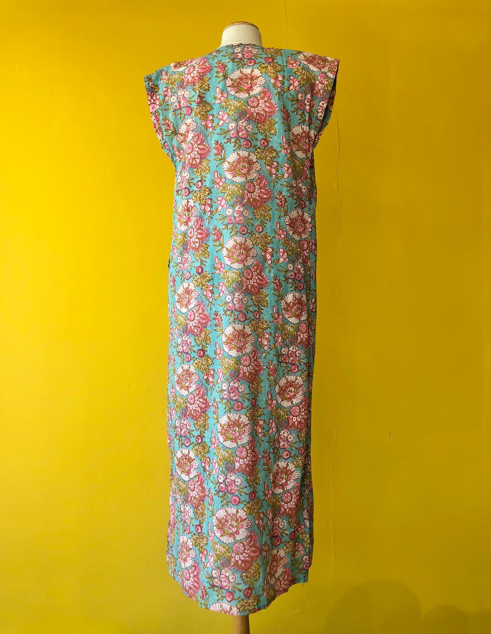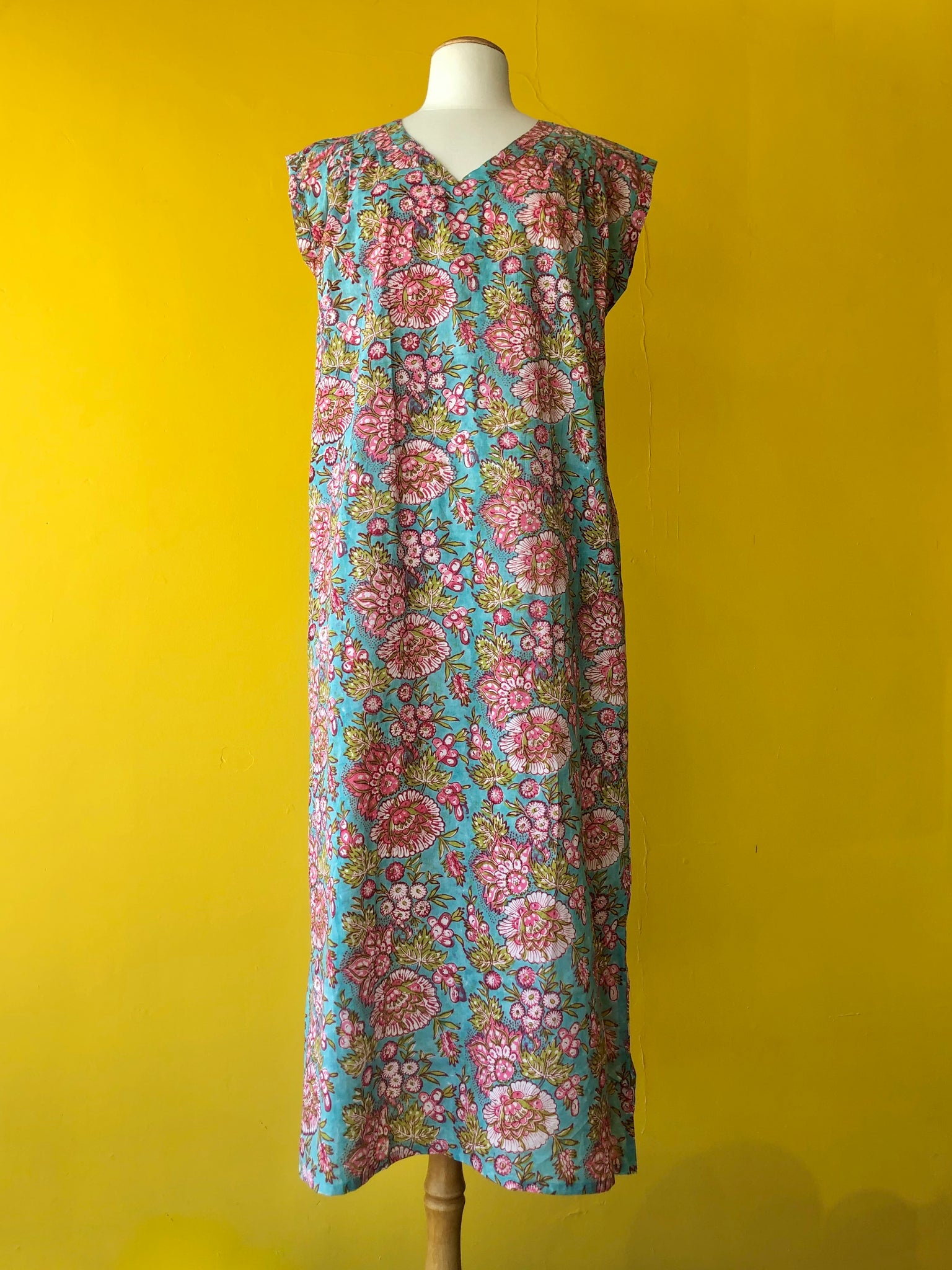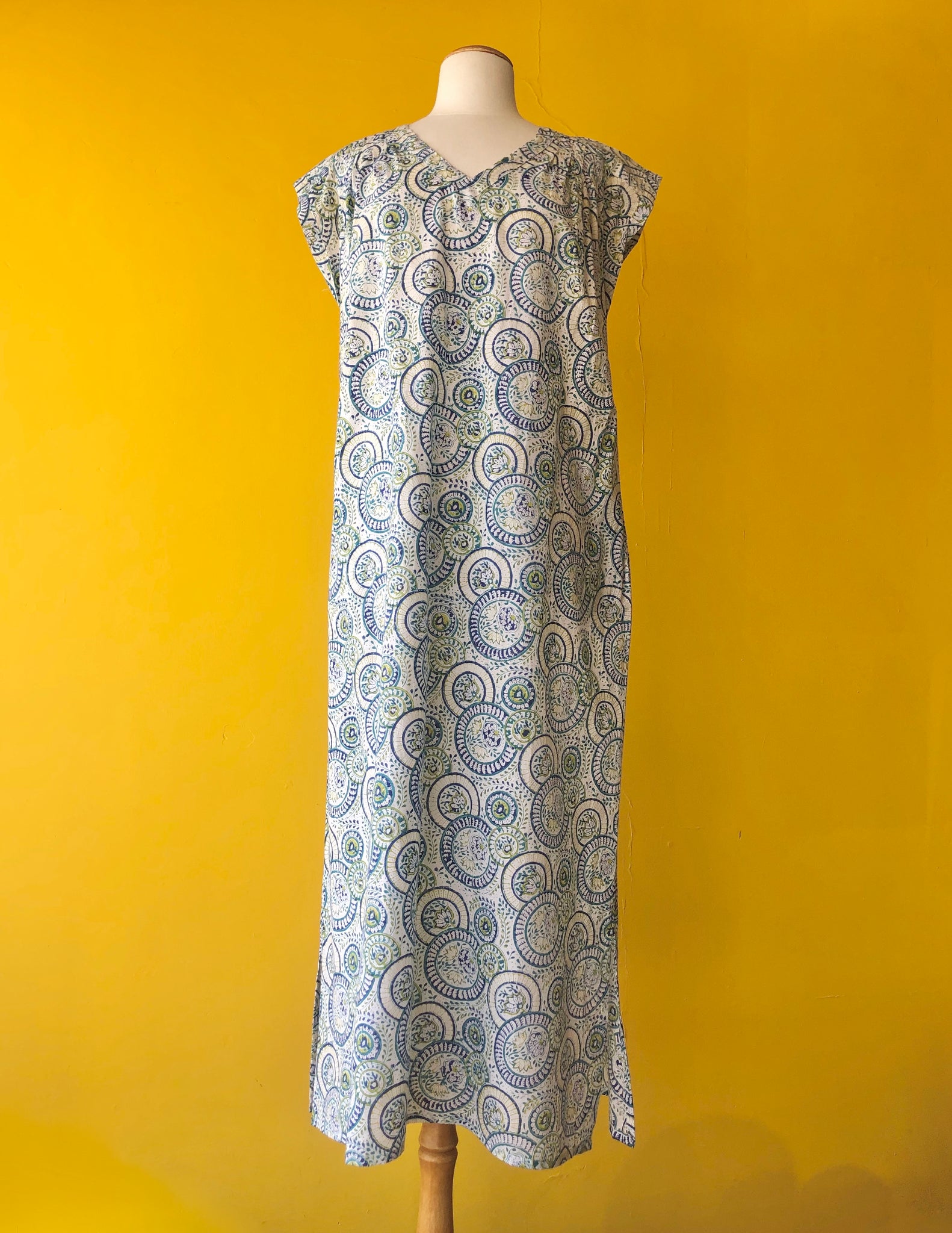 Full-length v-neck nightdress with shoulder pleating, two side pockets, and two bottom side slits.