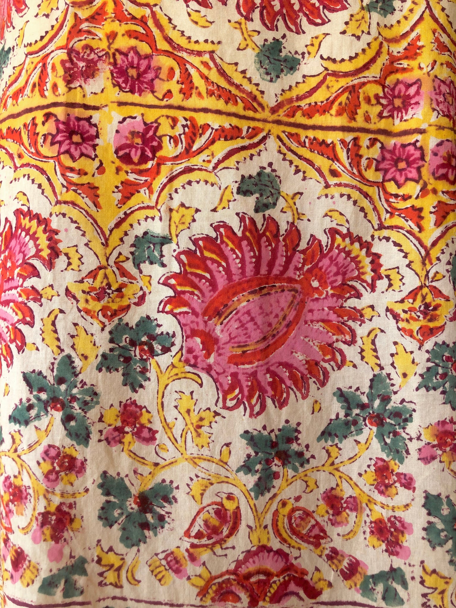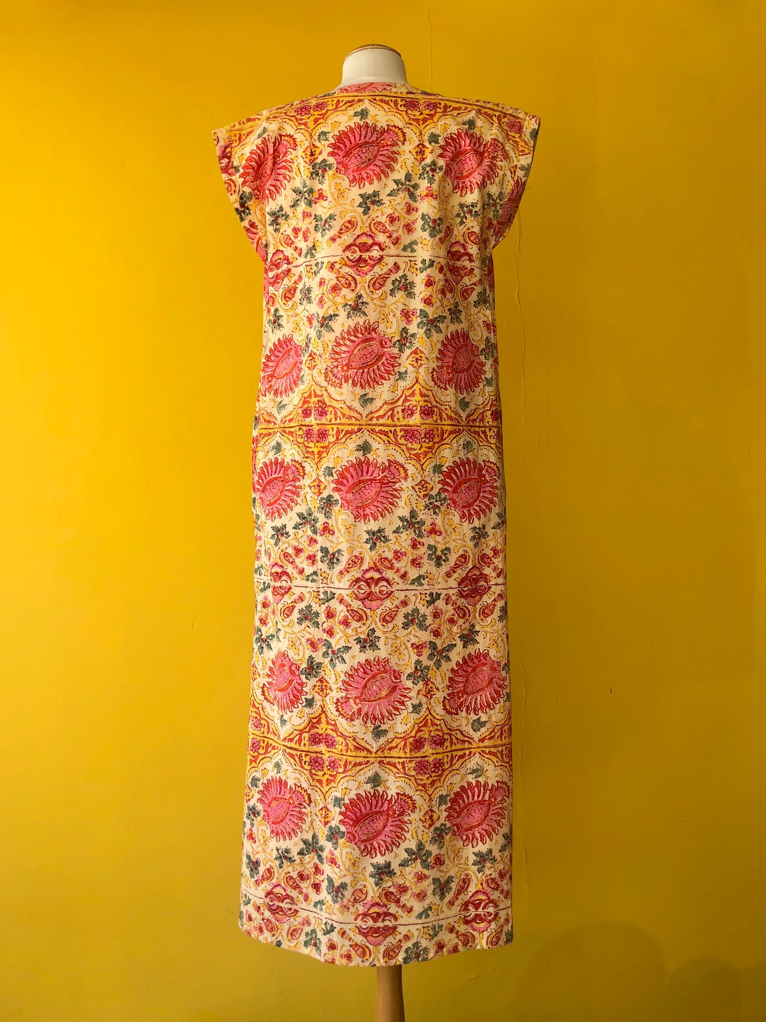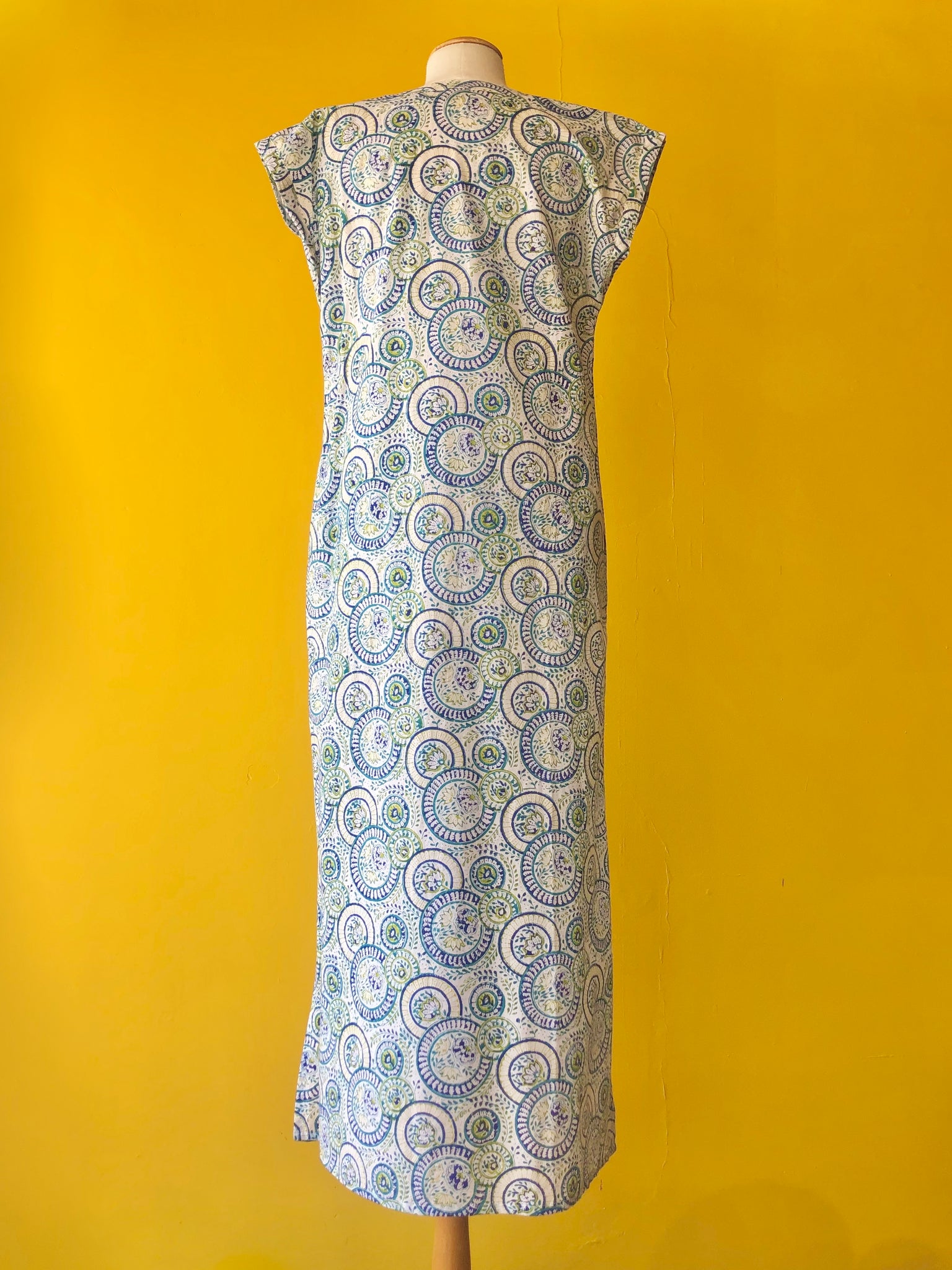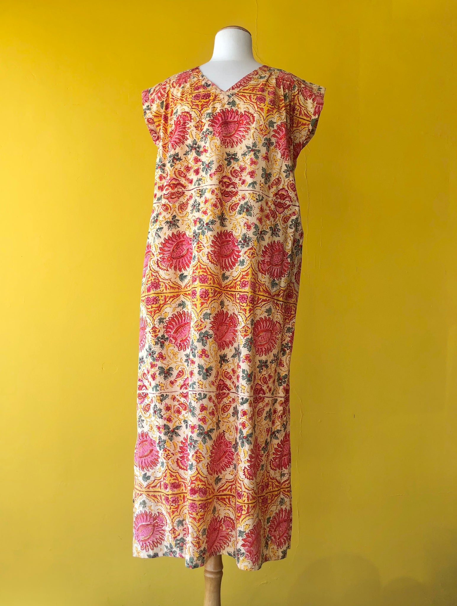 Full-length v-neck nightdress with shoulder pleating, two side pockets, and two bottom side slits.