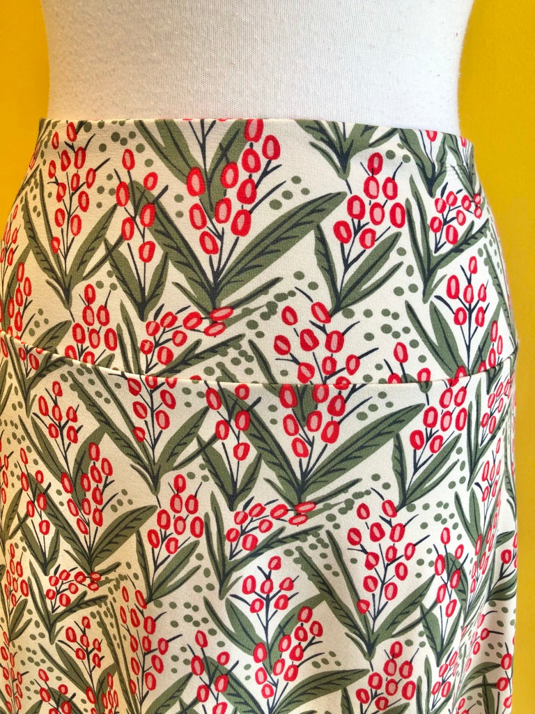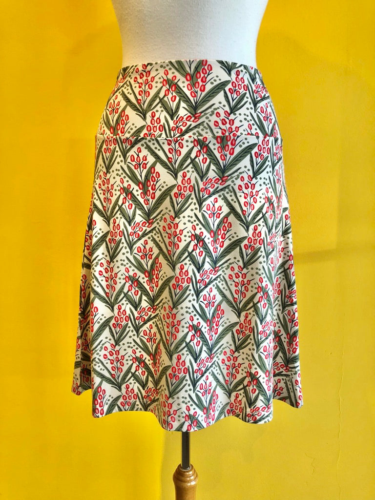Skirt with a wide waistband, a-line silhouette, and a bold wildflower pattern.