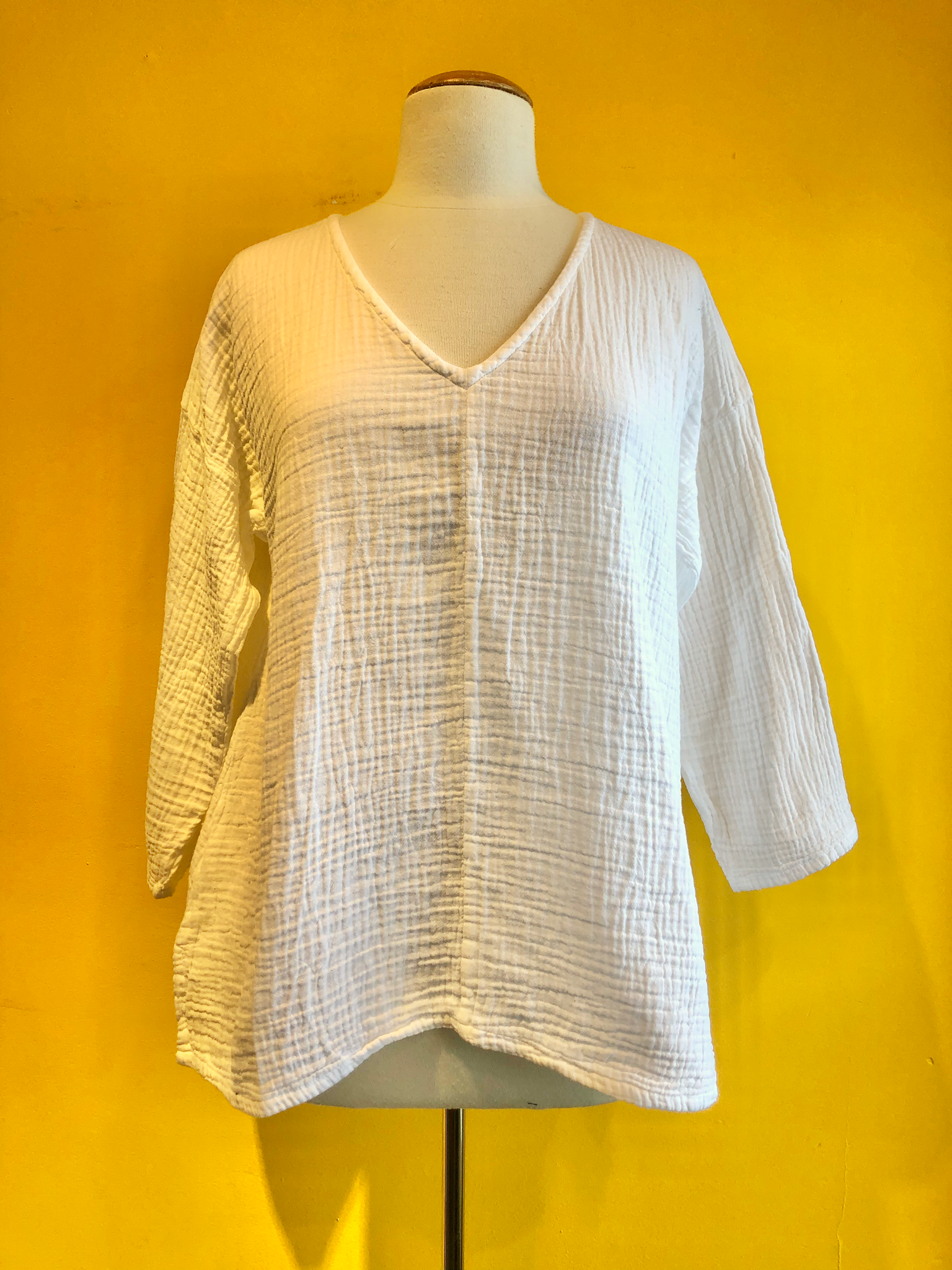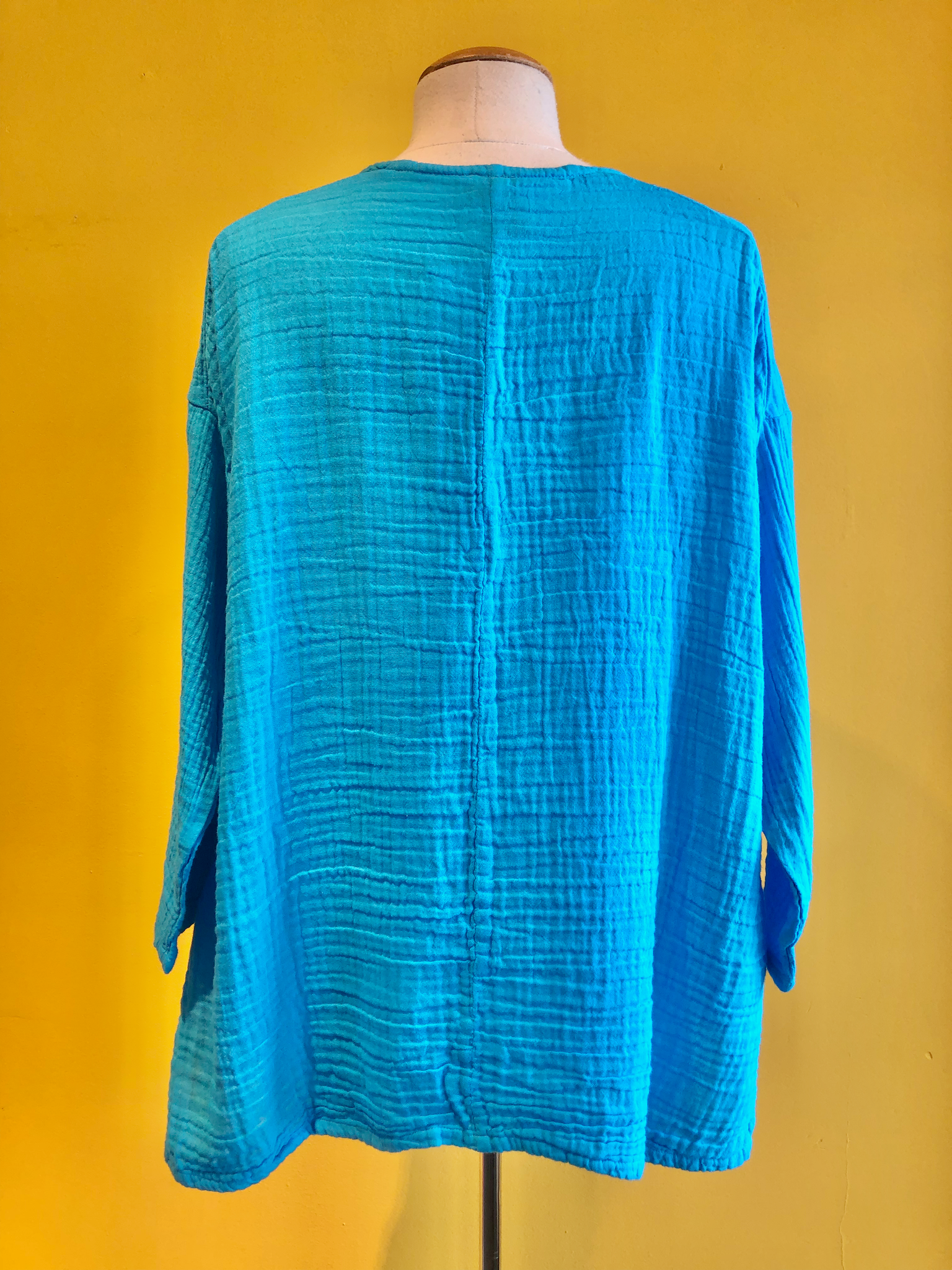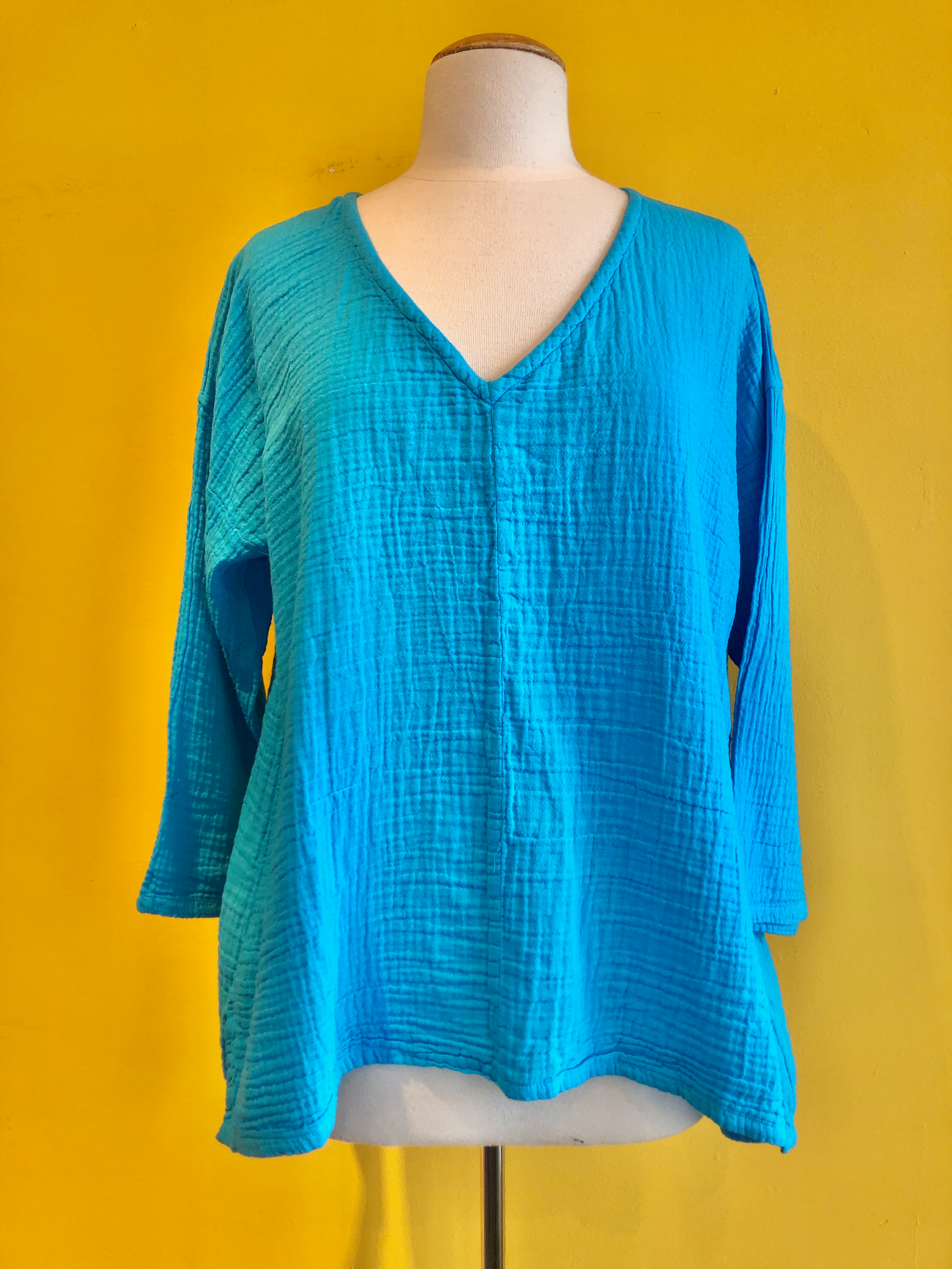 Long-sleeve flowy top with a v-neck, slight side split at the hem, and crinkle cotton fabric. Available in White or Ocean blue.