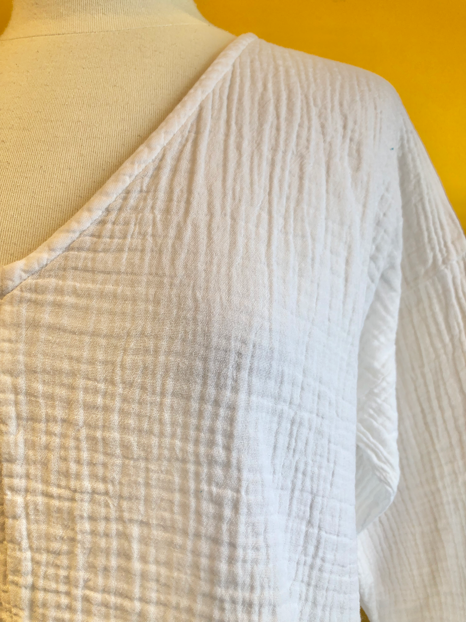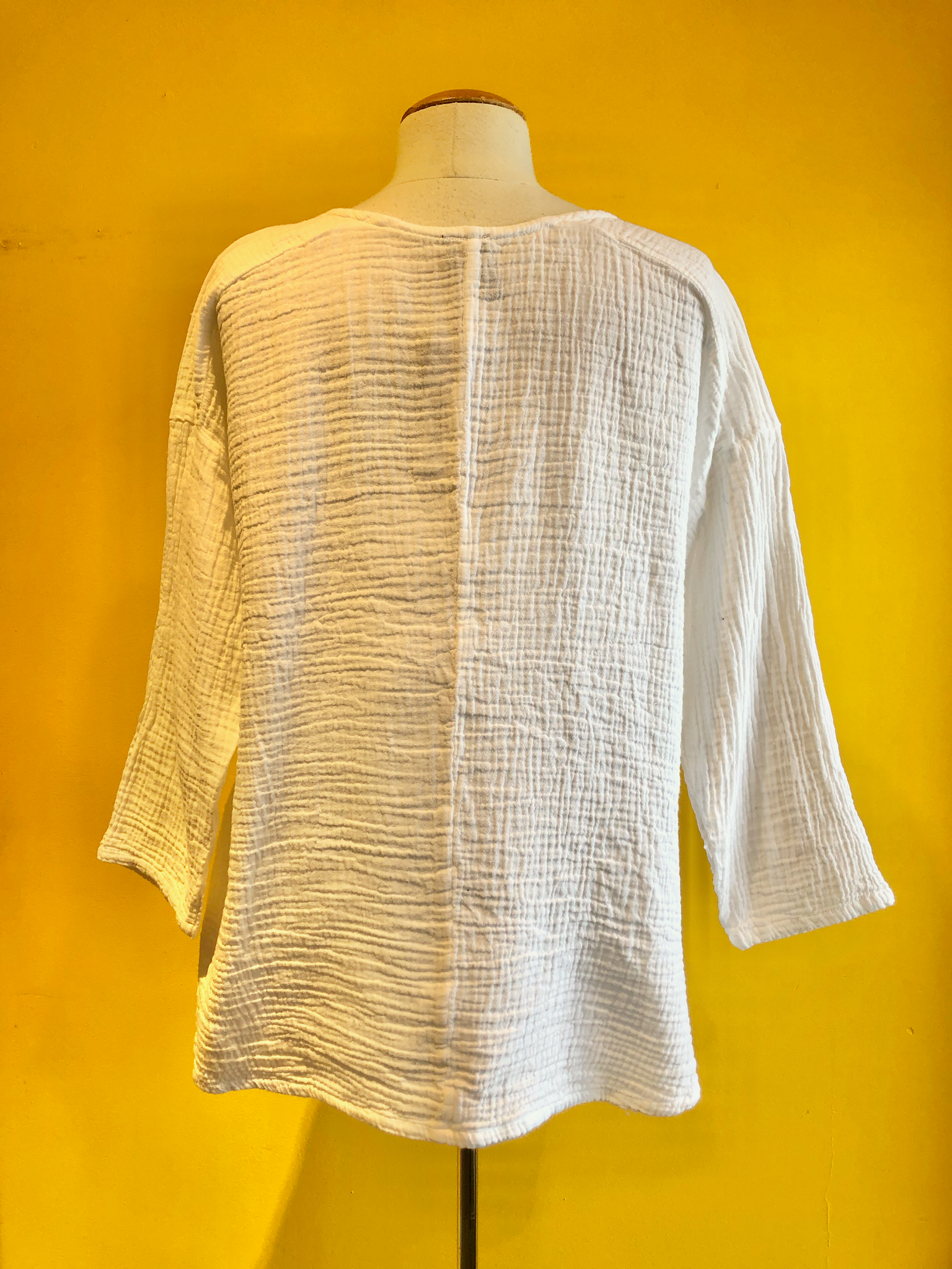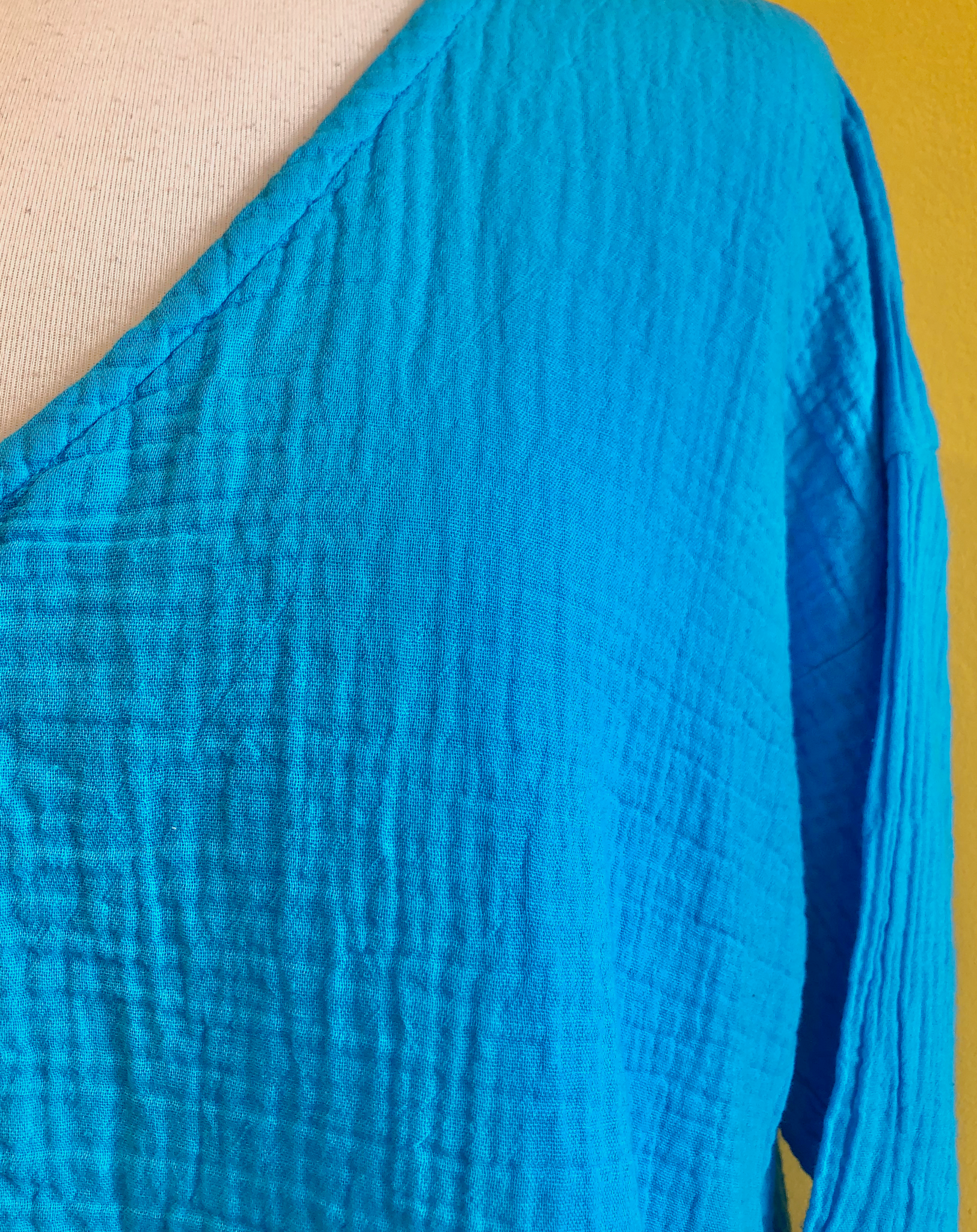 Long-sleeve flowy top with a v-neck, slight side split at the hem, and crinkle cotton fabric. Available in White or Ocean blue.