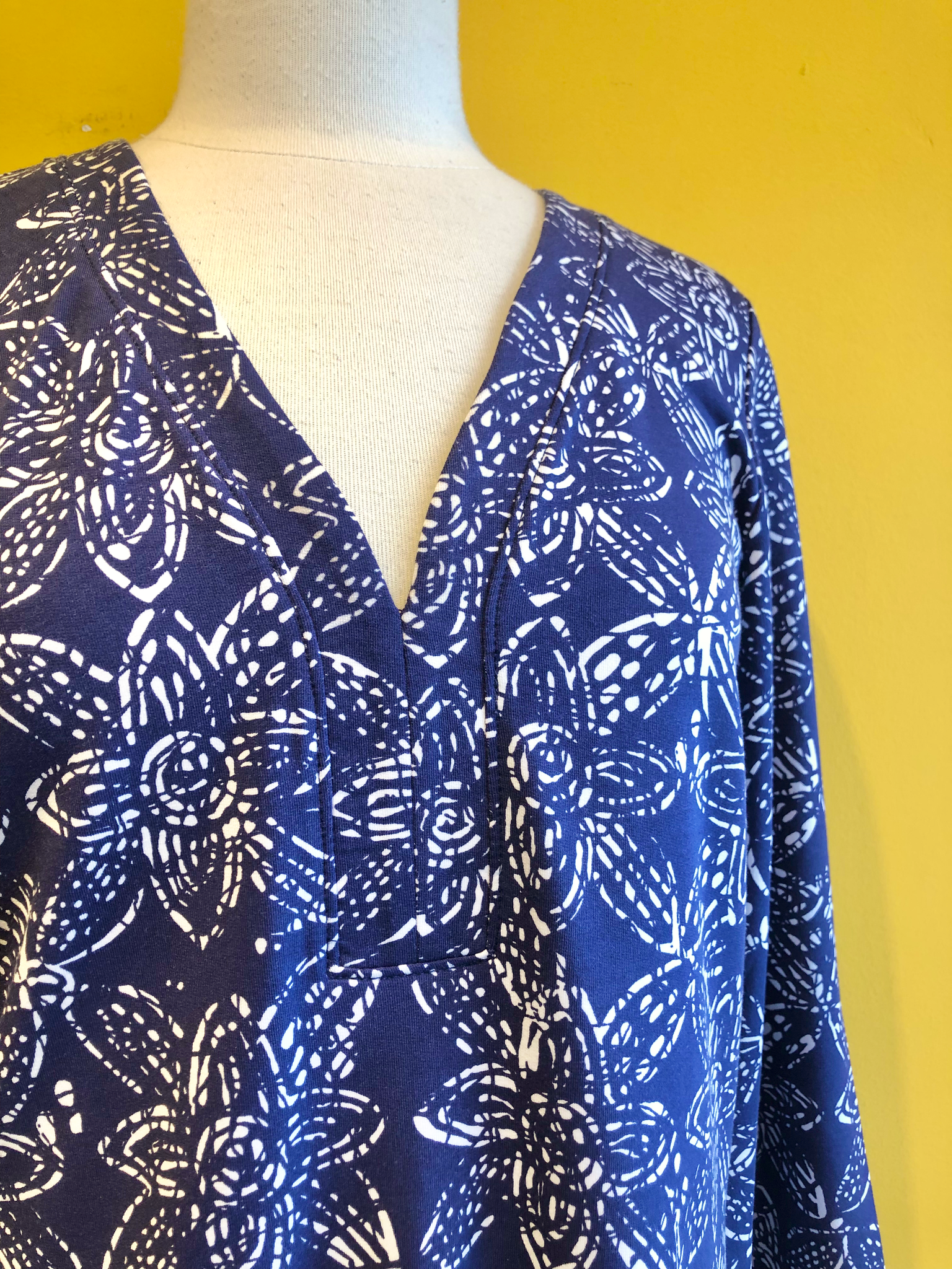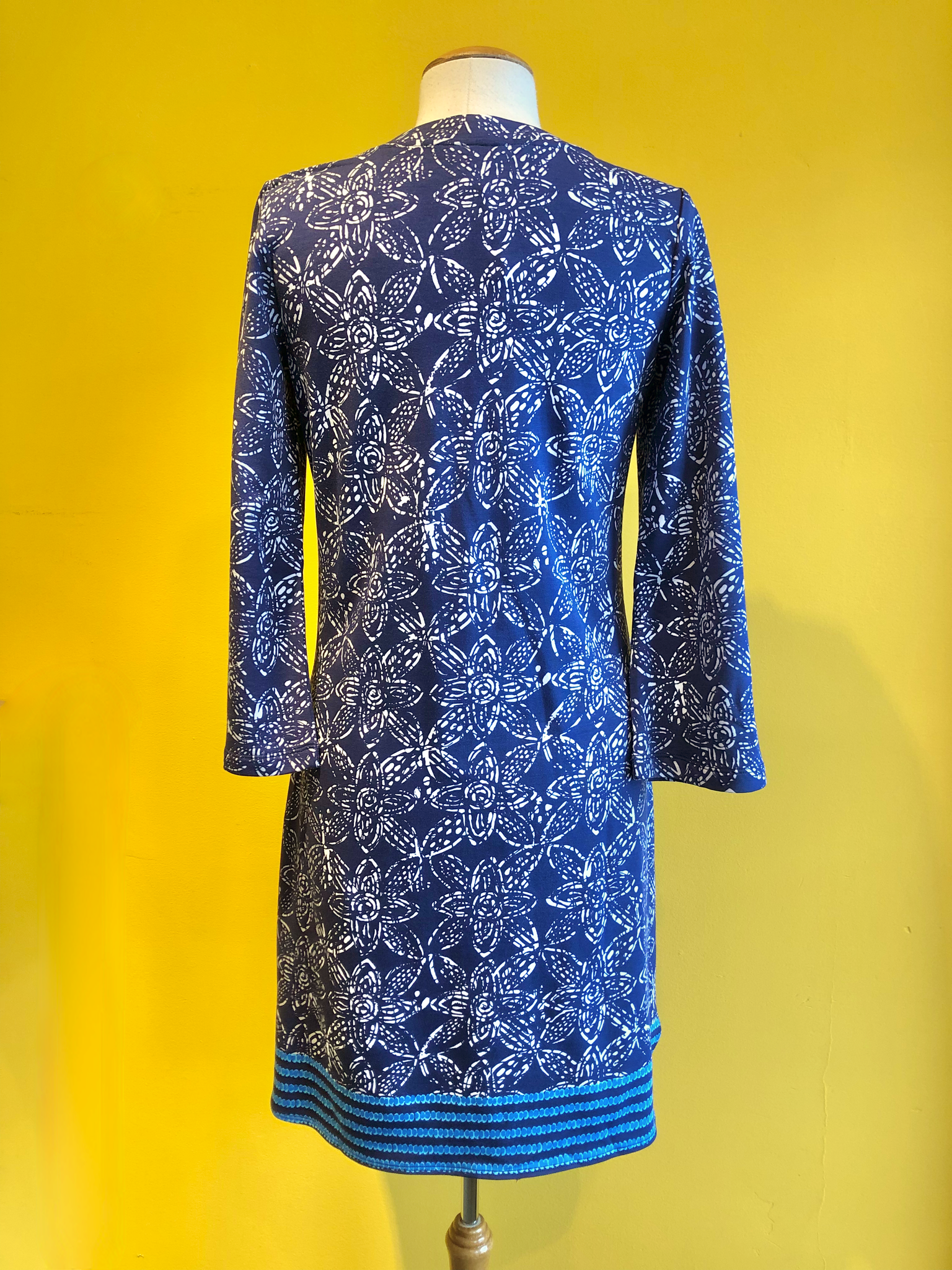 Long-sleeve dress with a v-neck and funky floral pattern.