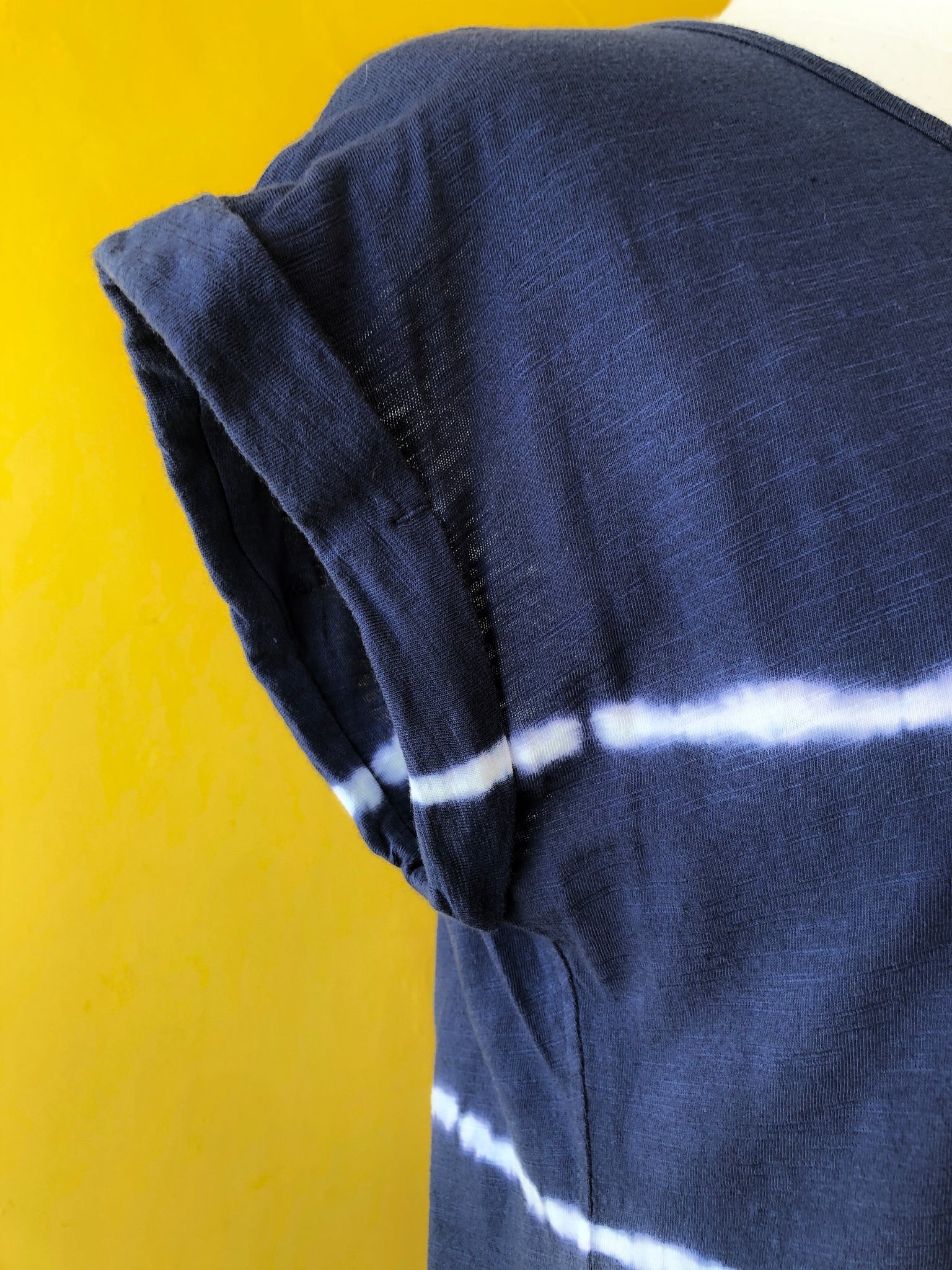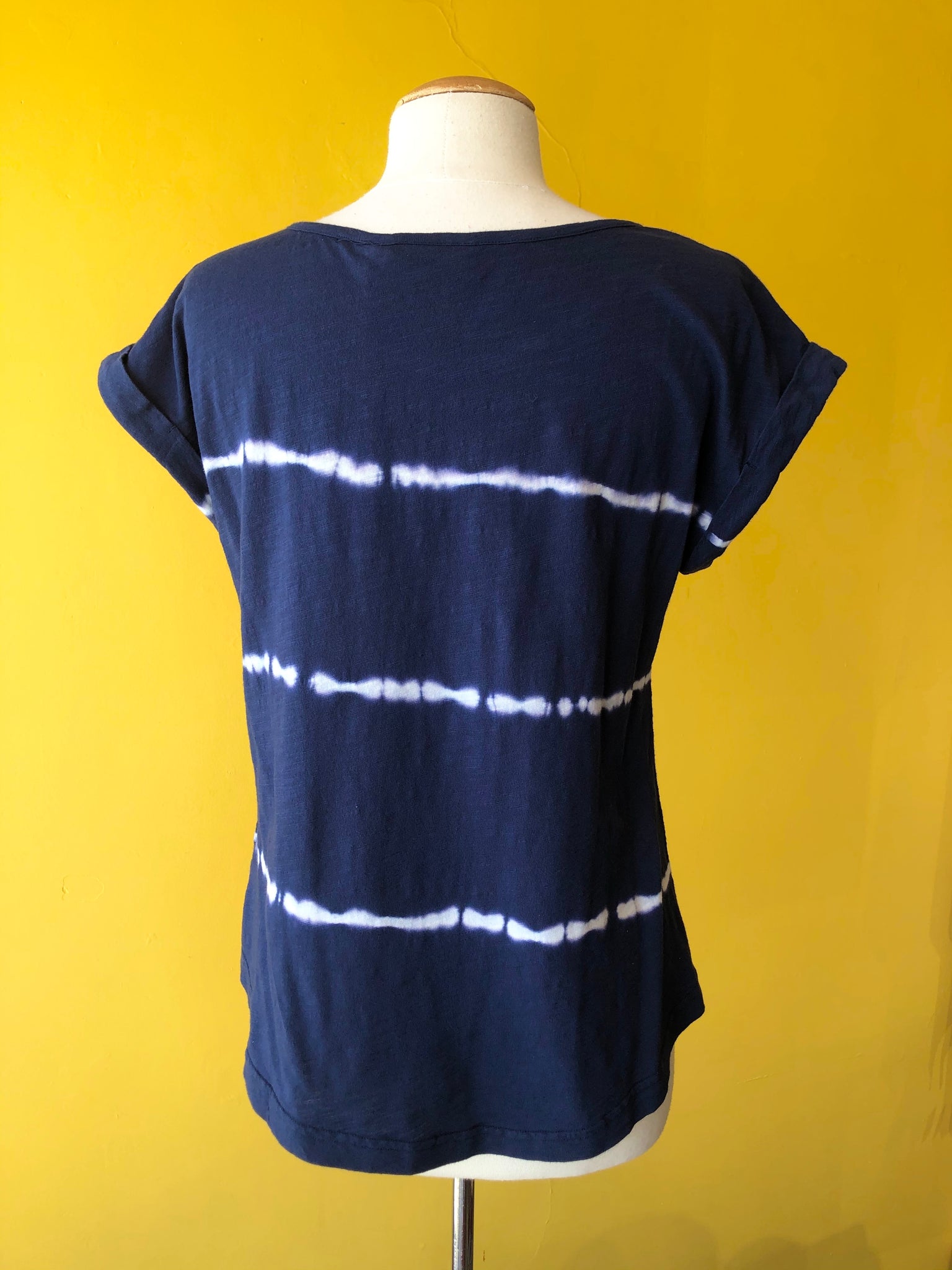 Tye-dyed striped navy short-sleeve scoop-neck T-shirt.