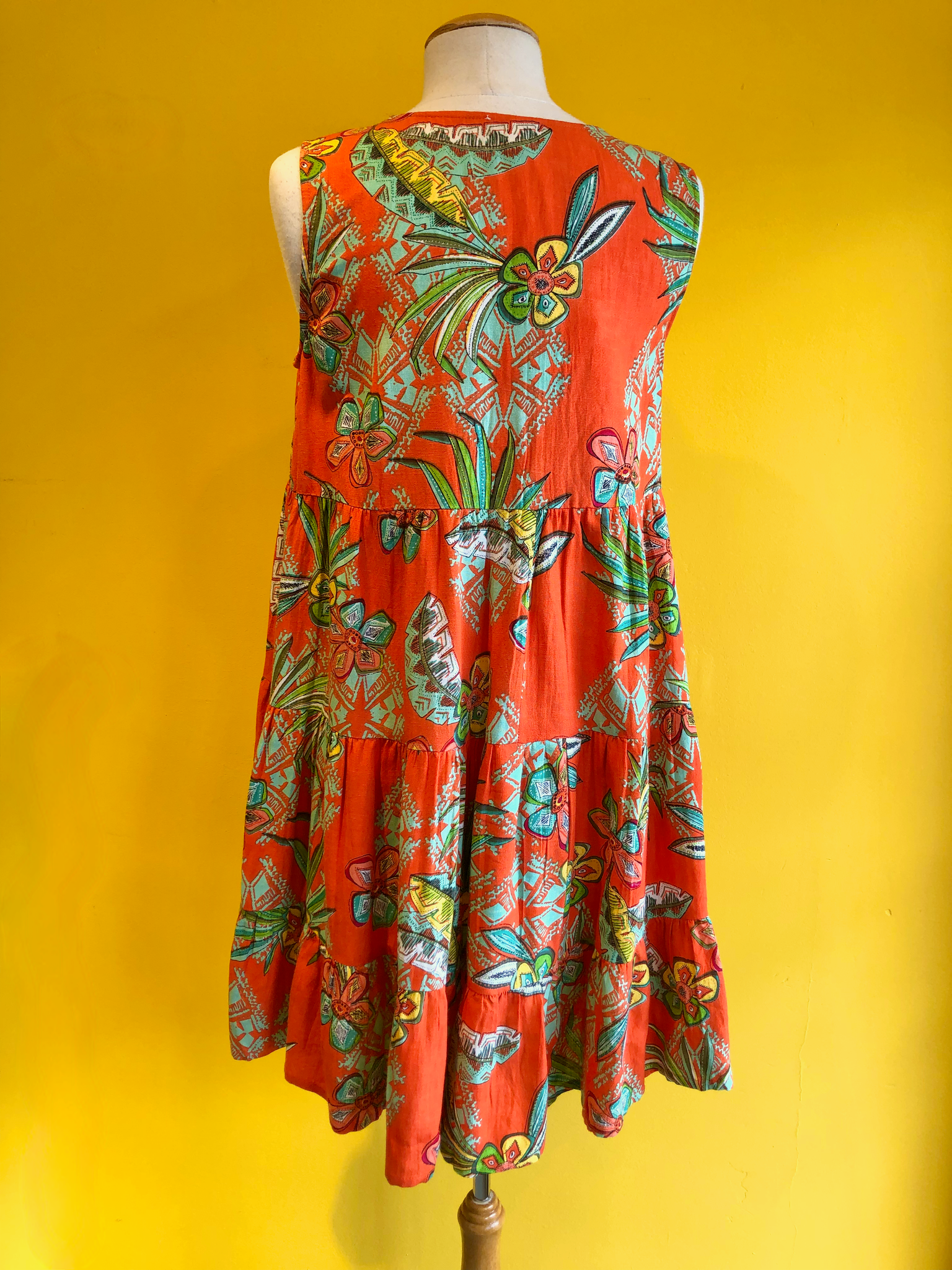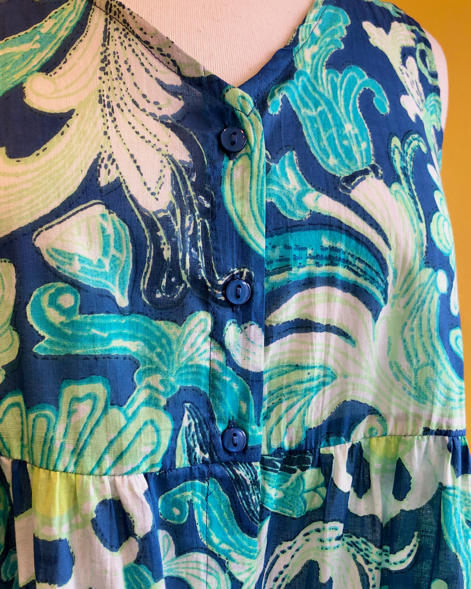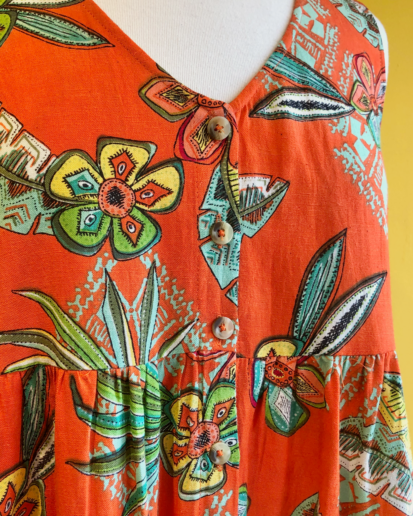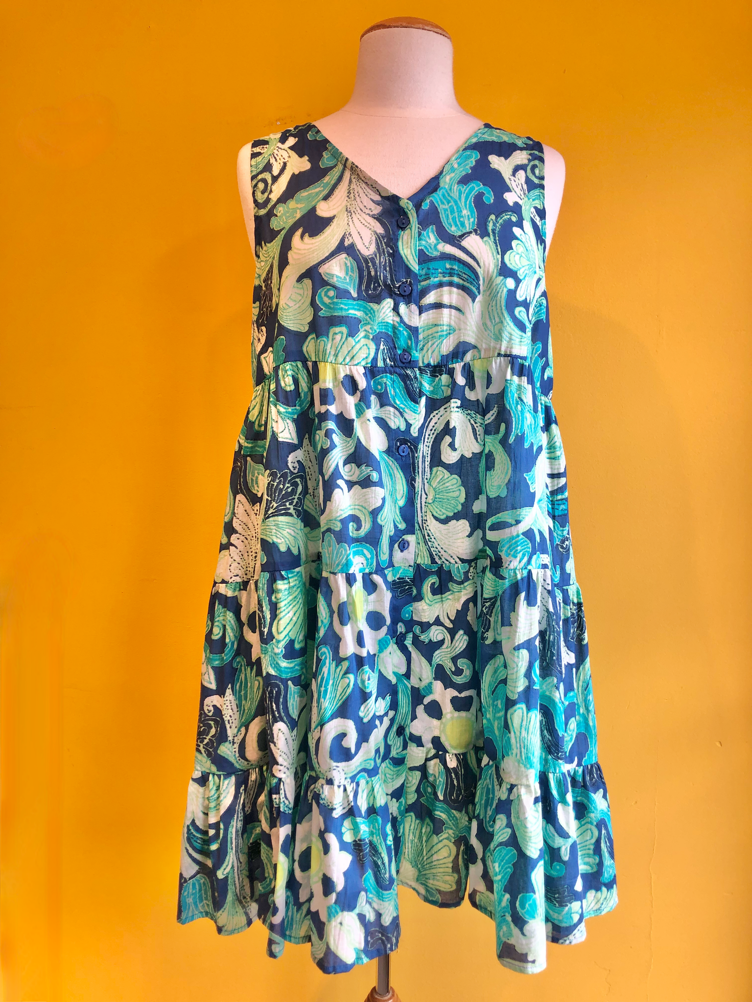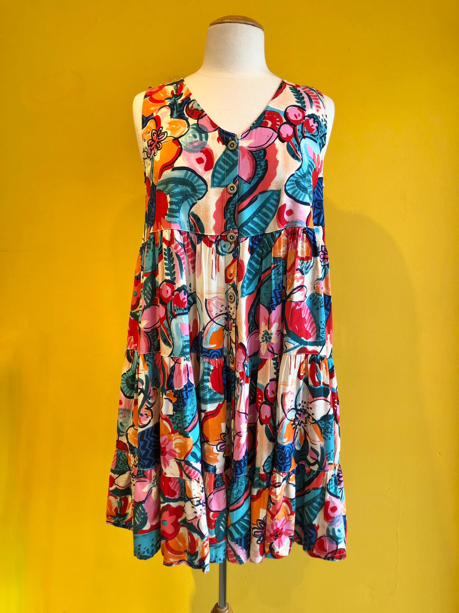 Sleeveless dress with a v-neck and button-up style.