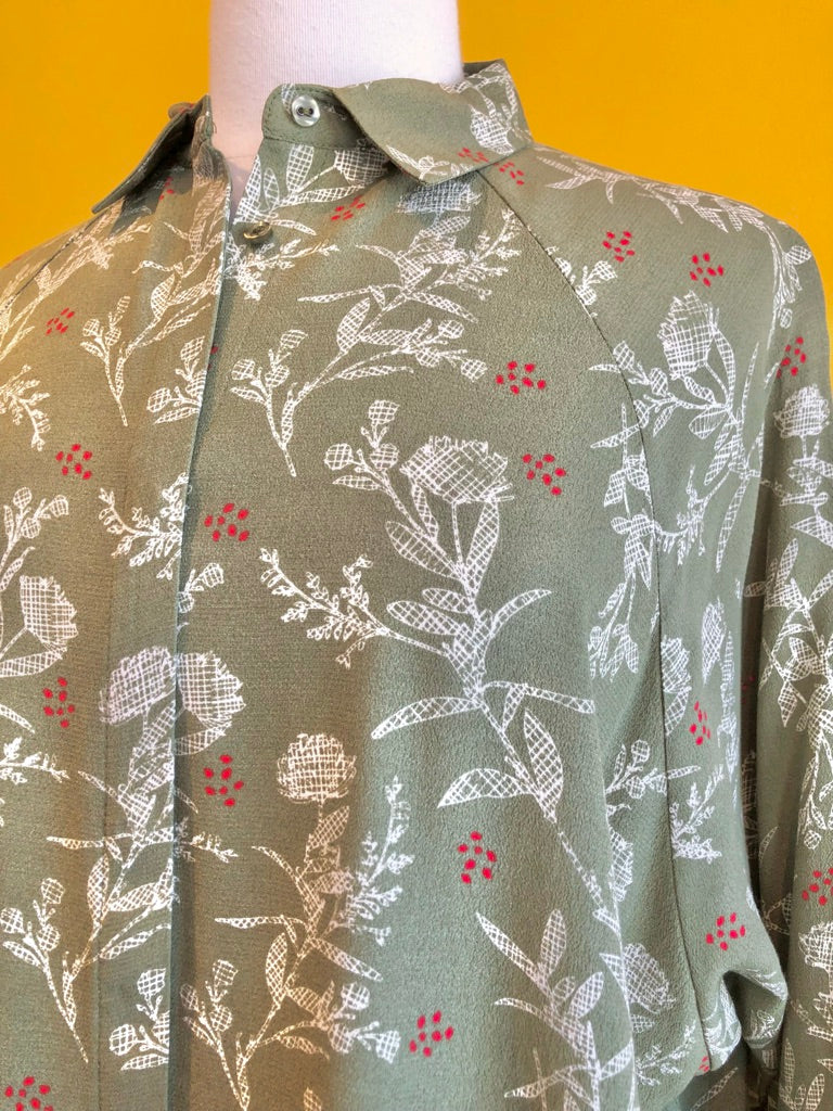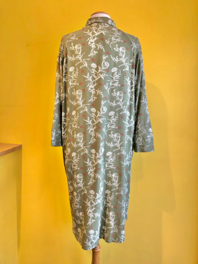 Button-up dress with a collar, long sleeves, pockets, and a soft moss green and white pattern with red accents.