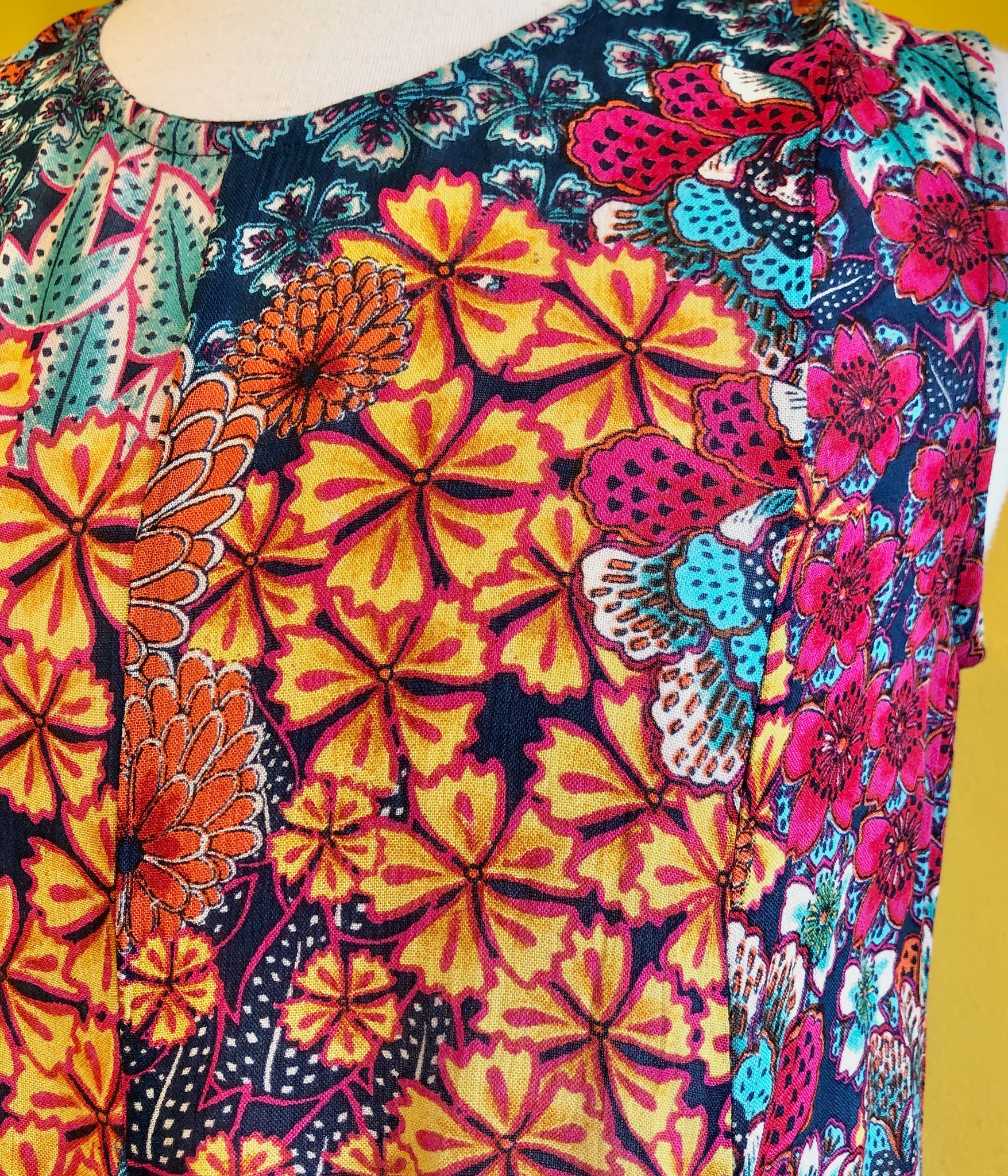 Sleeveless dress with a scoop neck, tie at the waist, and two side pockets.
