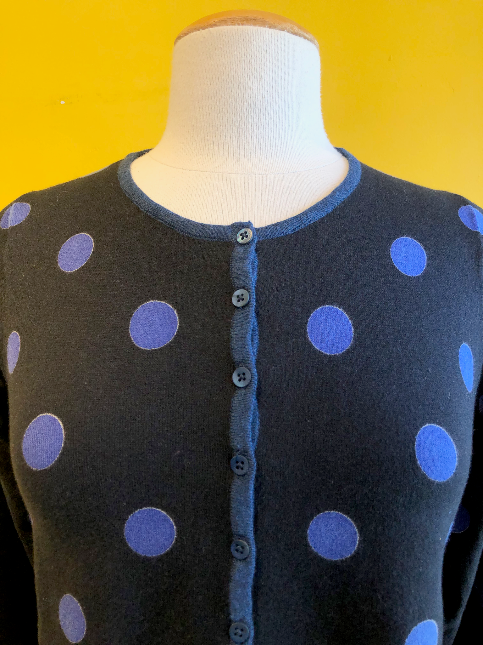 Black button-up sweater with a round neck, long-sleeves, and small side slits at the hem, and a blue polka dot pattern.