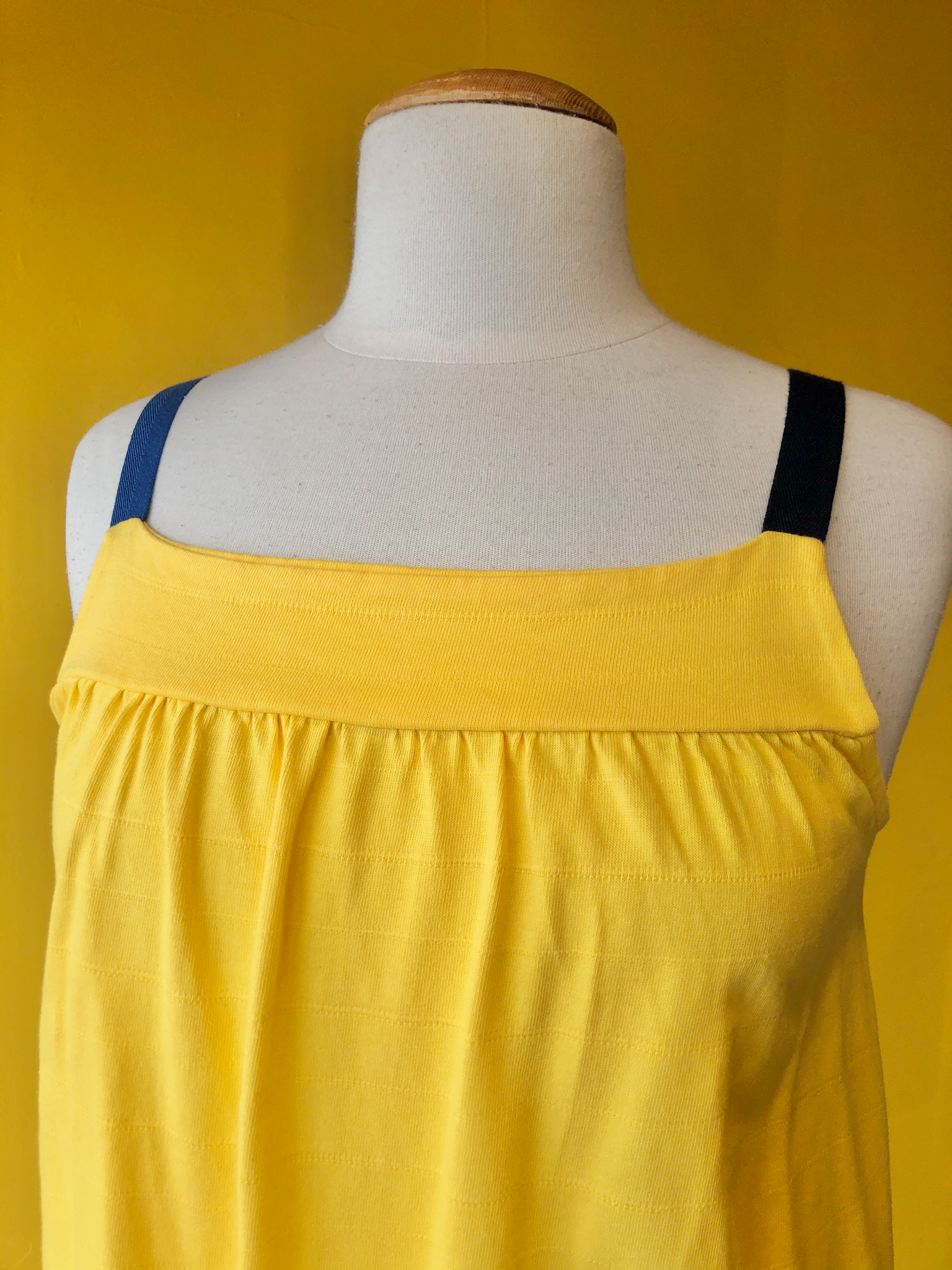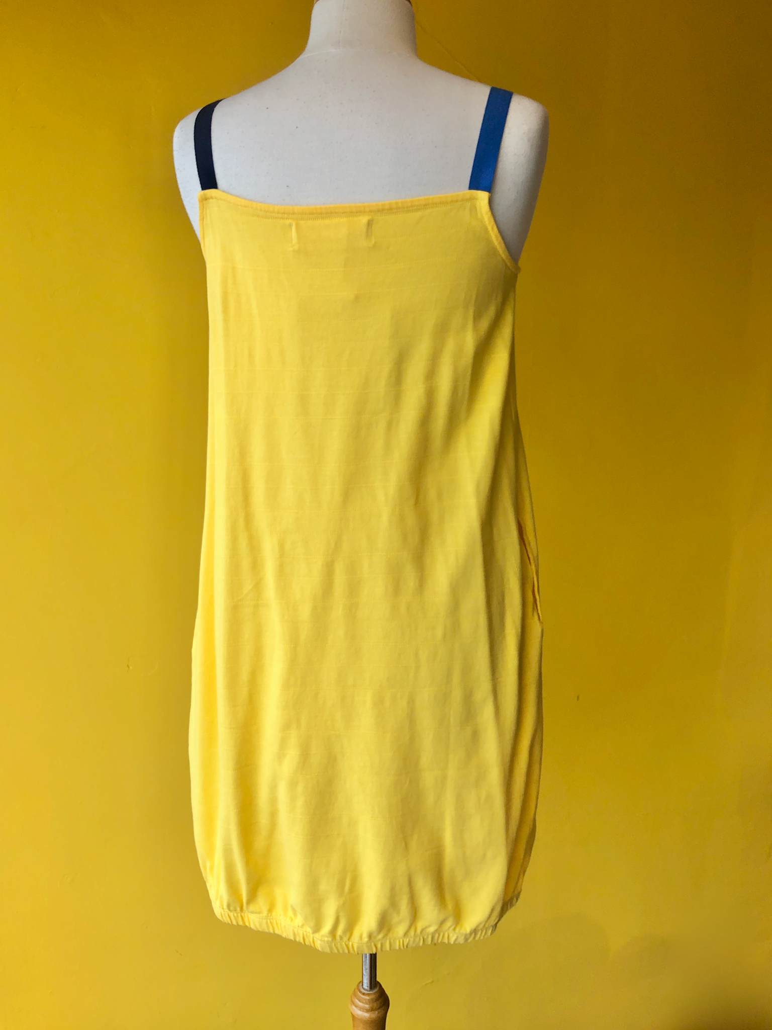 Yellow camisole bubble dress with mismatched straps (blue + navy), two side pockets, and an elastic hem.