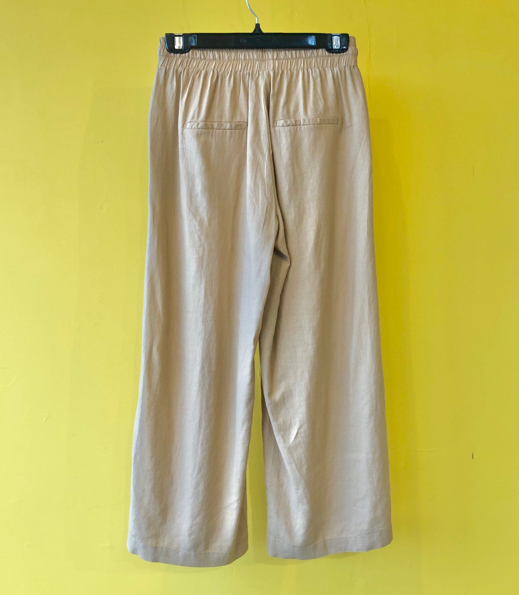 Cropped pant with a drawstring/elastic waistband, front pockets, and wide leg design