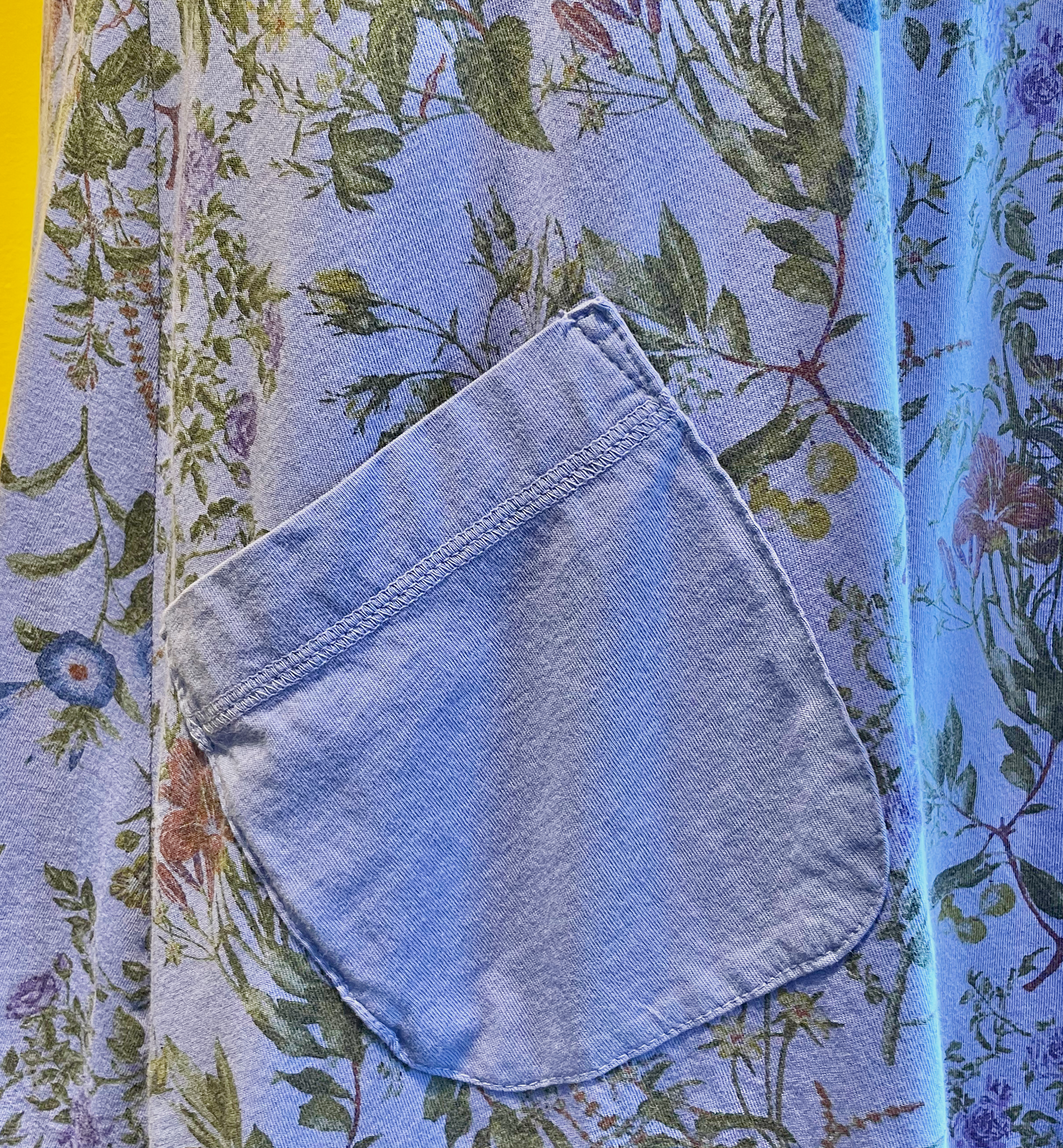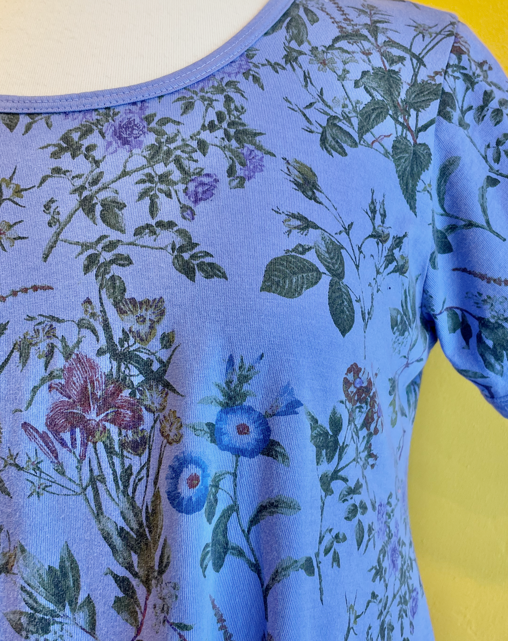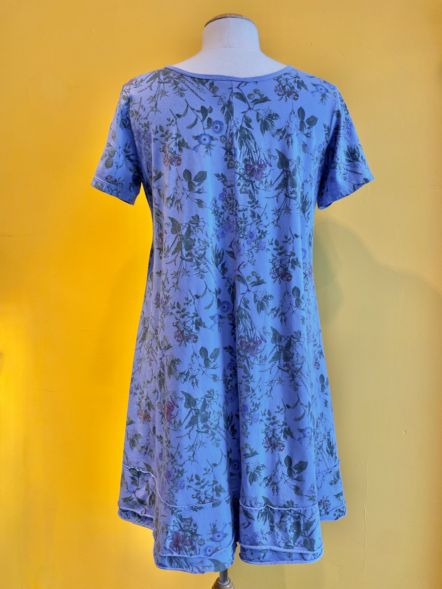 Cotton t-shirt dress with a scoop neck, short sleeves, and a ruffly bottom hem.