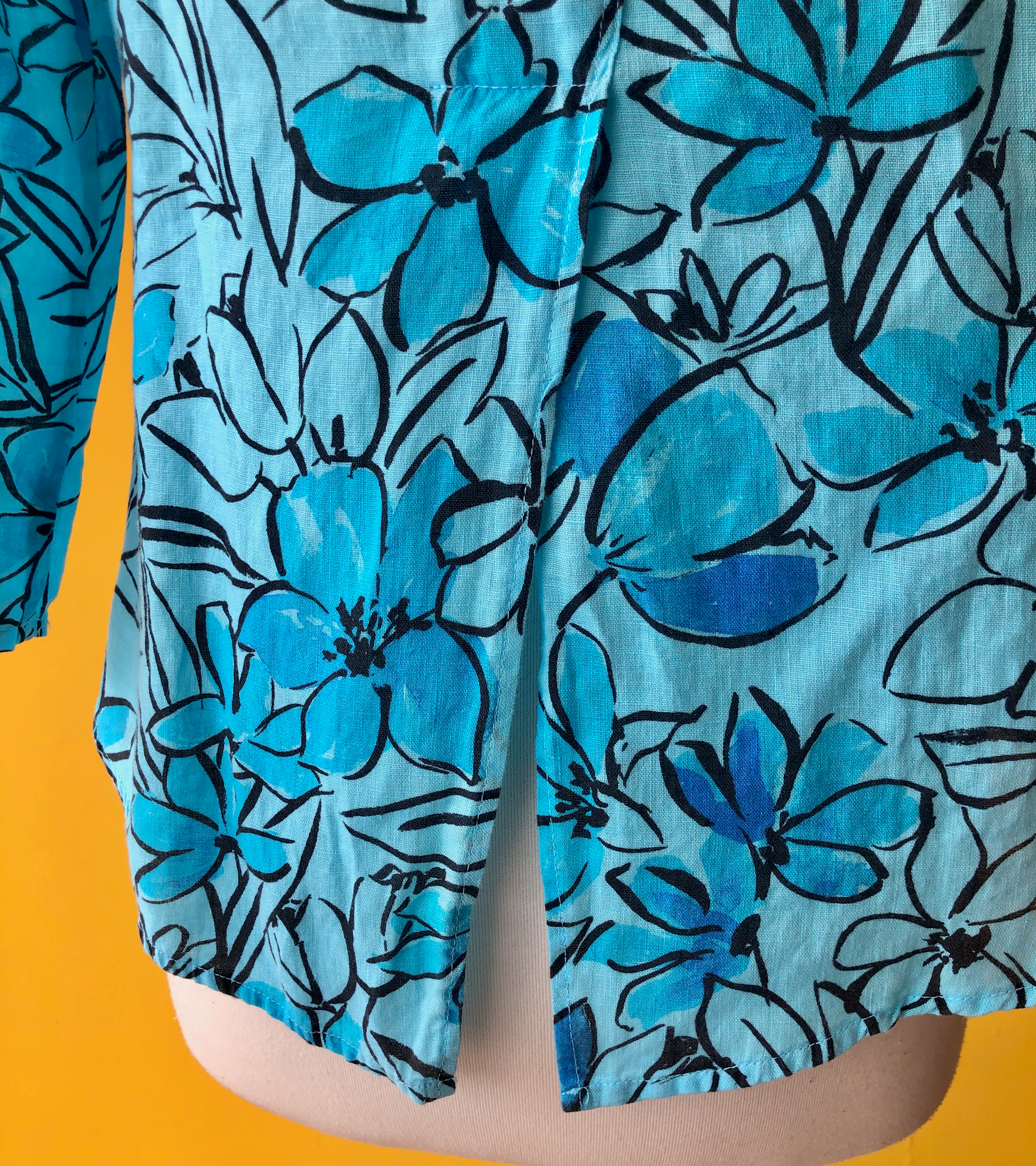 Linen scoop neck shirt with 3/4 sleeves and back slit detail. Floral Splash print on Aquarius.