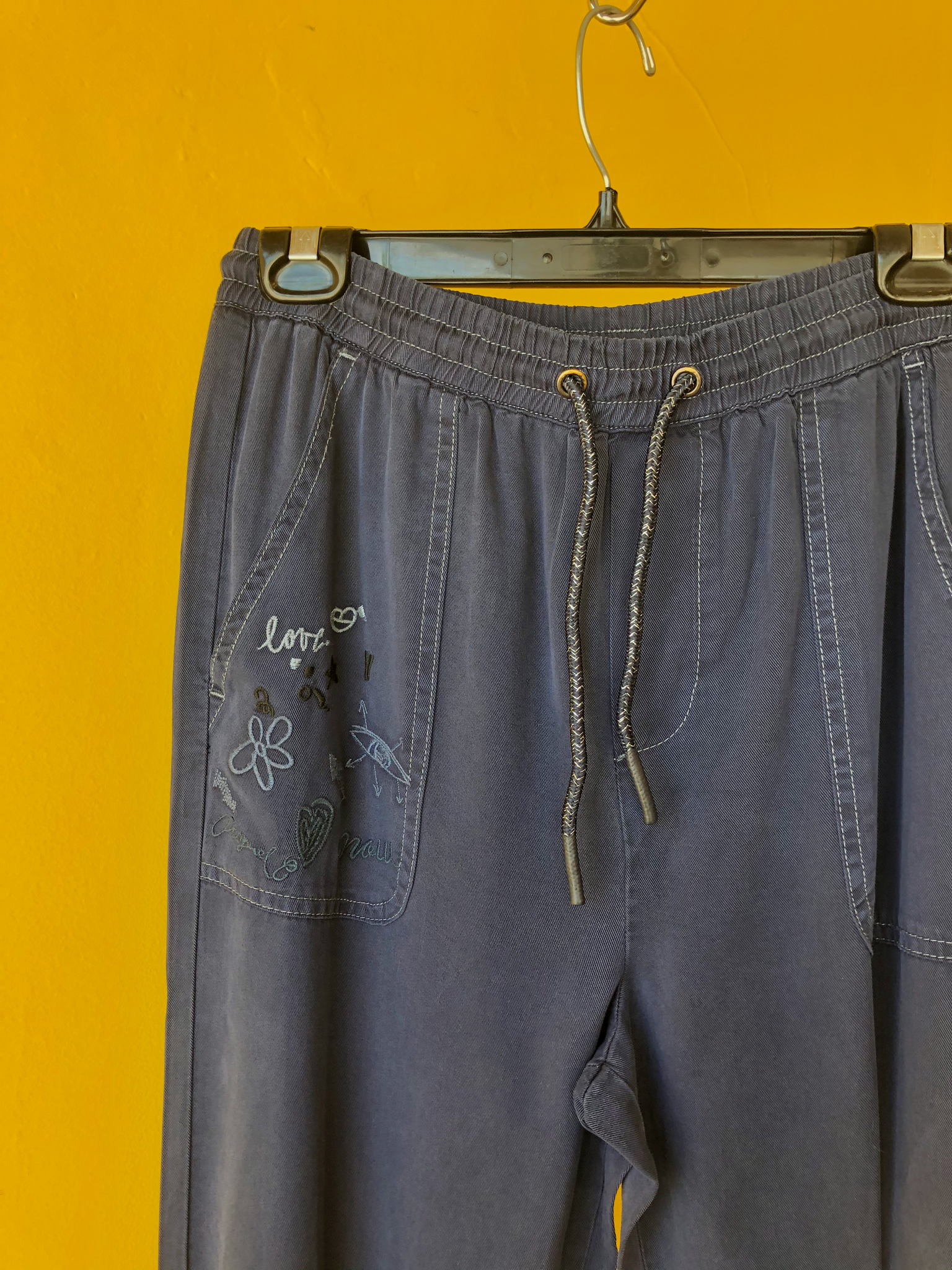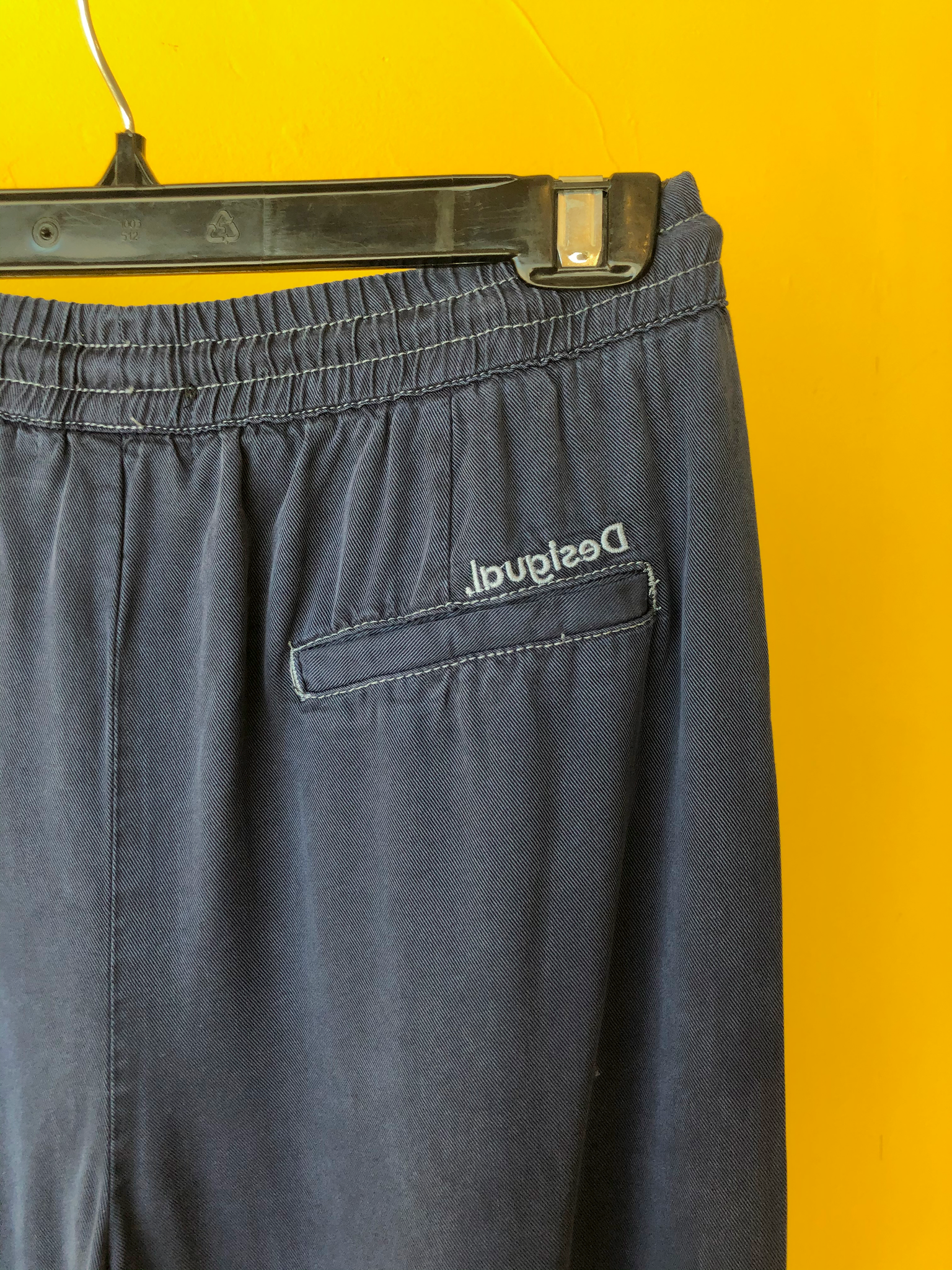 Navy jogger style pants with an elastic and drawcord waist, elastic bottom hem, two front pockets, and one back pocket.