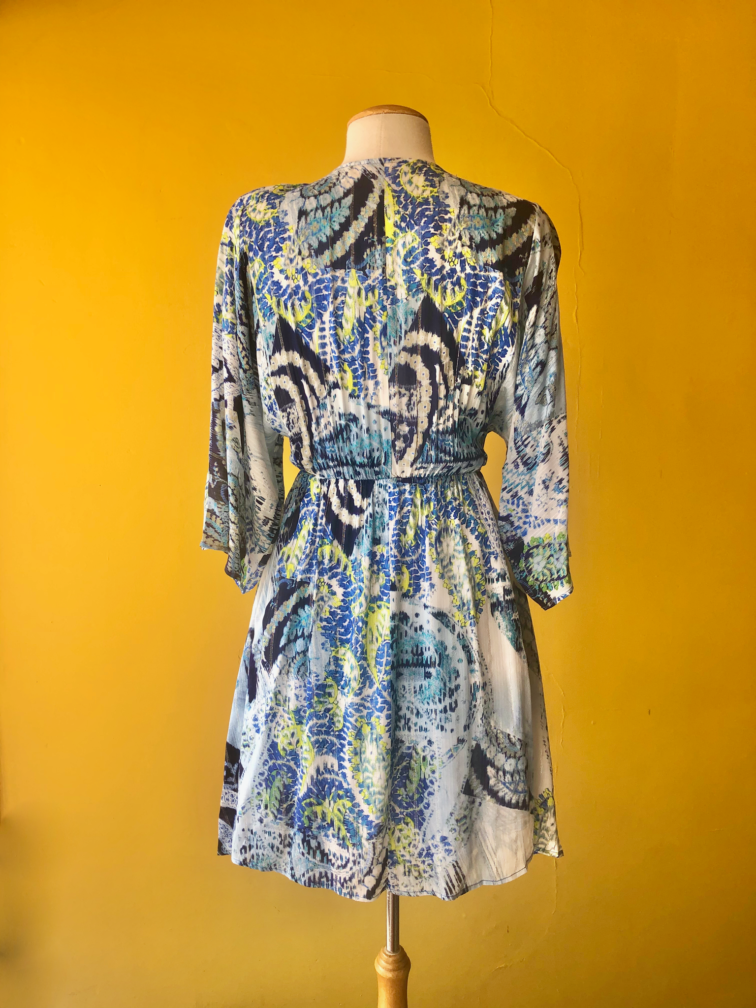 Blue, white, and green patterned dress with flowy 3/4 length sleeves, a v-neck, elastic waistband, inner slip for skirt, and subtle metallic stripe detailing. Super light and flowy.