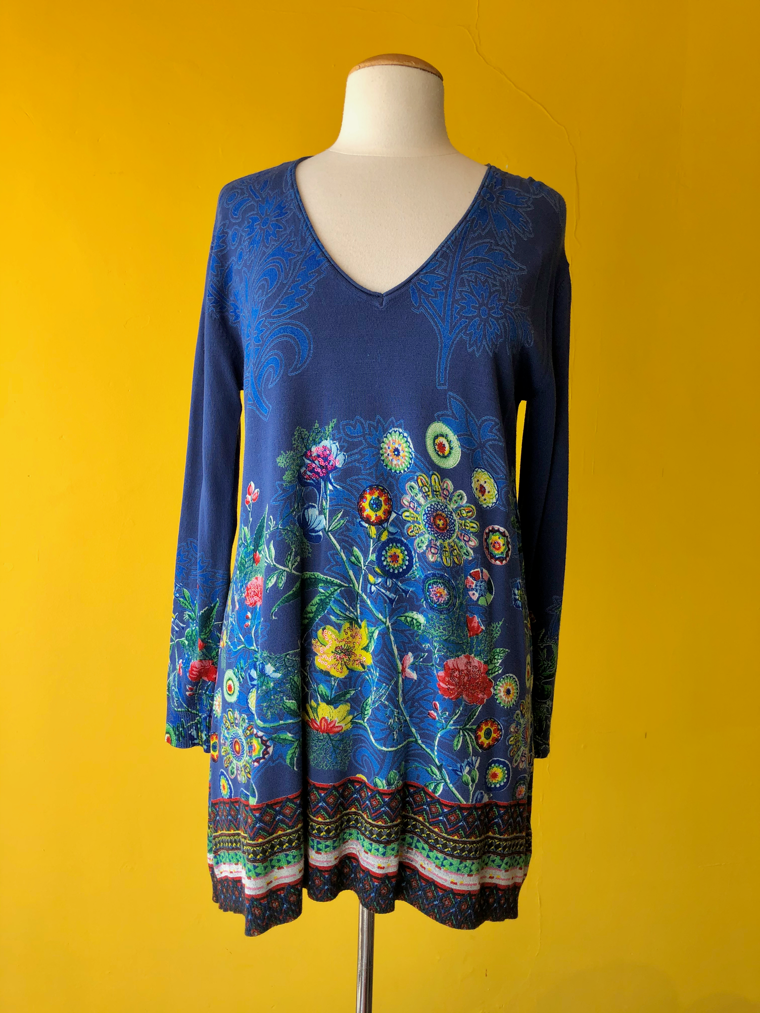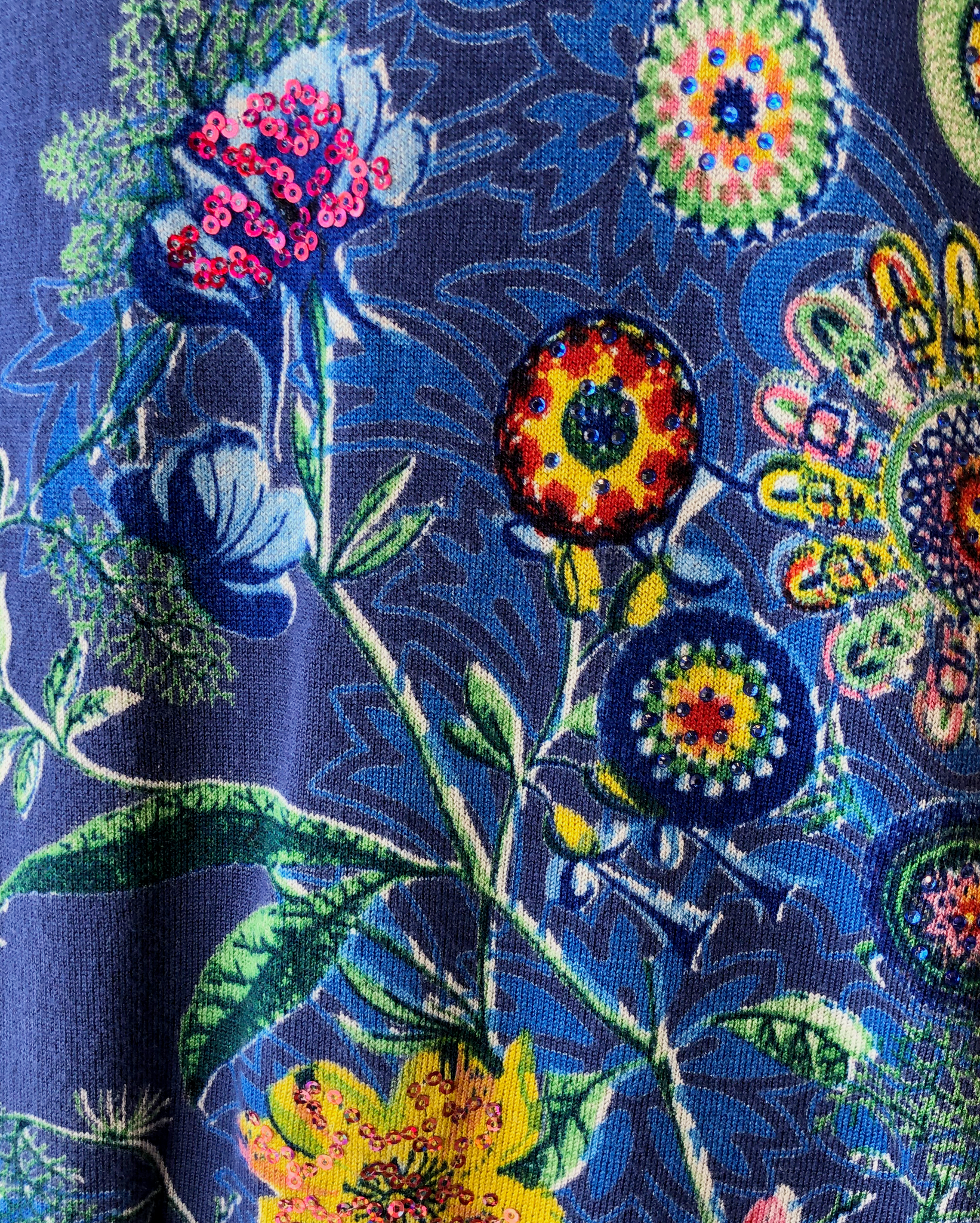 Blue v-neck sweater dress with a subtly sequined and rhinestoned colourful garden pattern.