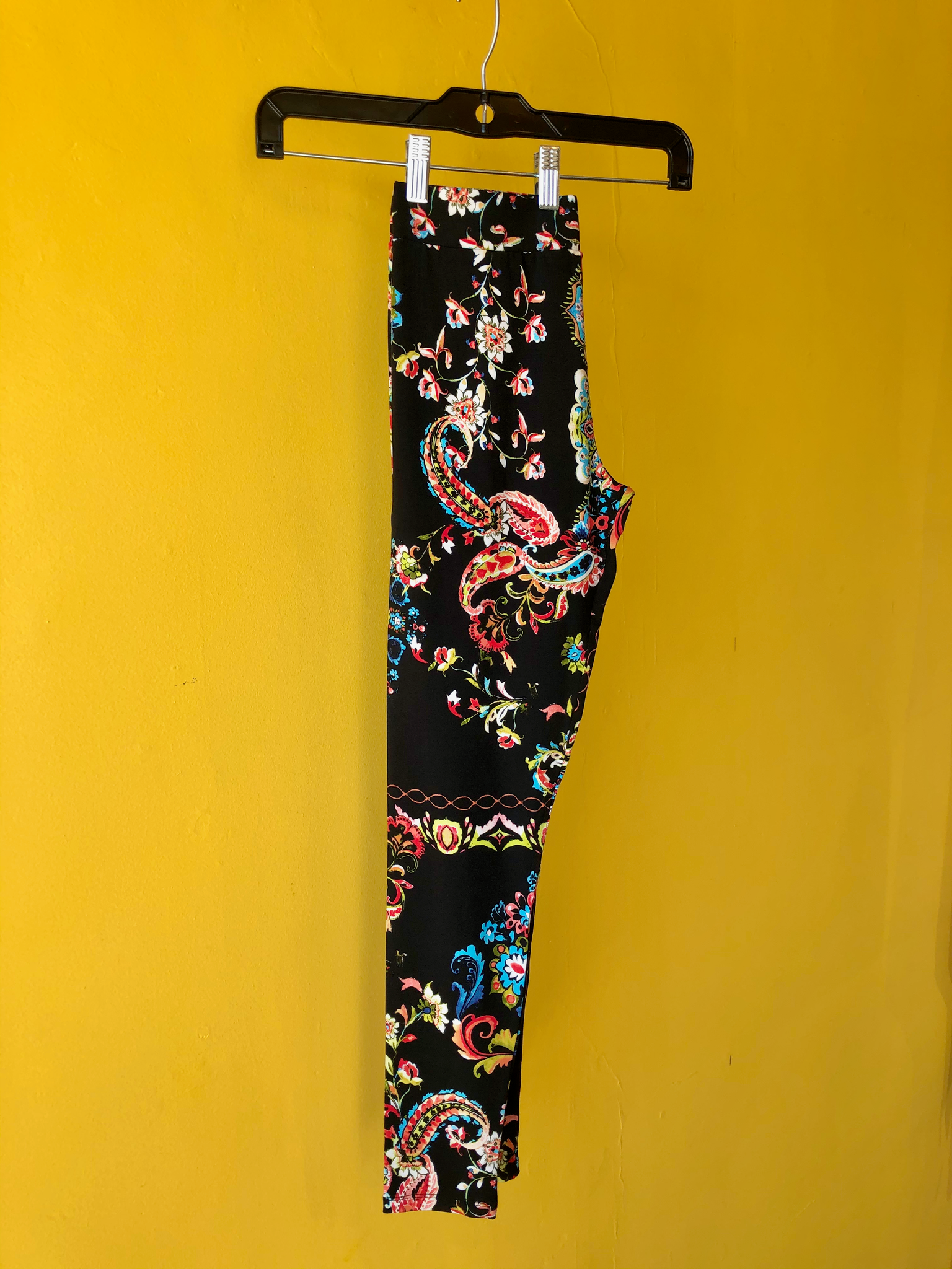 Black floral leggings with a wide (1.5 inches) elastic waistband. Super soft and stretchy.