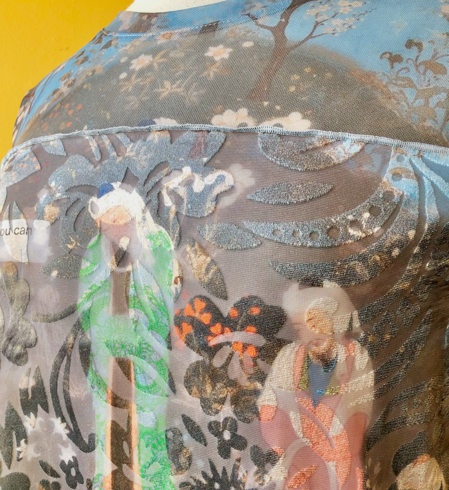 Mesh long sleeve printed shirt with raised velvet pattern.