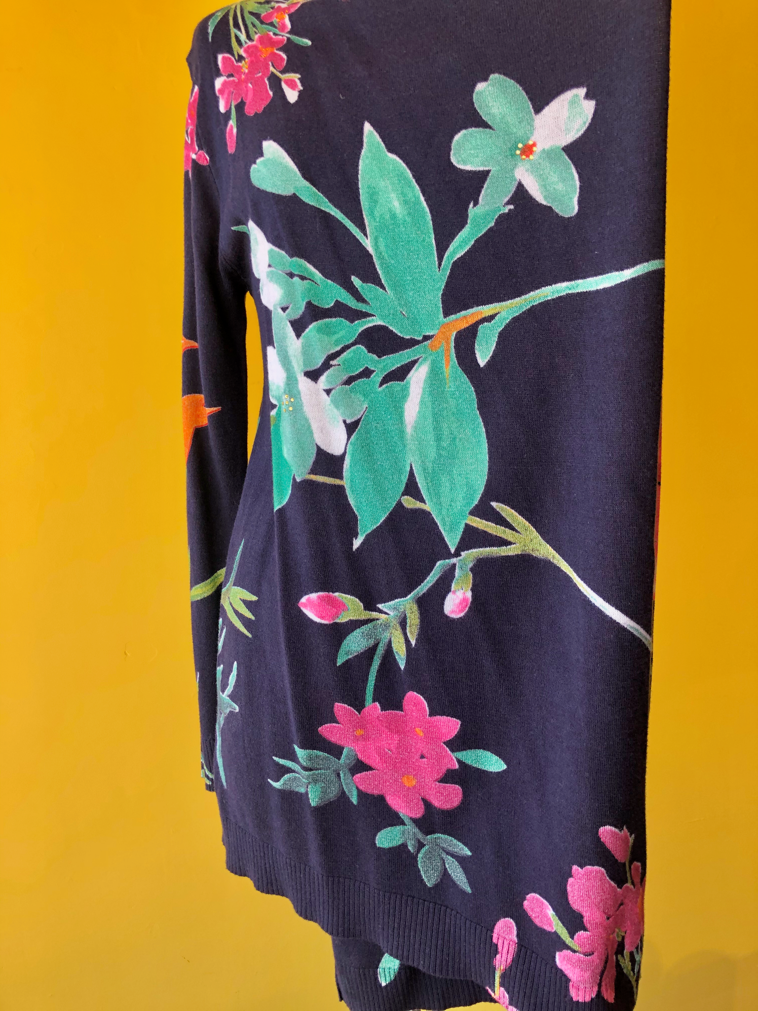 Open-front navy floral cardigan with long sleeves and subtle rhinestone detailing.