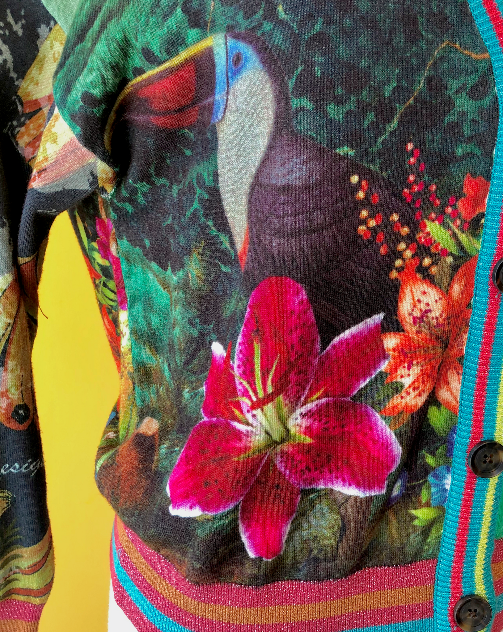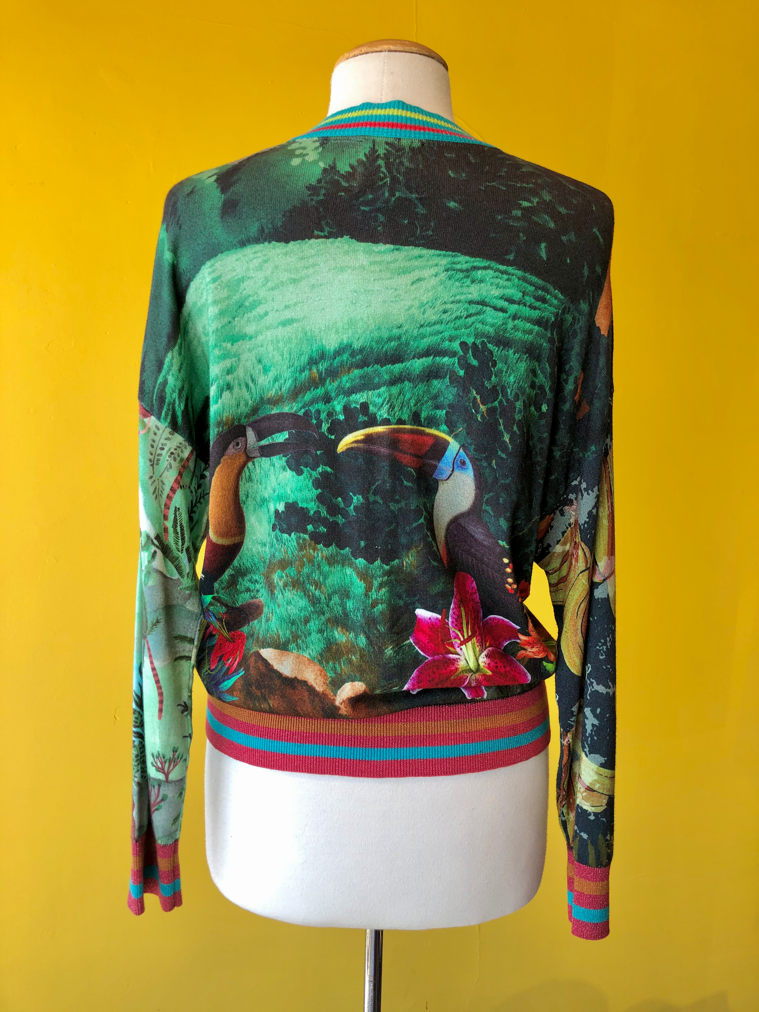 Button-up cardigan with forest / toucan print, super soft and stretchy.