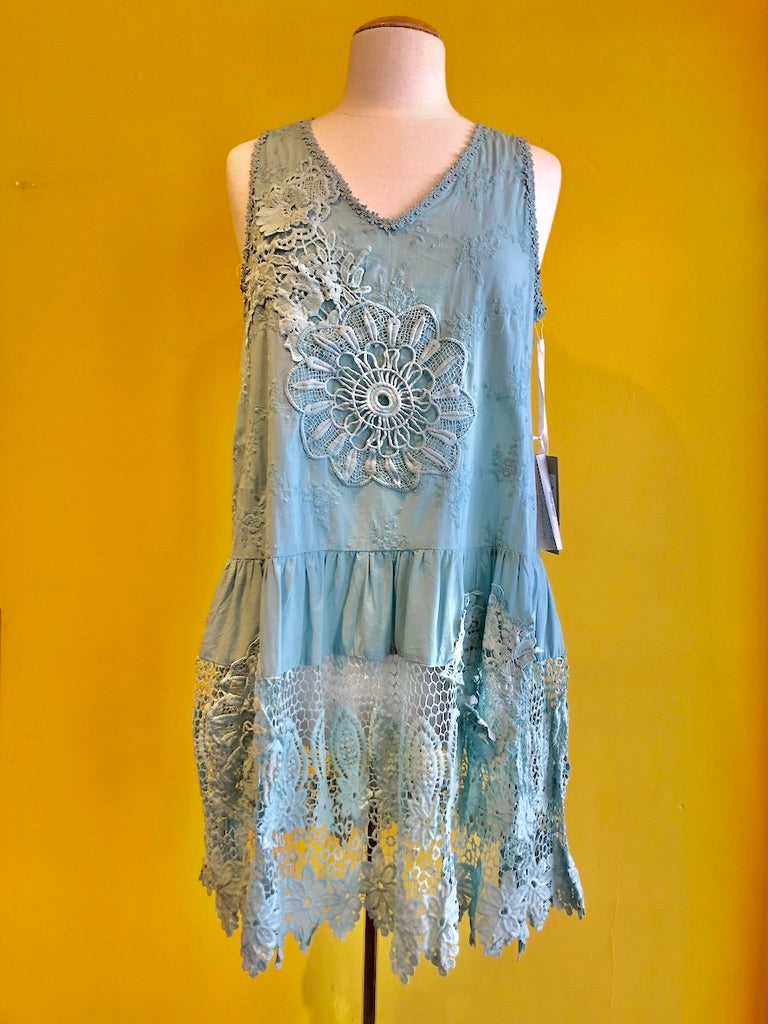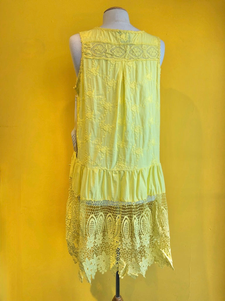 Sleeveless dress with a v-neck, floral cut-out embroidery detailing, and sheer lacework skirt. We recommend wearing with a slip if you are looking for a non-sheer look.