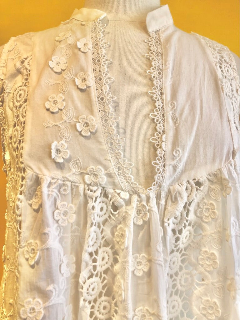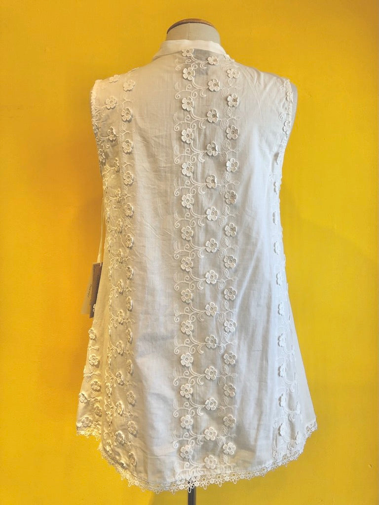 Sleeveless top with a v-neck and mock collar, floral cut-out embroidery detailing, and sheer lacework body. We recommend wearing with a slip if you are looking for a non-sheer look.