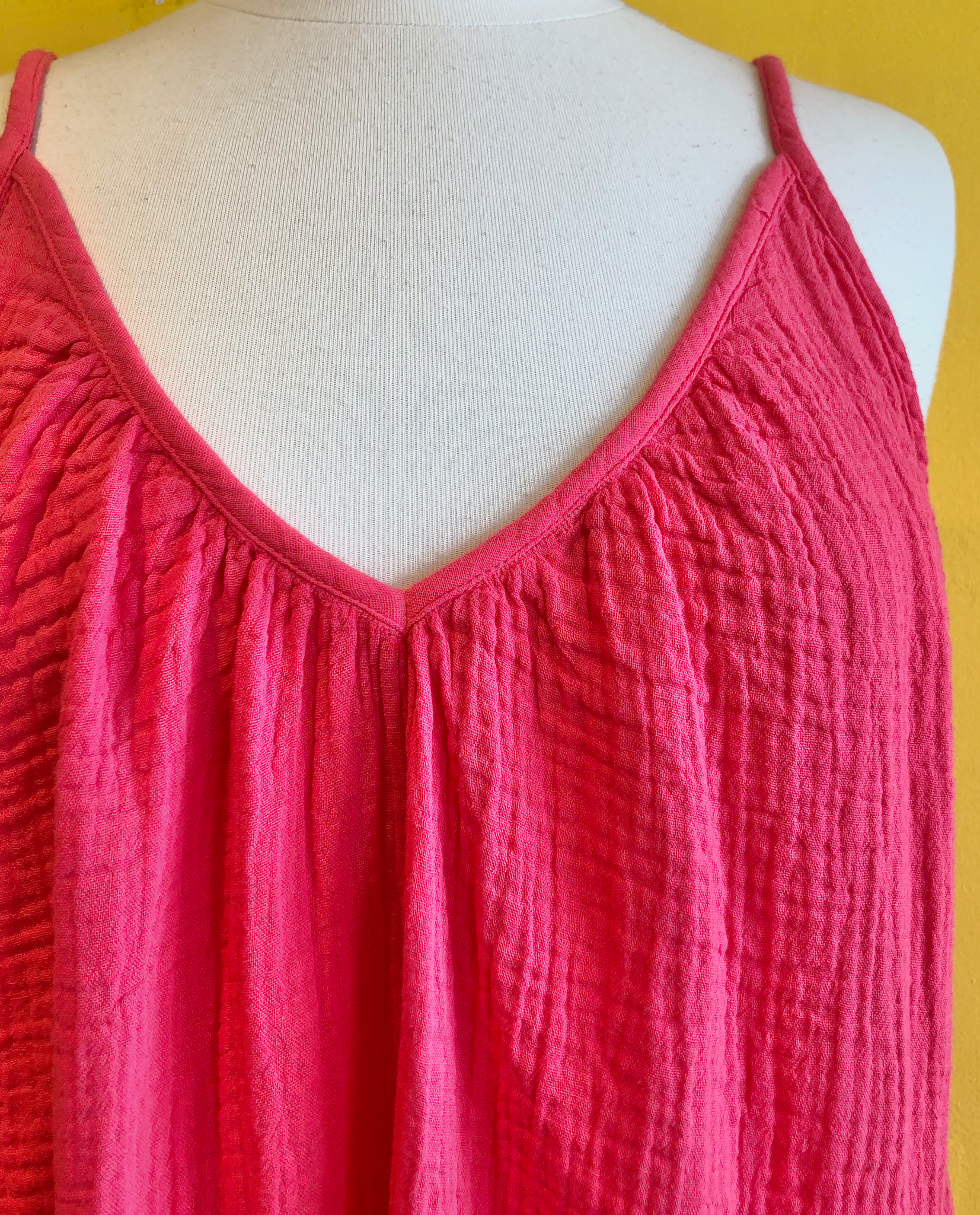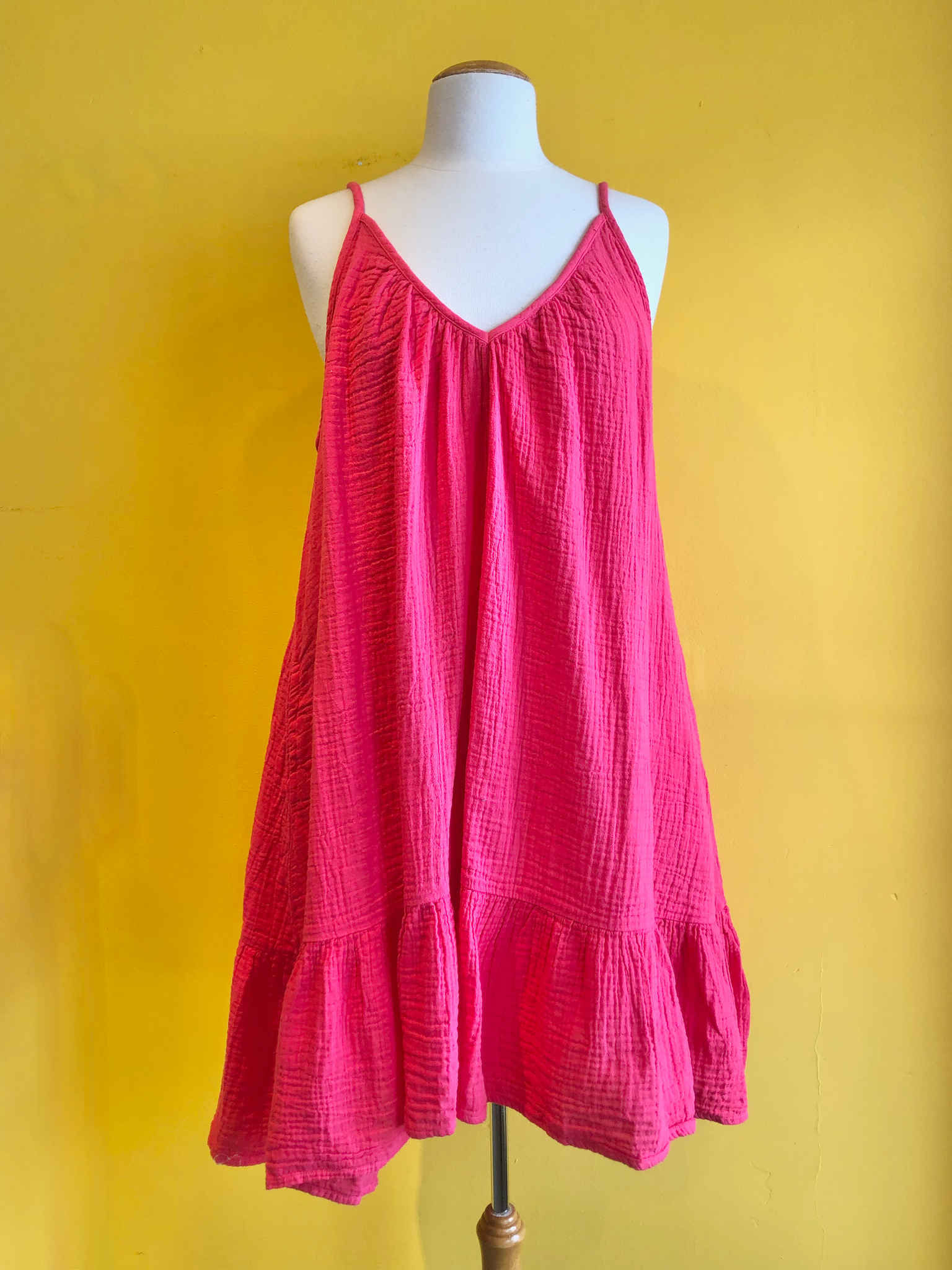 Camisole dress with a v-neck, flounced bottom, two side pockets, and crinkle cotton fabric.