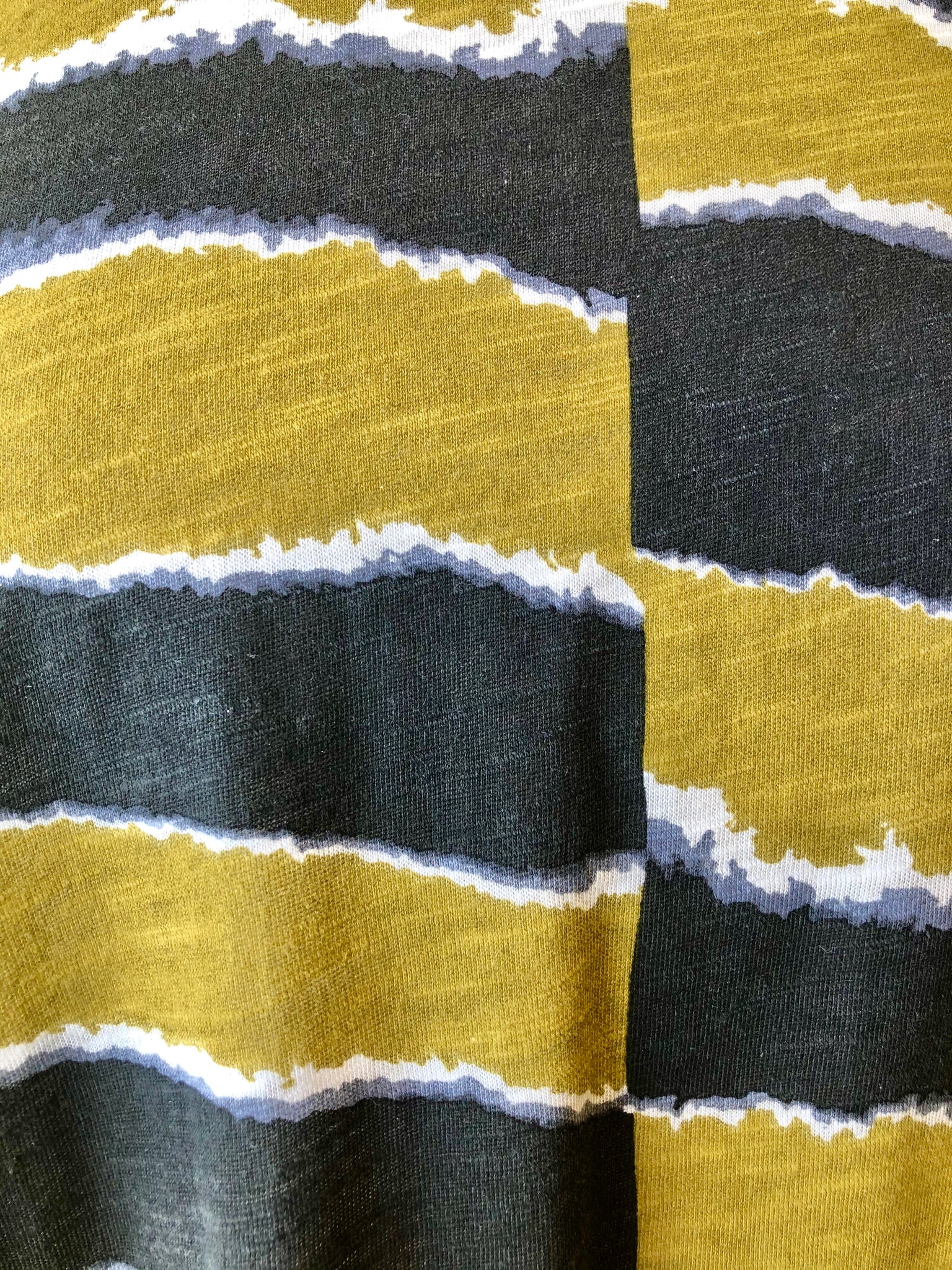 Green and navy asymmetrical striped T-shirt with short sleeves and a scoop neck.