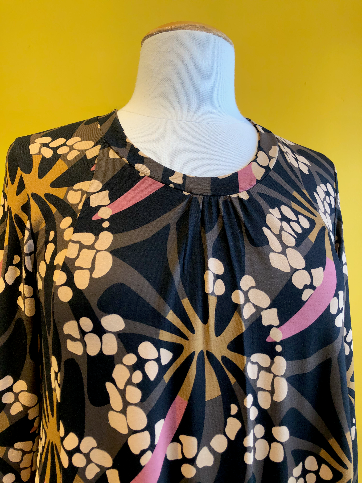 Dress with a scoop neck, long-sleeves, small gathered detail around the neckline, and an earth tone 70's pattern.
