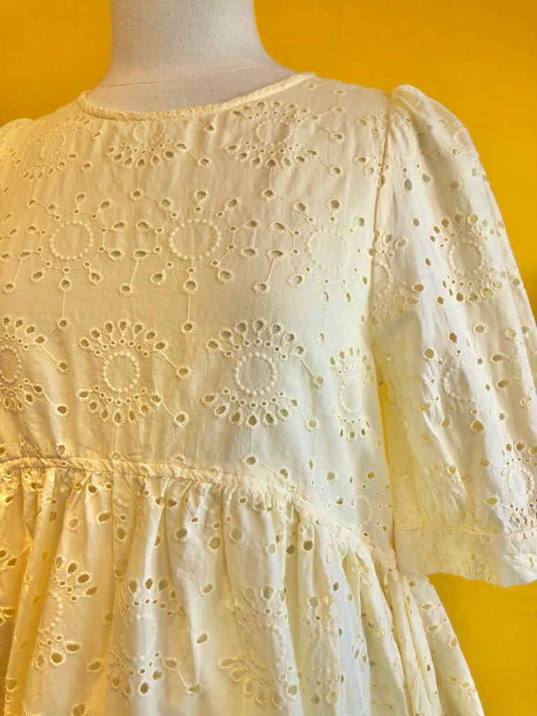 Short sleeve top with a scoop neck, short bubble sleeves, 3/4 button down in the back, cut-out embroidery detailing all over, and 100% lightweight cotton outer fabric and lining in a 'Vanilla Custard'.