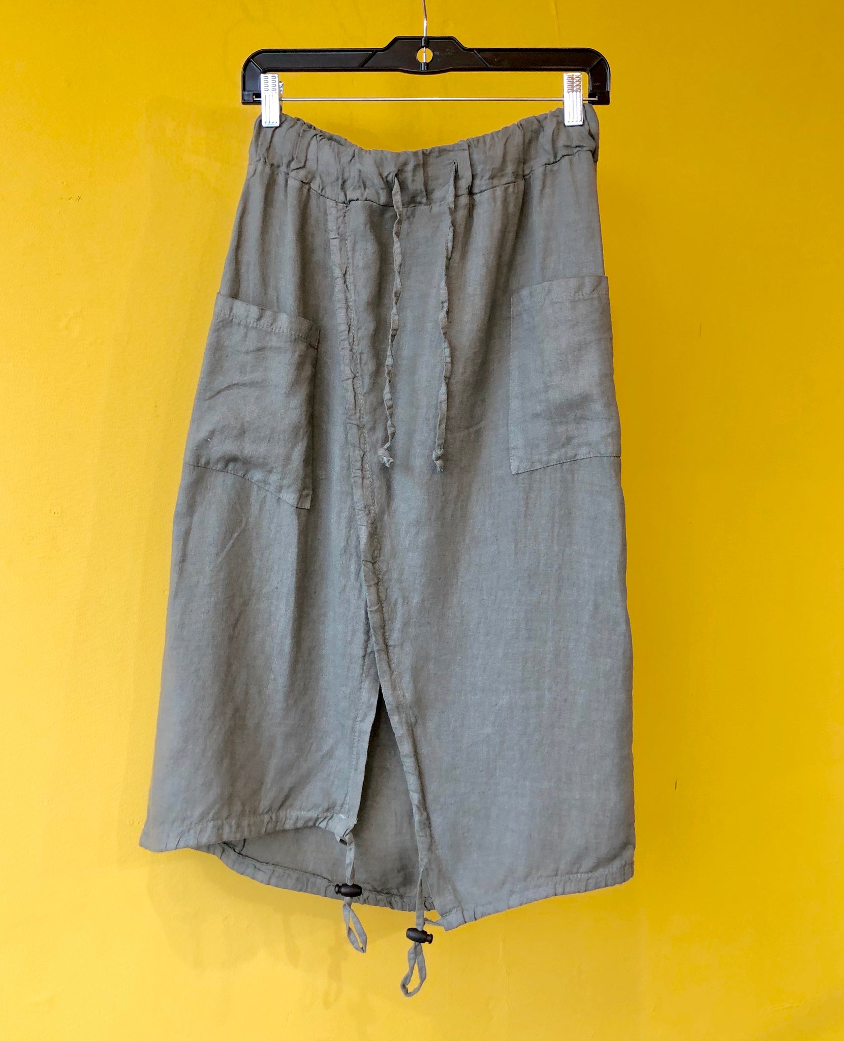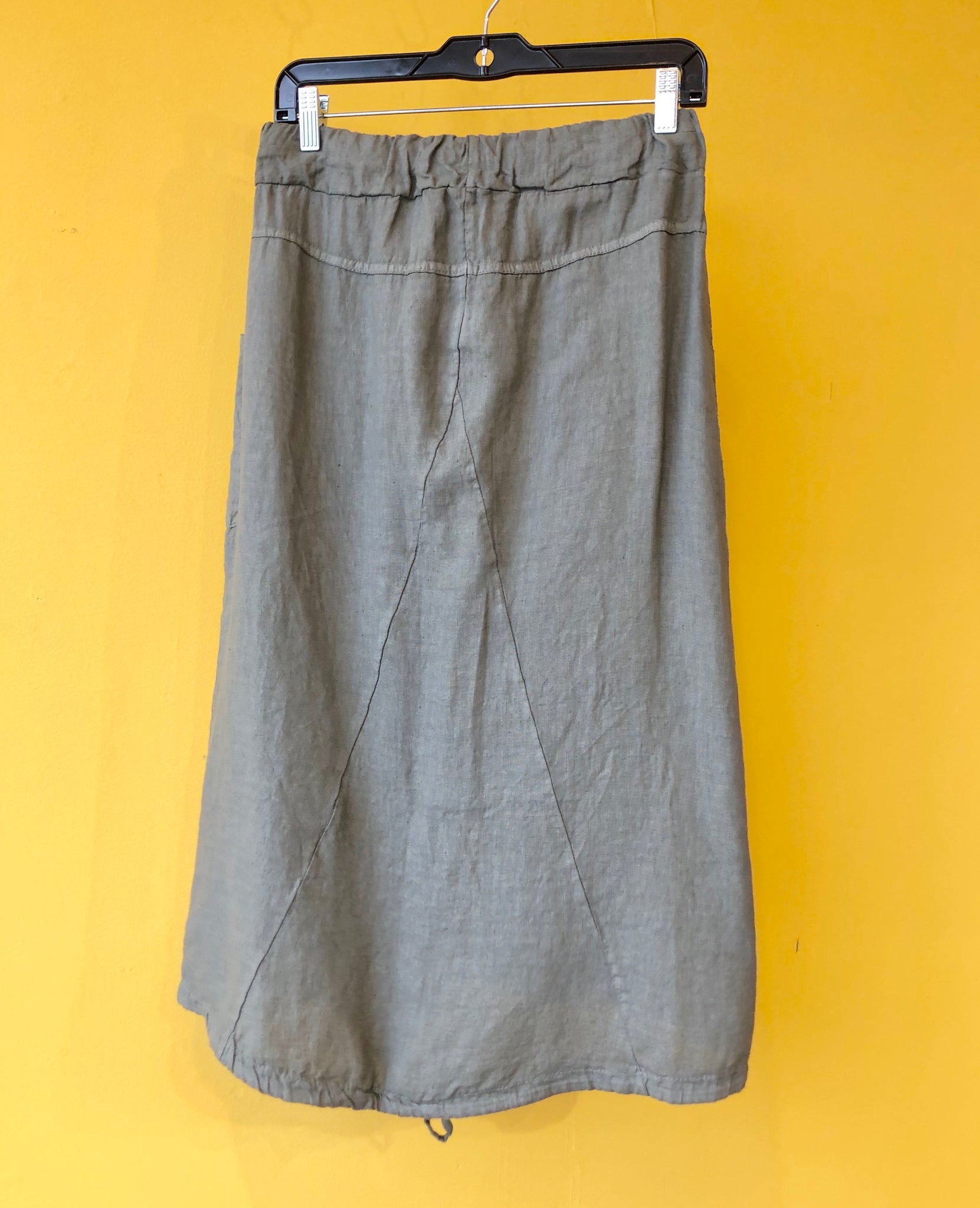 Linen faux-wrap midi skirt with a drawstring waistband, front pockets, and a cinchable hem.