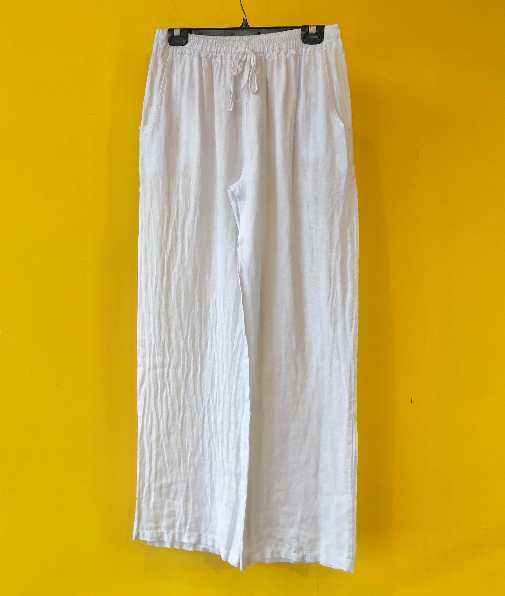 Linen full-length pant with a drawstring waistband, front pockets, and wide leg design