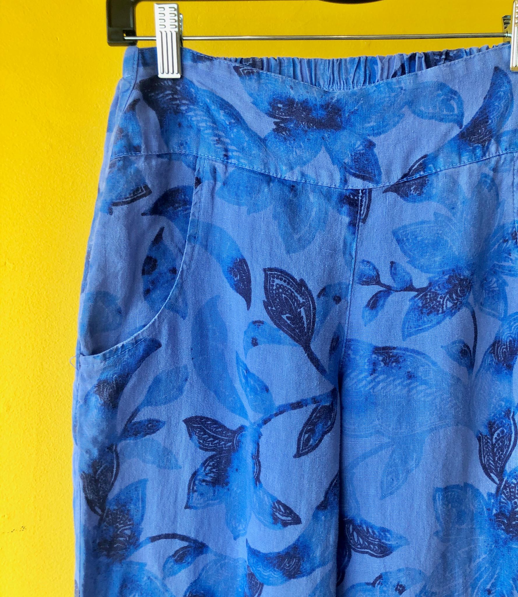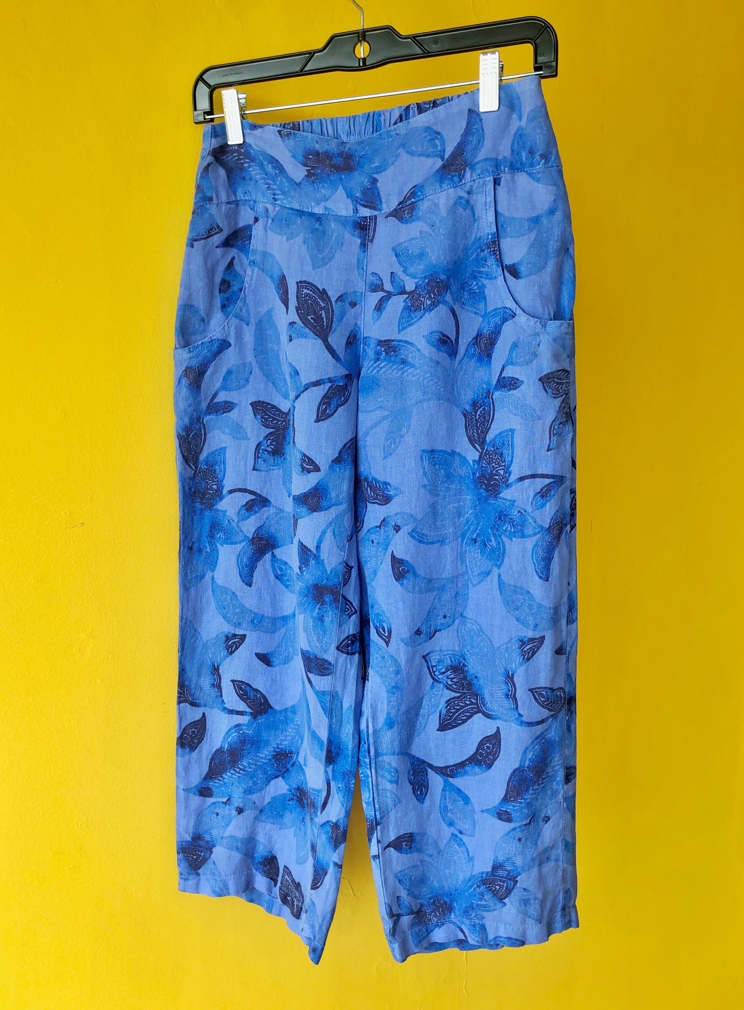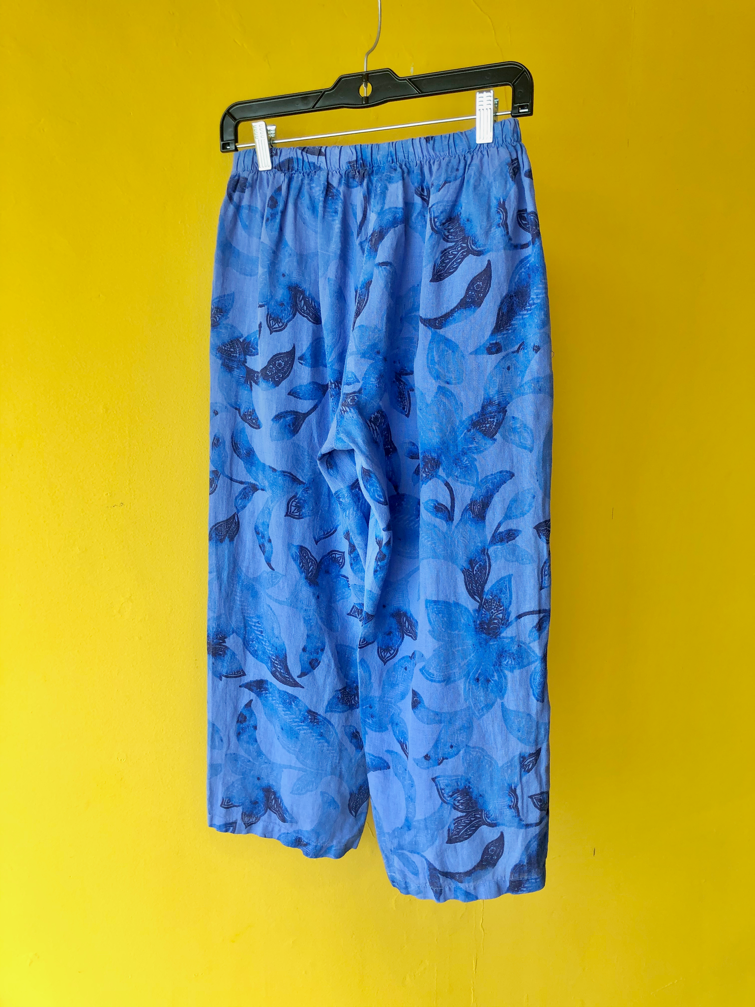 100% Linen pants in lapis batik floral print with a flat front, elastic back and 2 side pockets.