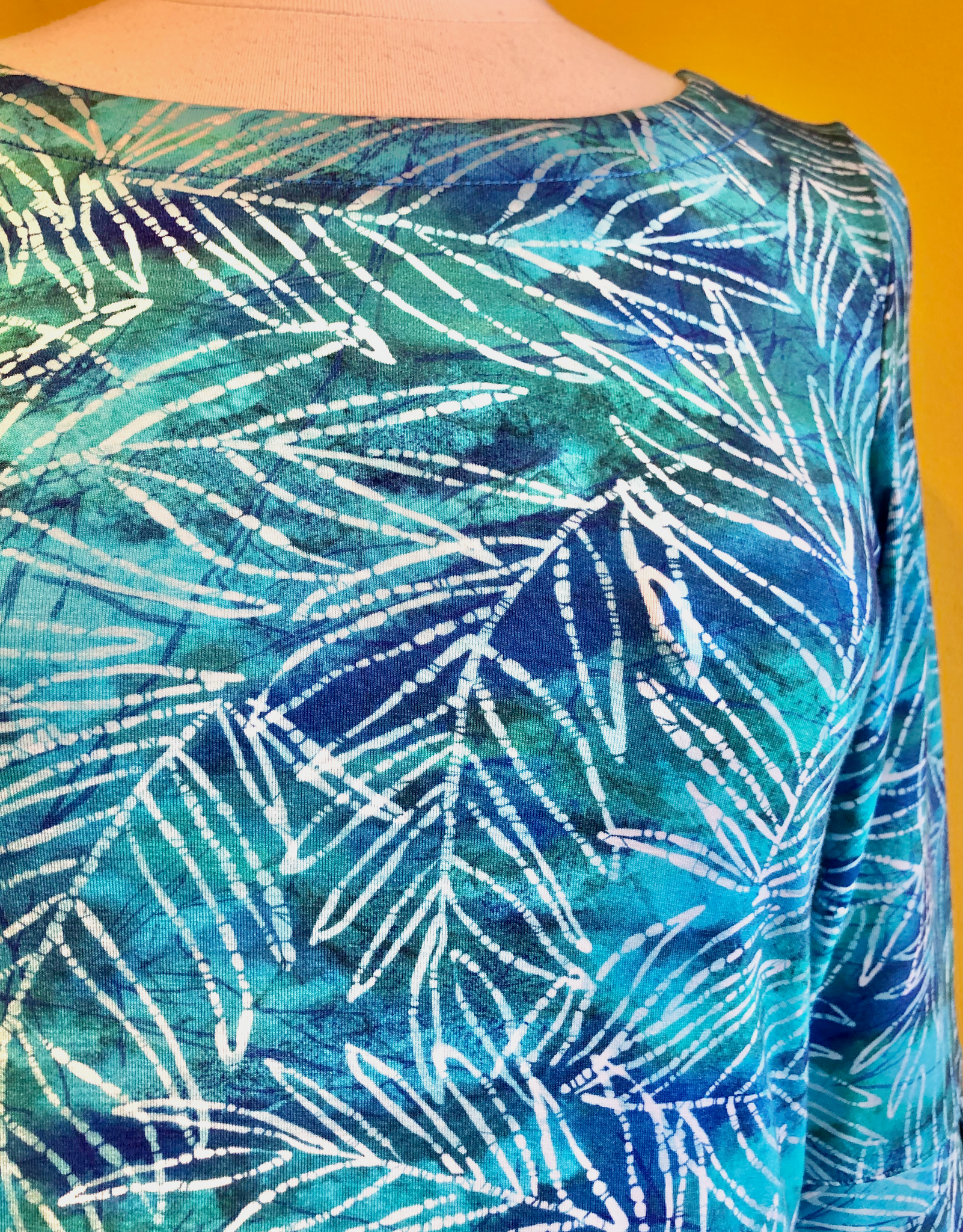 Viscose dress with 3/4 length sleeves, a boat / wide scoop neck, and bright and colourful pattern.