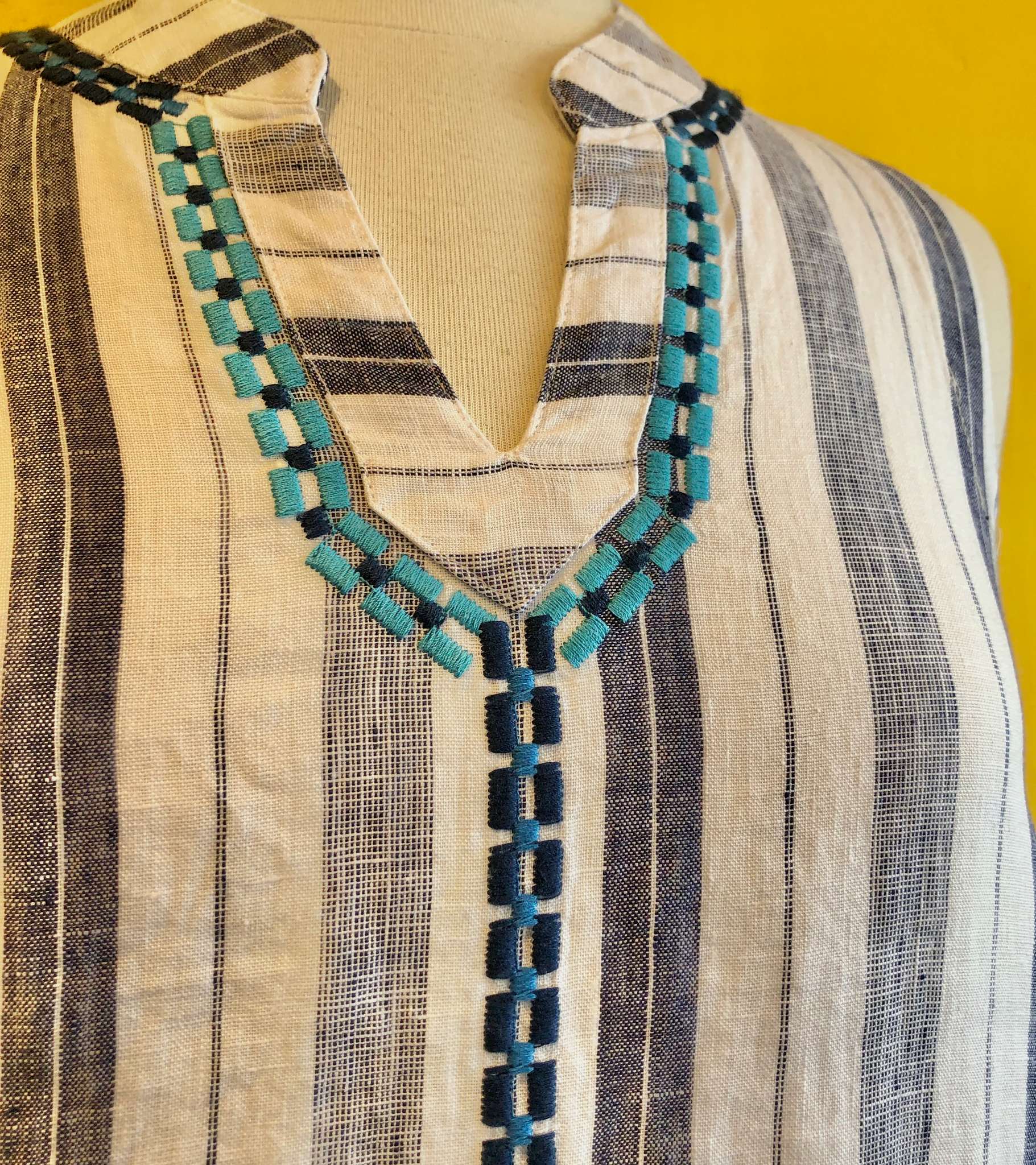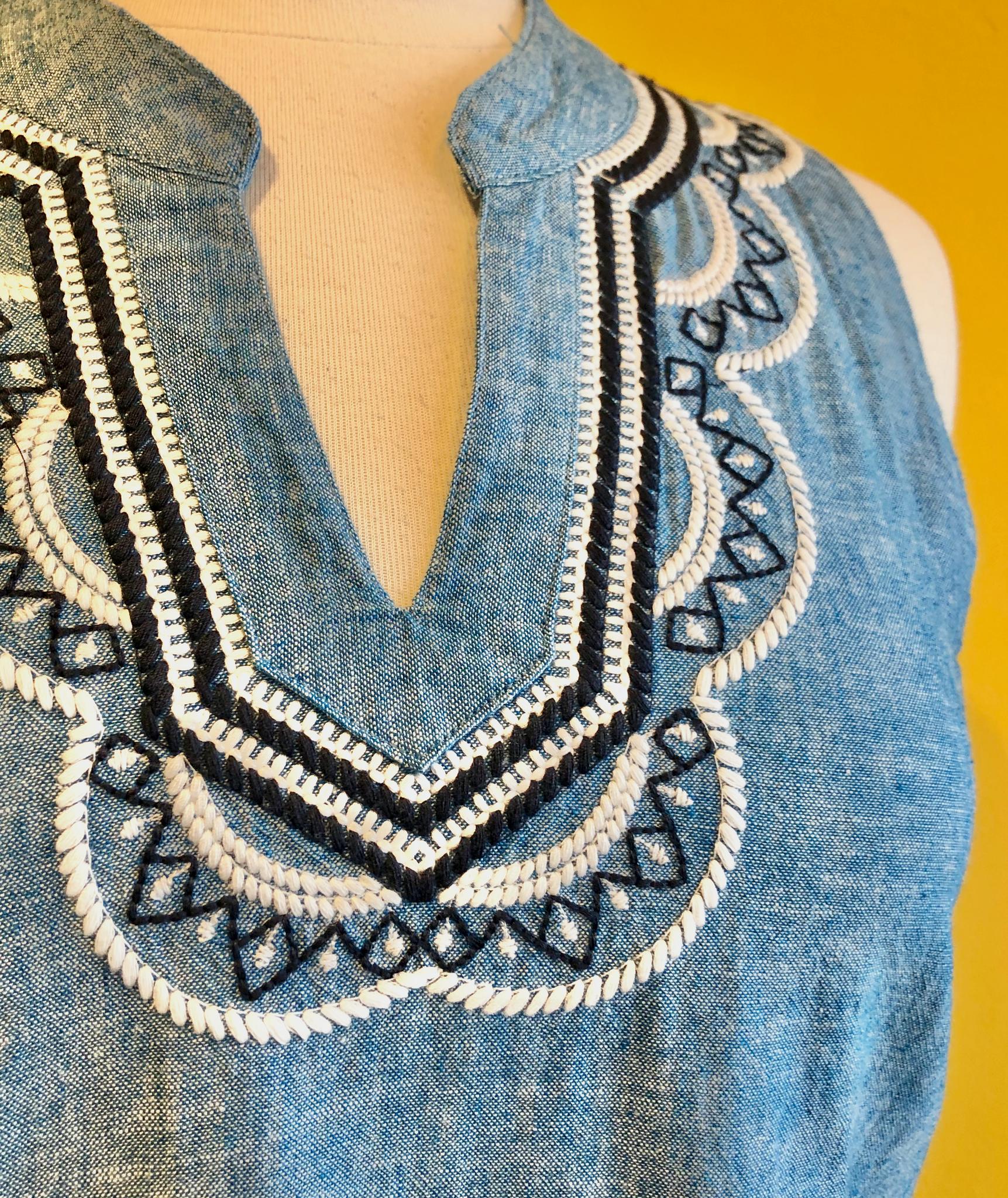 Sleeveless shift dress with a notch v-neck, side pockets, and embroidery detailing along the neckline and hem.