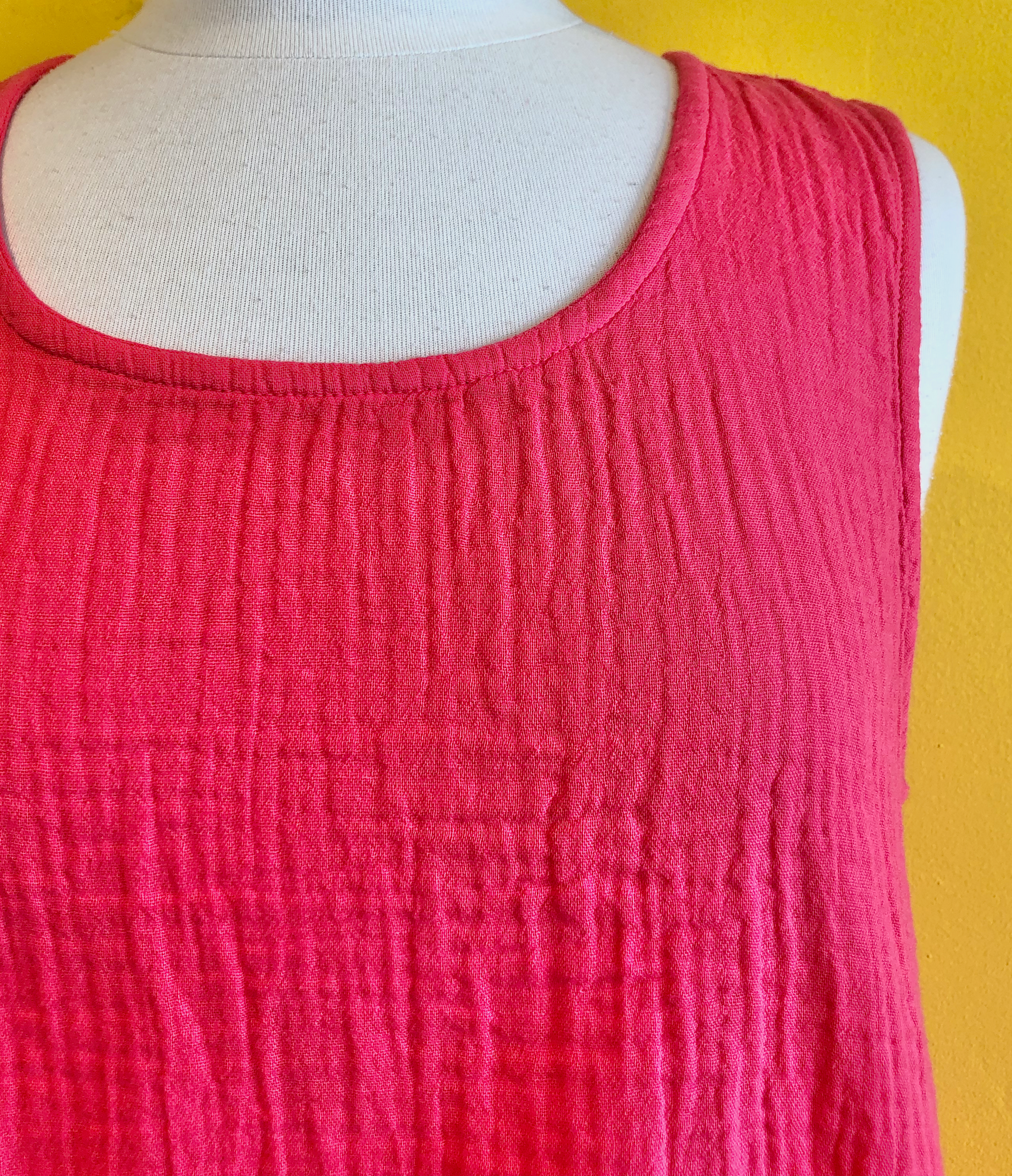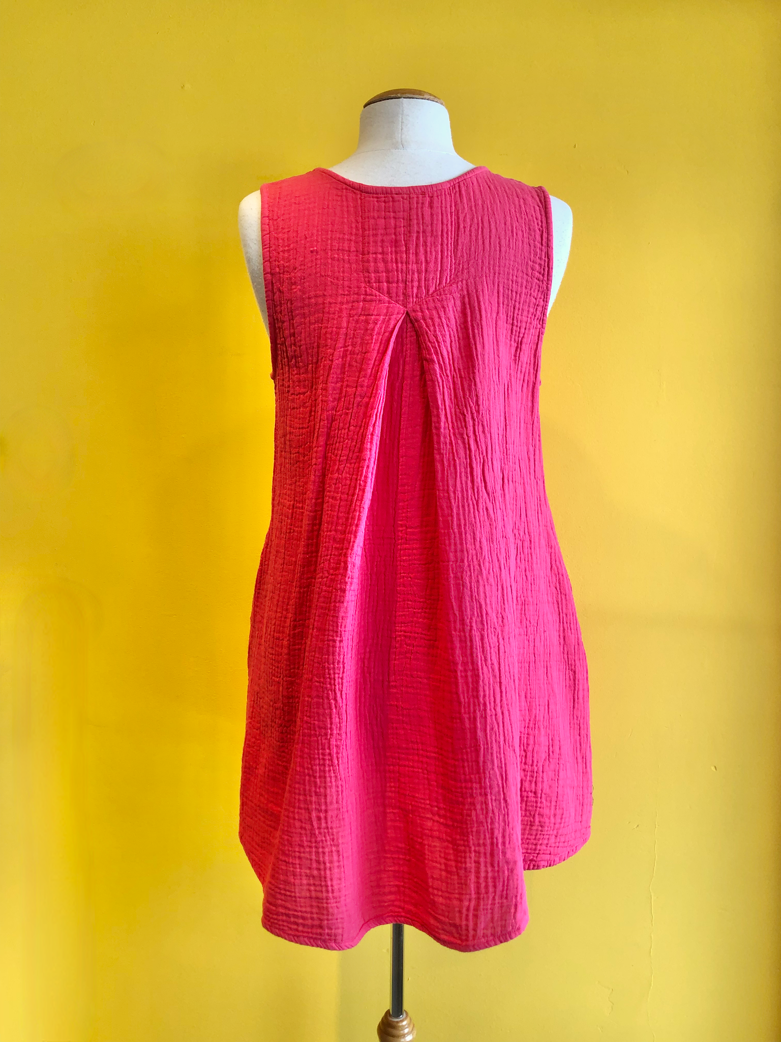 Sleeveless dress with a scoop neck, wide tank straps, two side pockets, and crinkle cotton fabric.