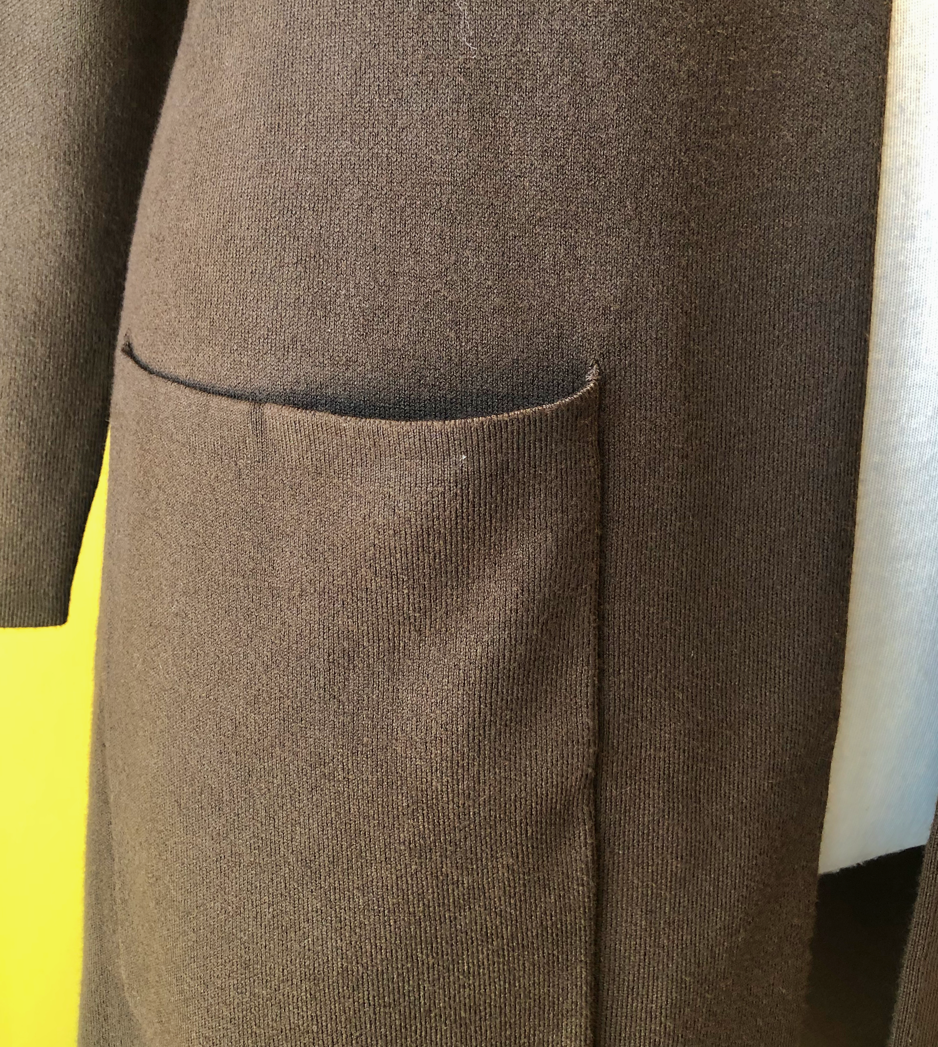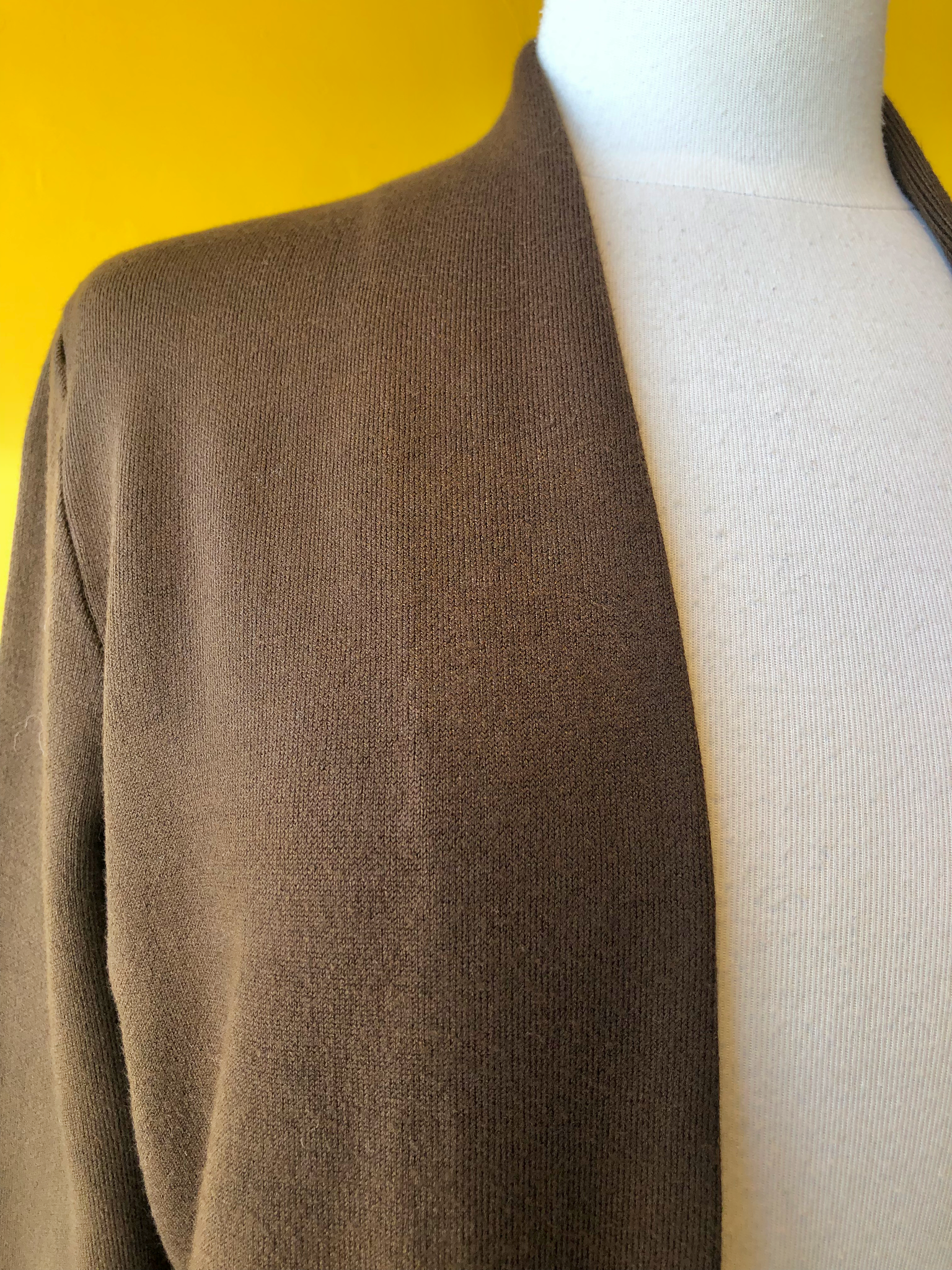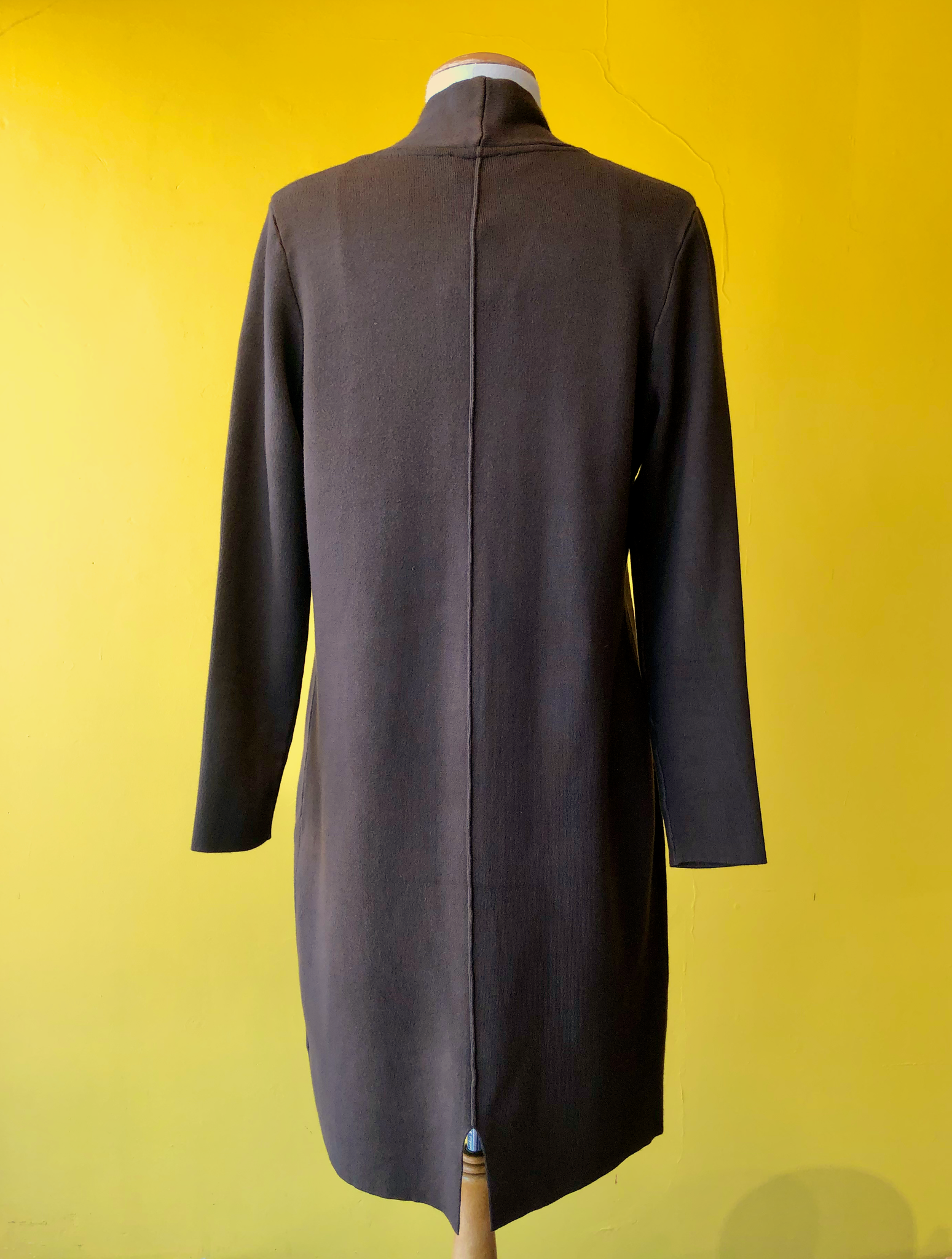 Knee-length cardigan with two front pockets, and open front, and made from the most comfortable and soft bamboo knit material.