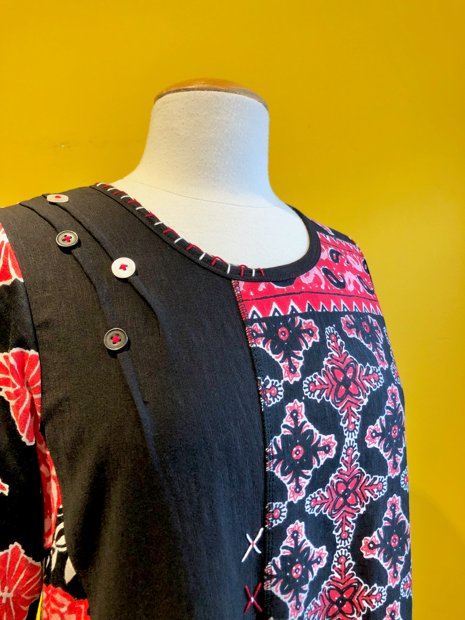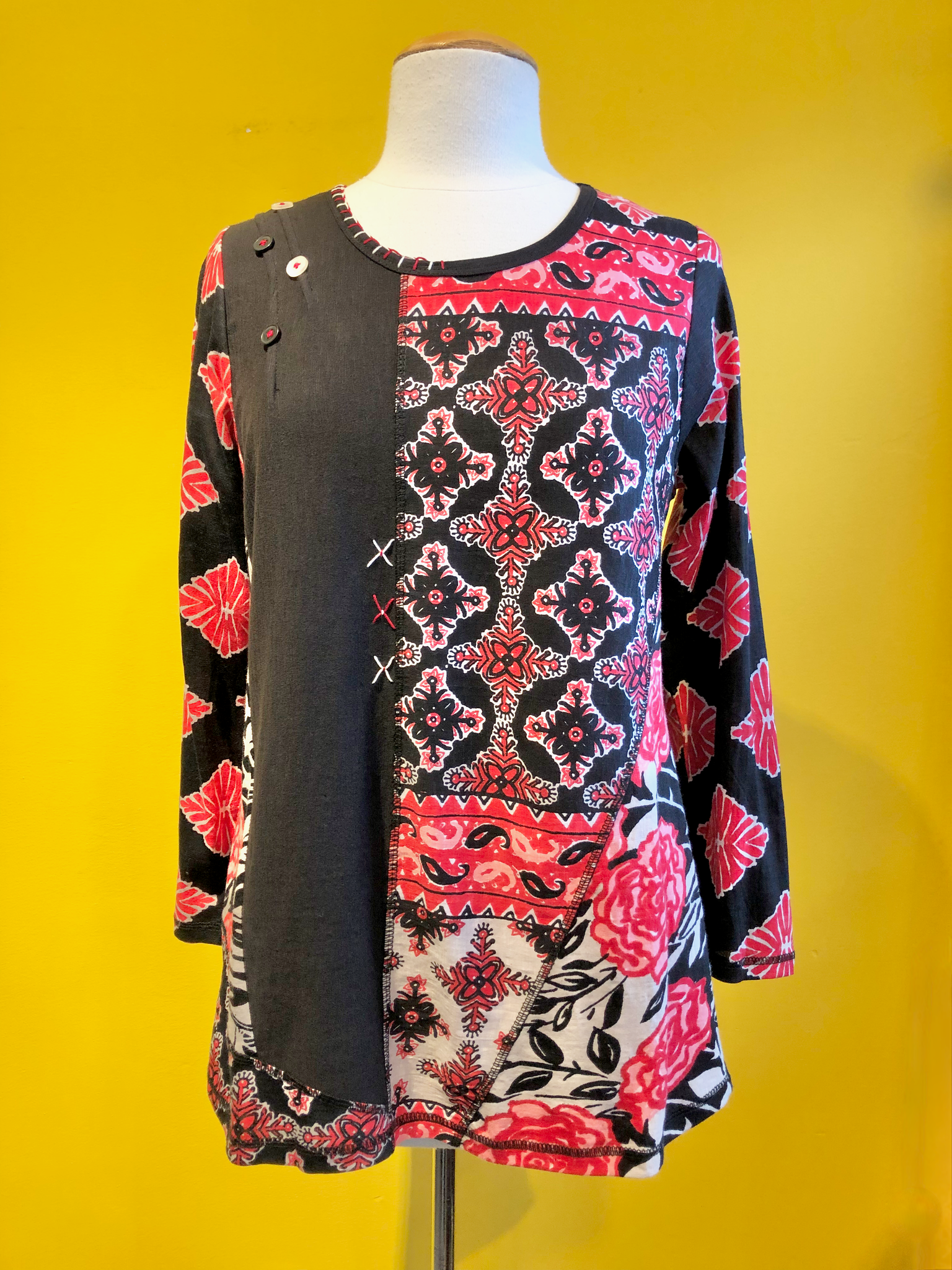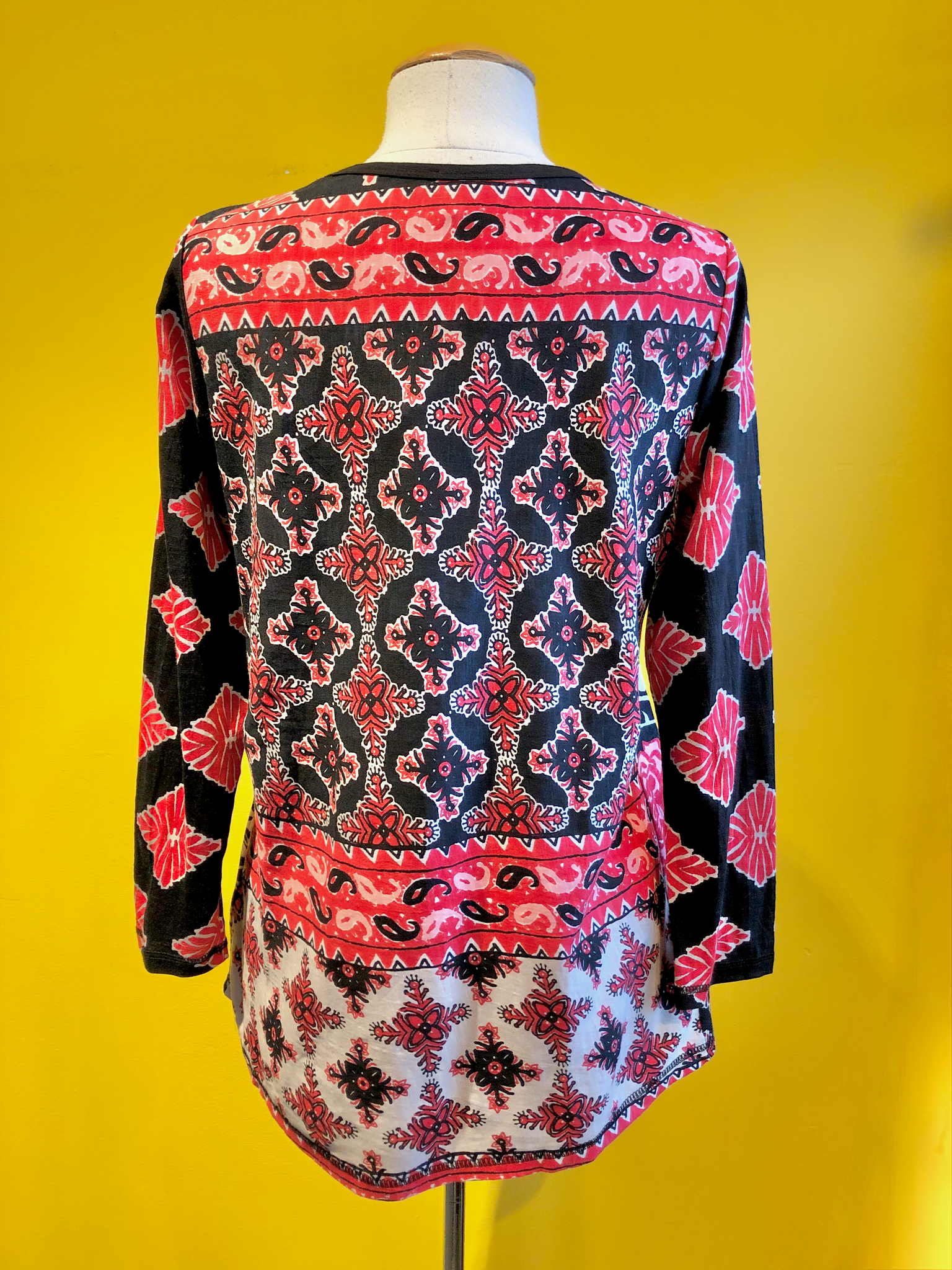 Cotton long-sleeve top in the 'Rabat' print with a scoop neck, patchwork design, and button and embroidered detailing.