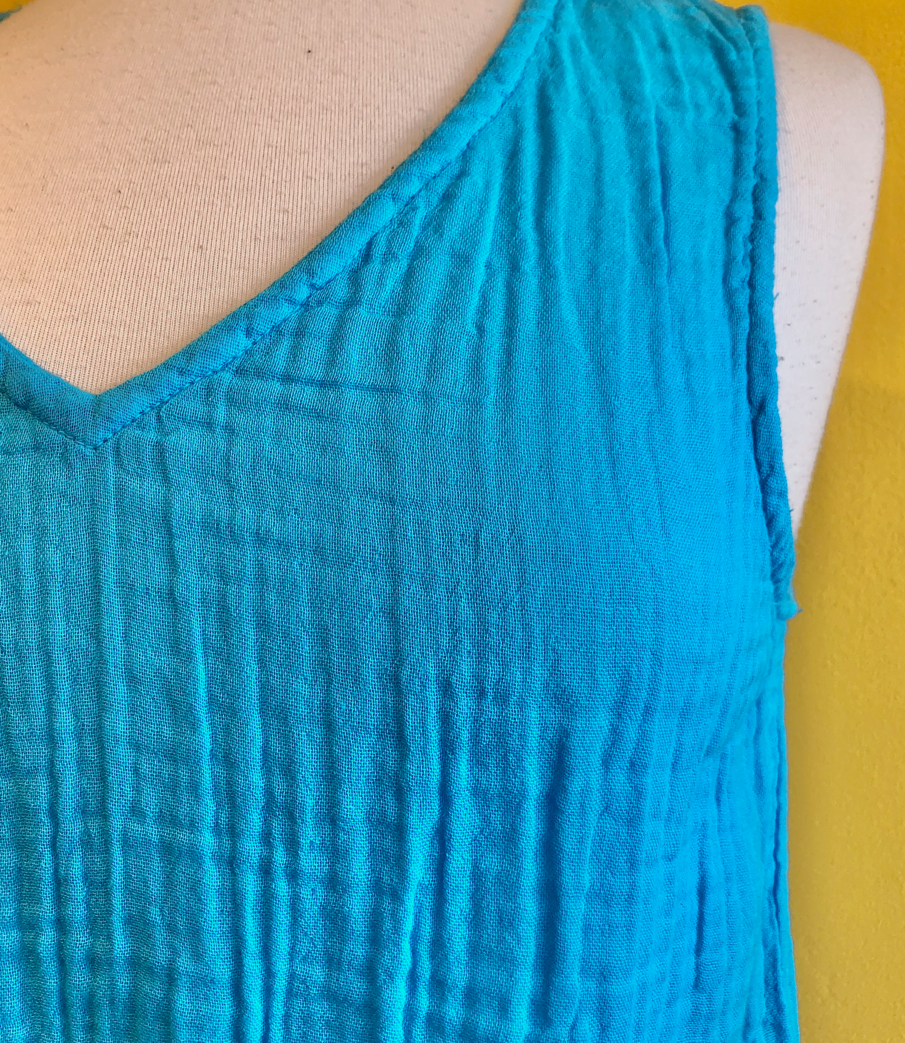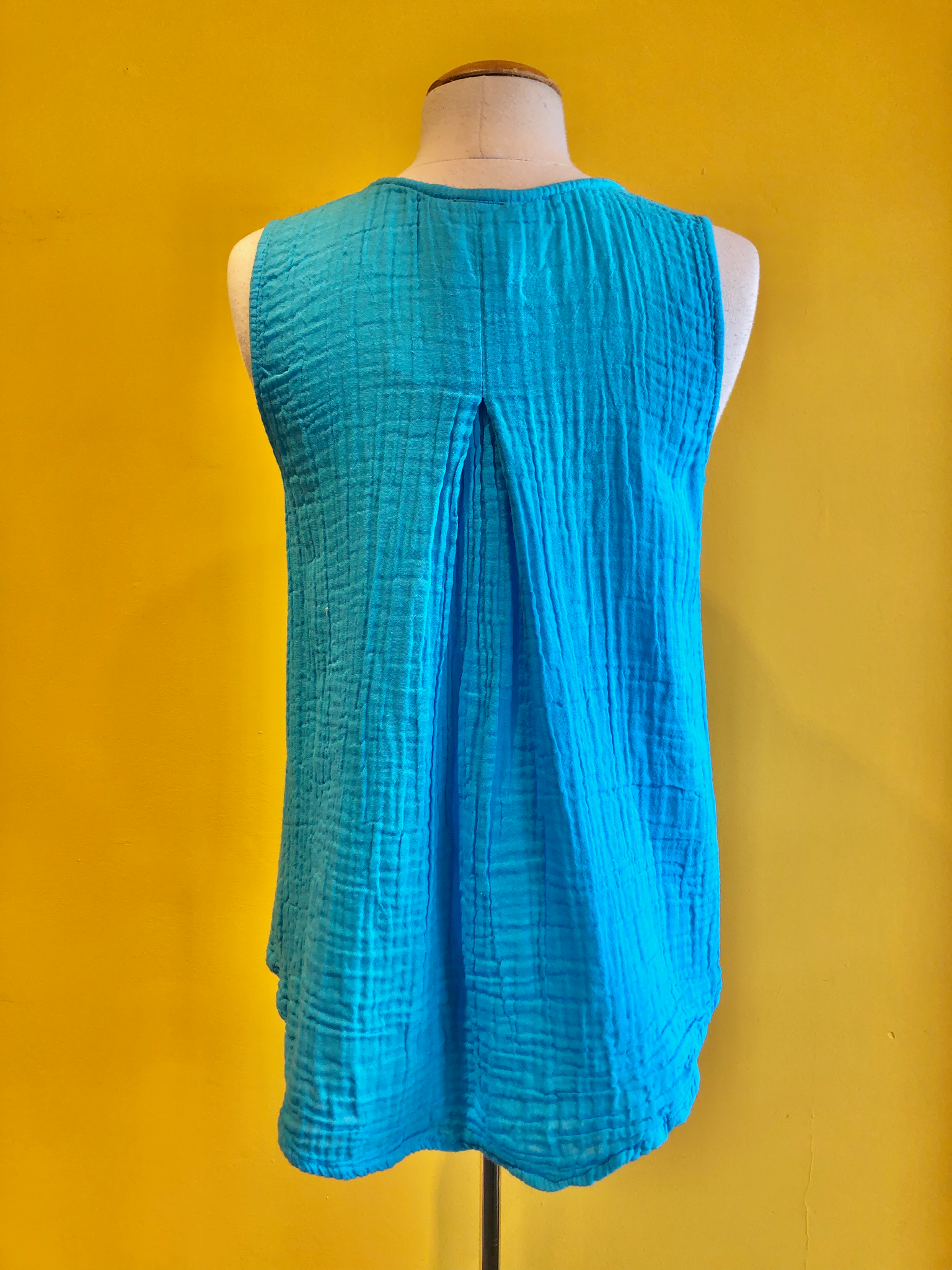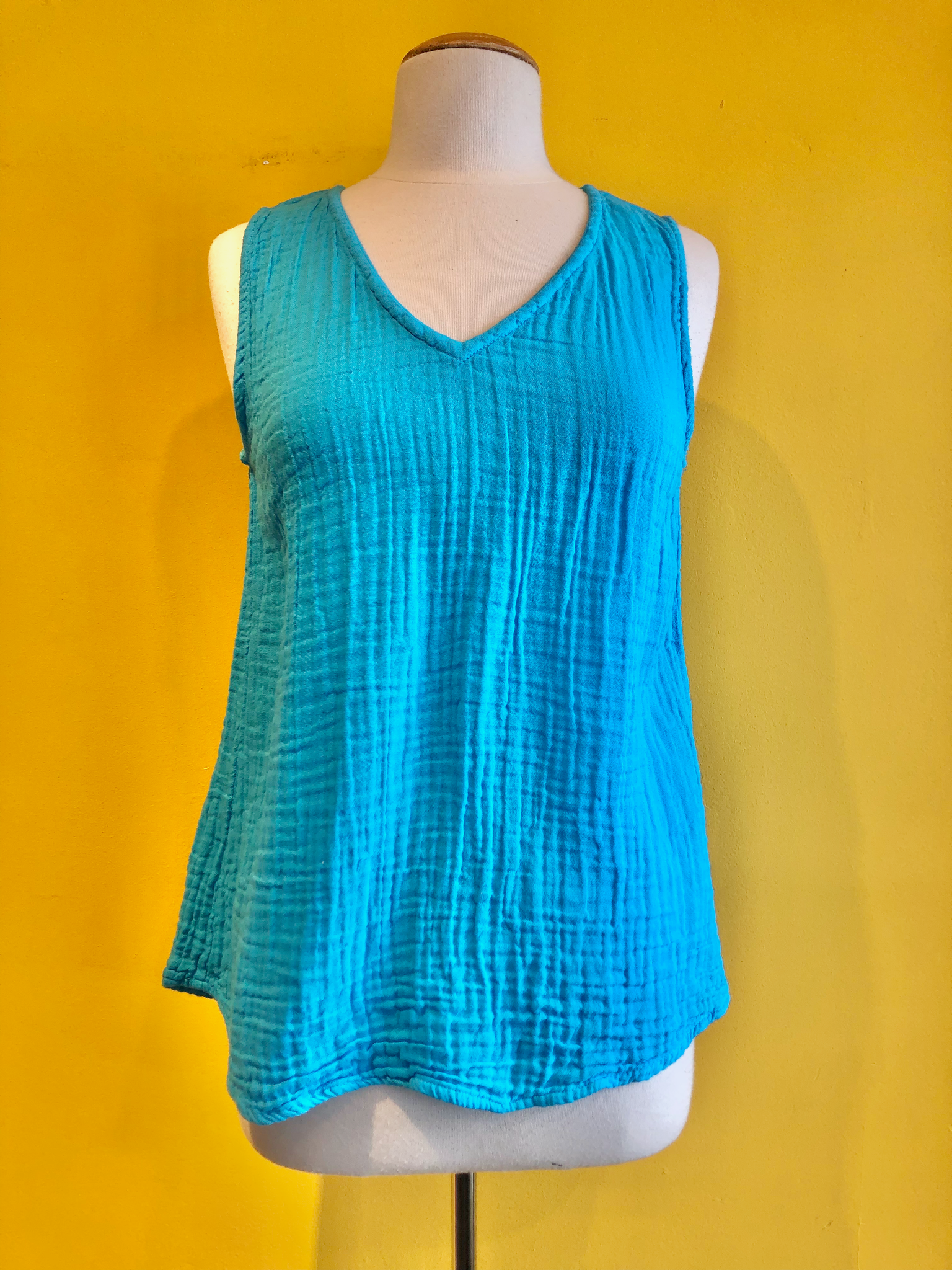 V-neck tank with wide straps, high-low hem, pleat on the back, and crinkle fabric.