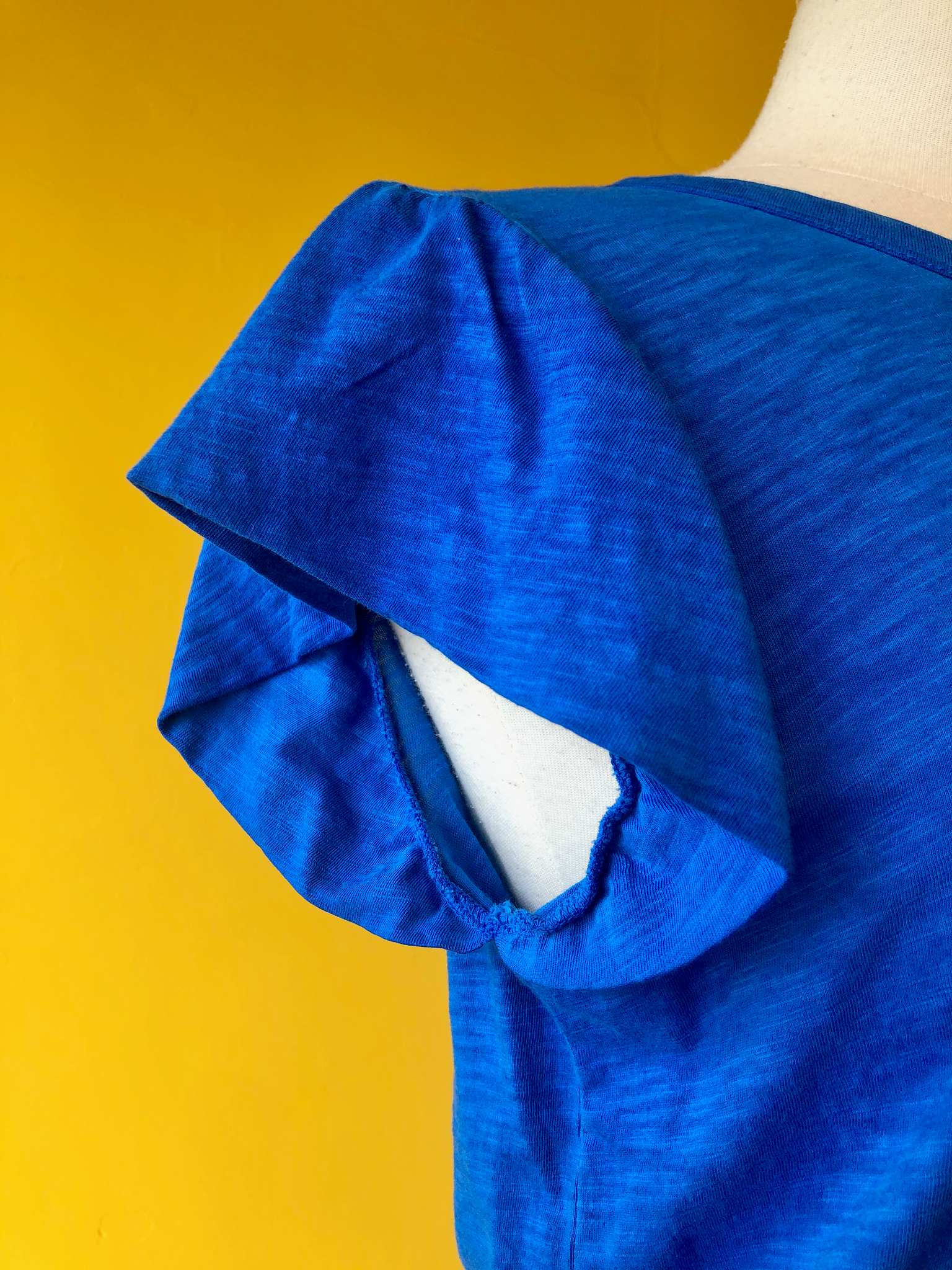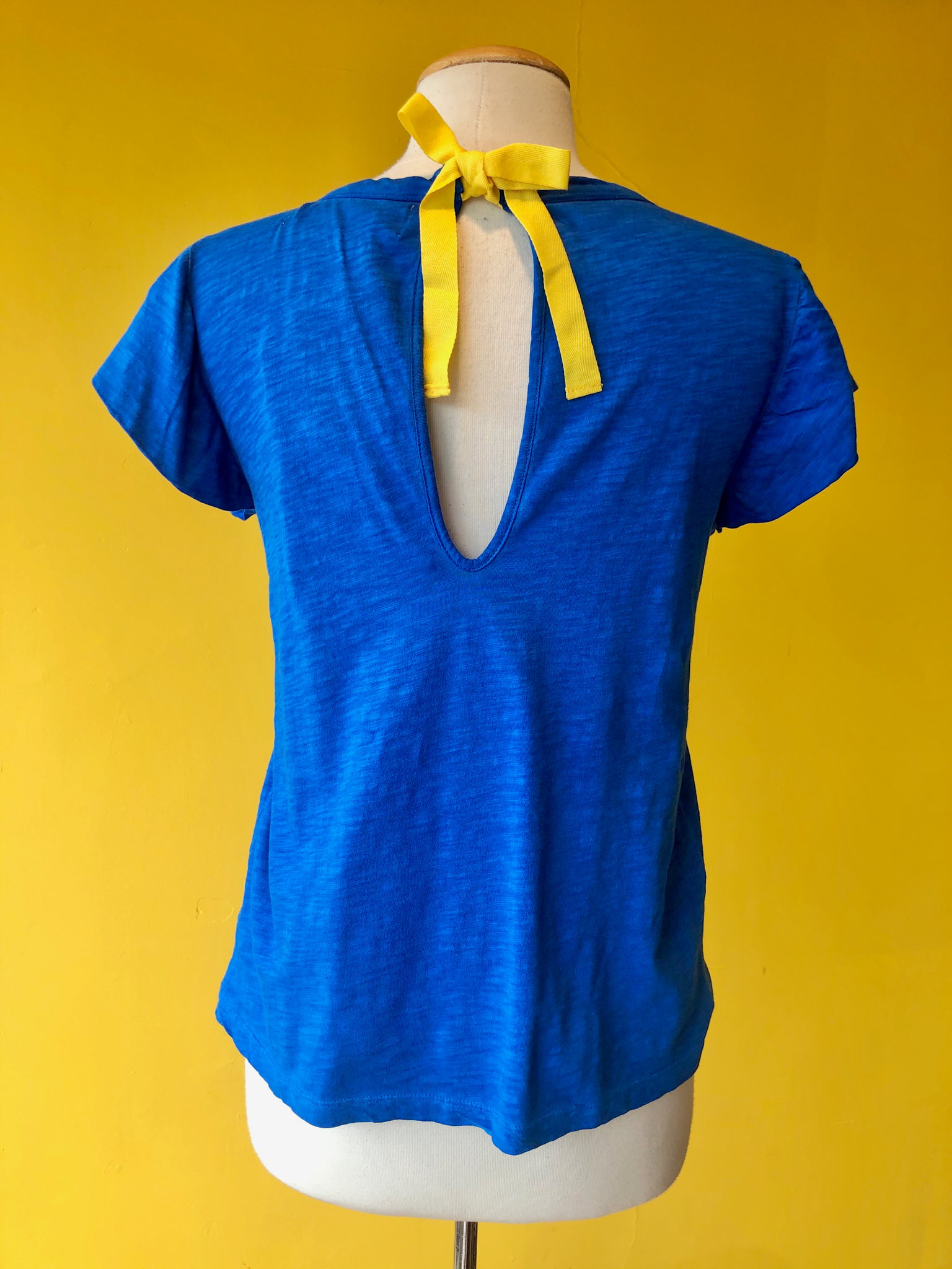 Blue cotton t-shirt with ruffle cap sleeves and a keyhole back with yellow ties.