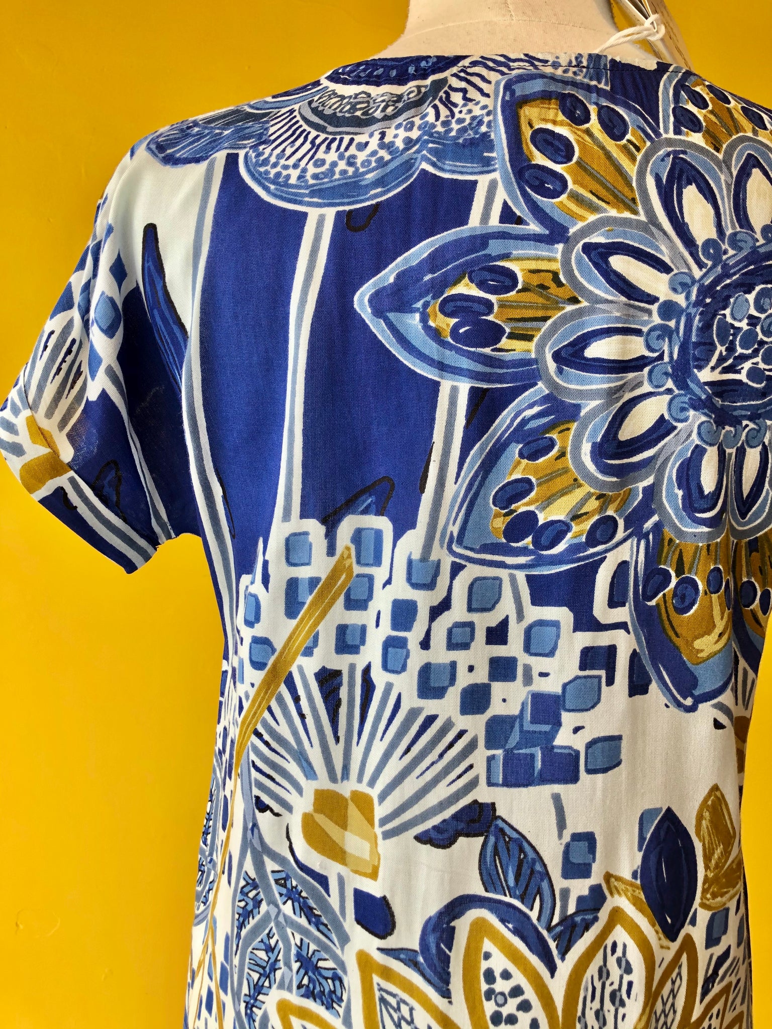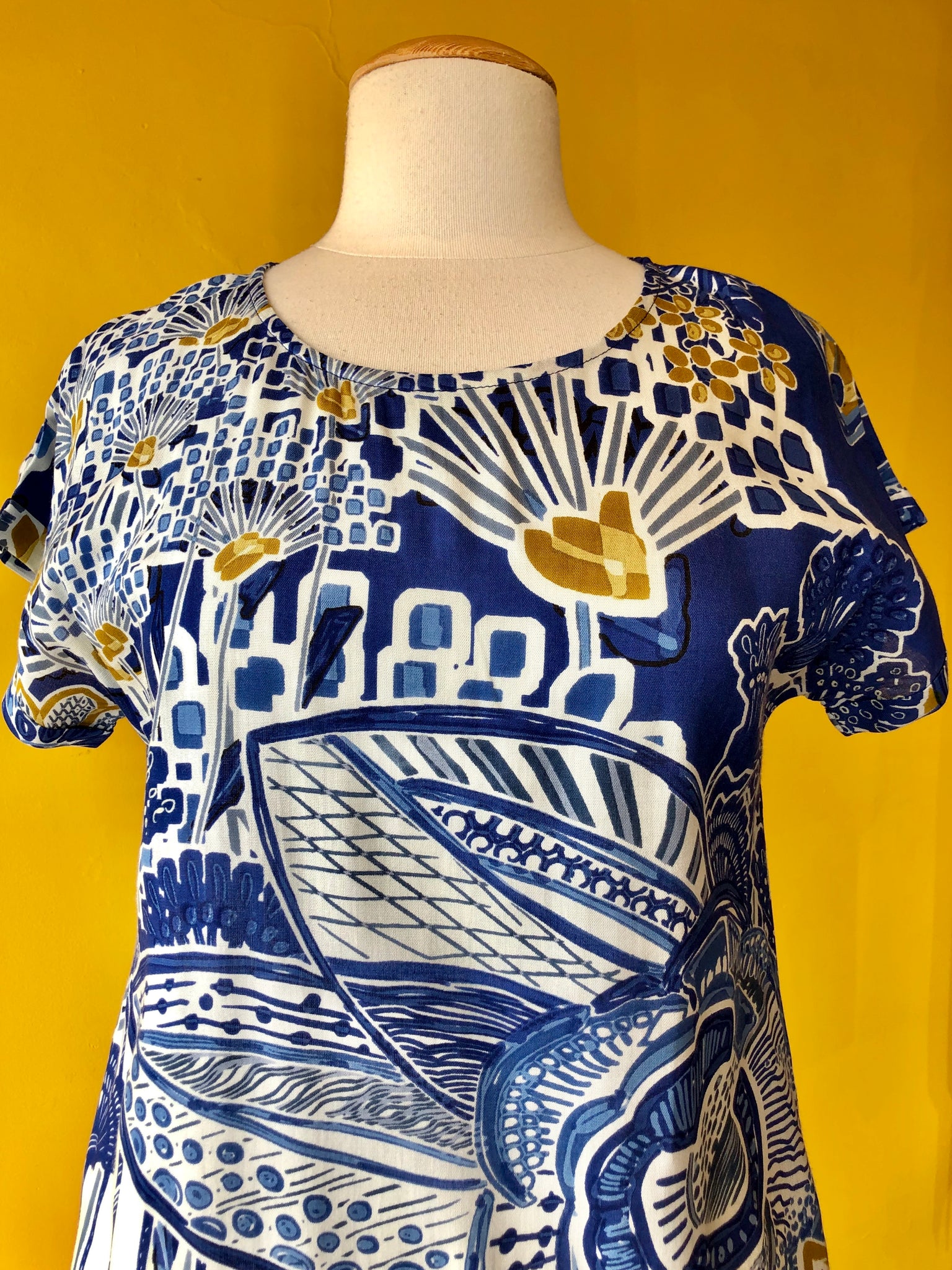Lightweight scoop neck shift dress with short sleeves and two side pockets.