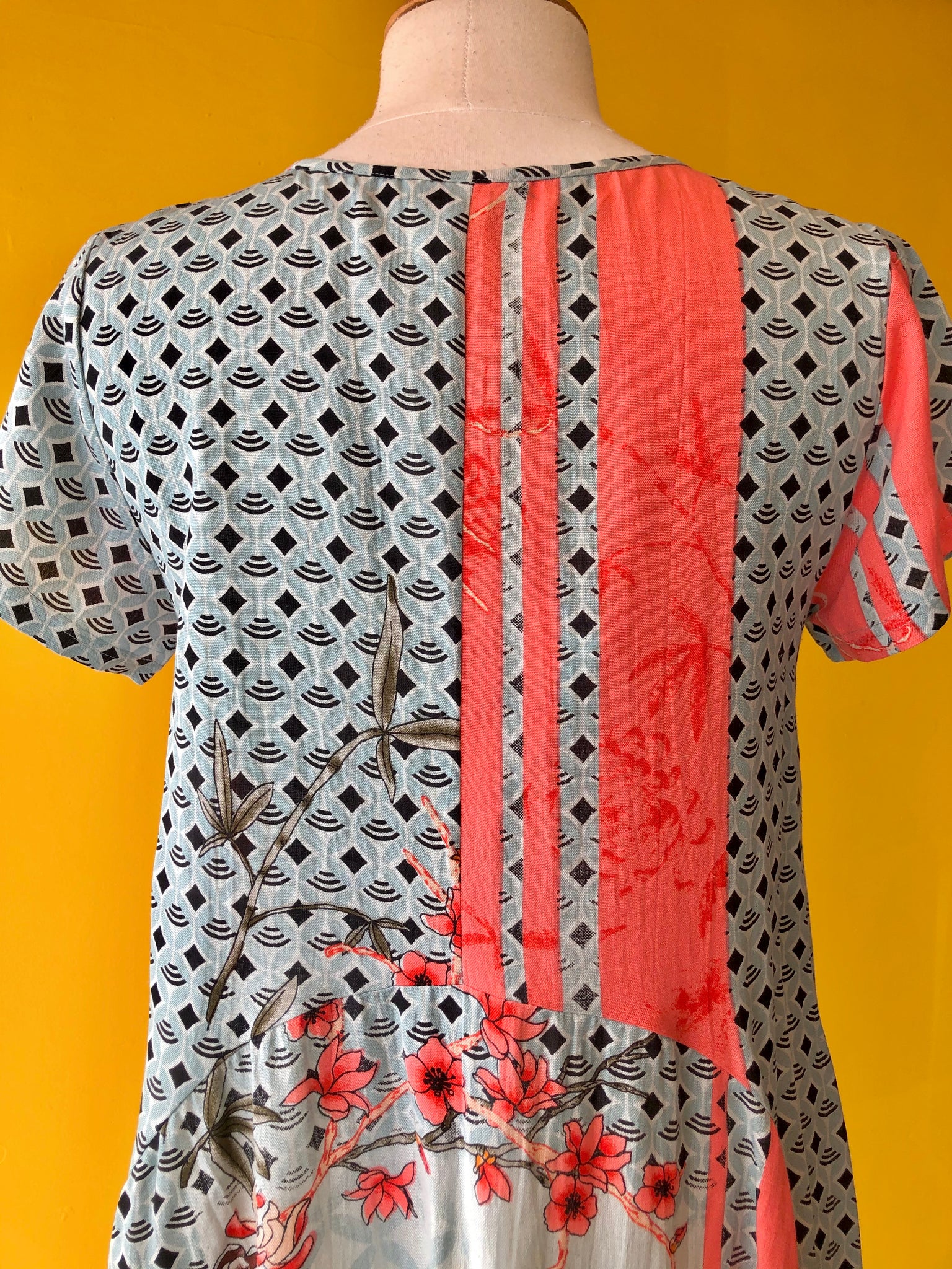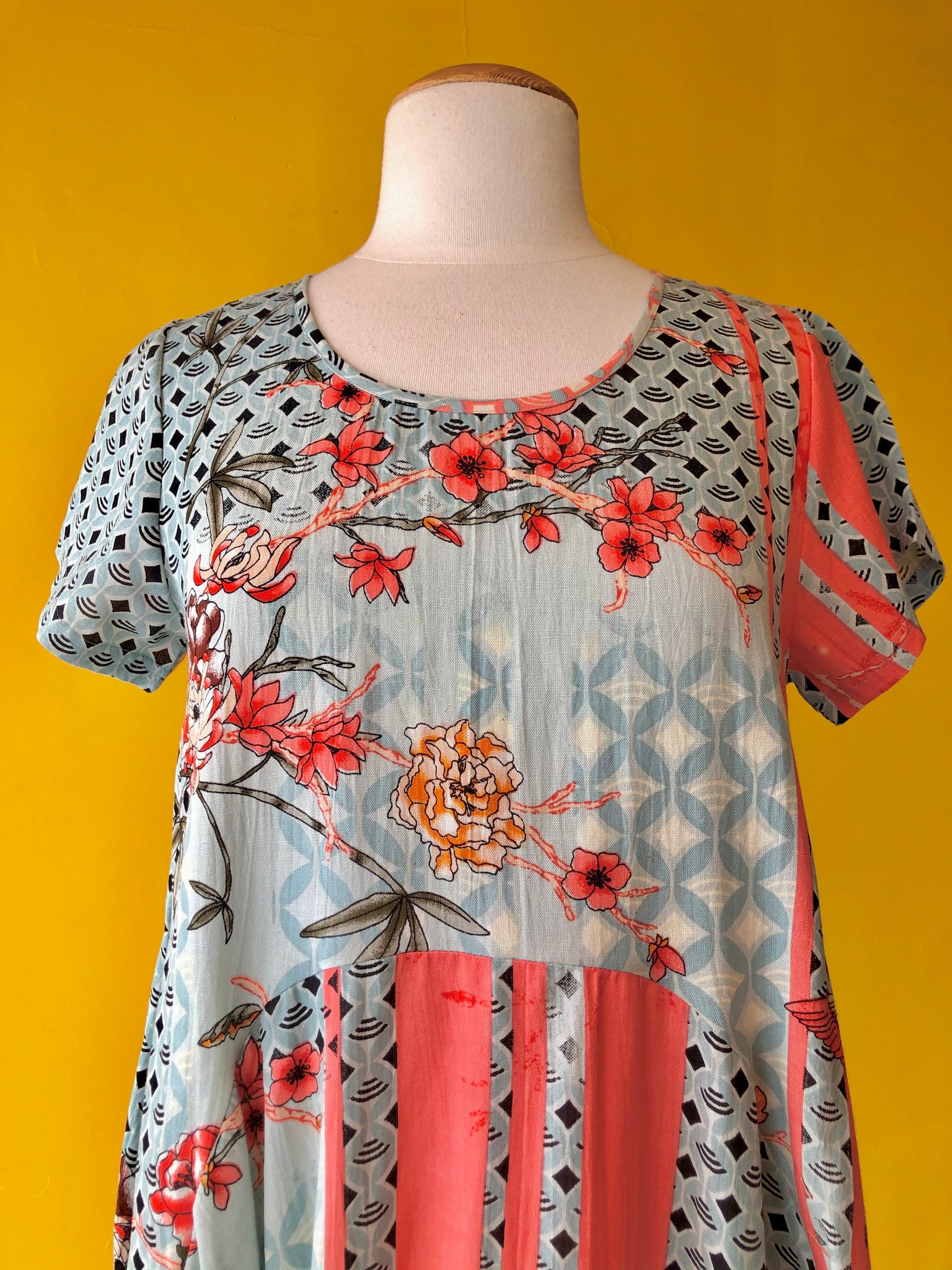 Bubble dress with short sleeves, a scoop neck, rounded panel detailing, and two side pockets.