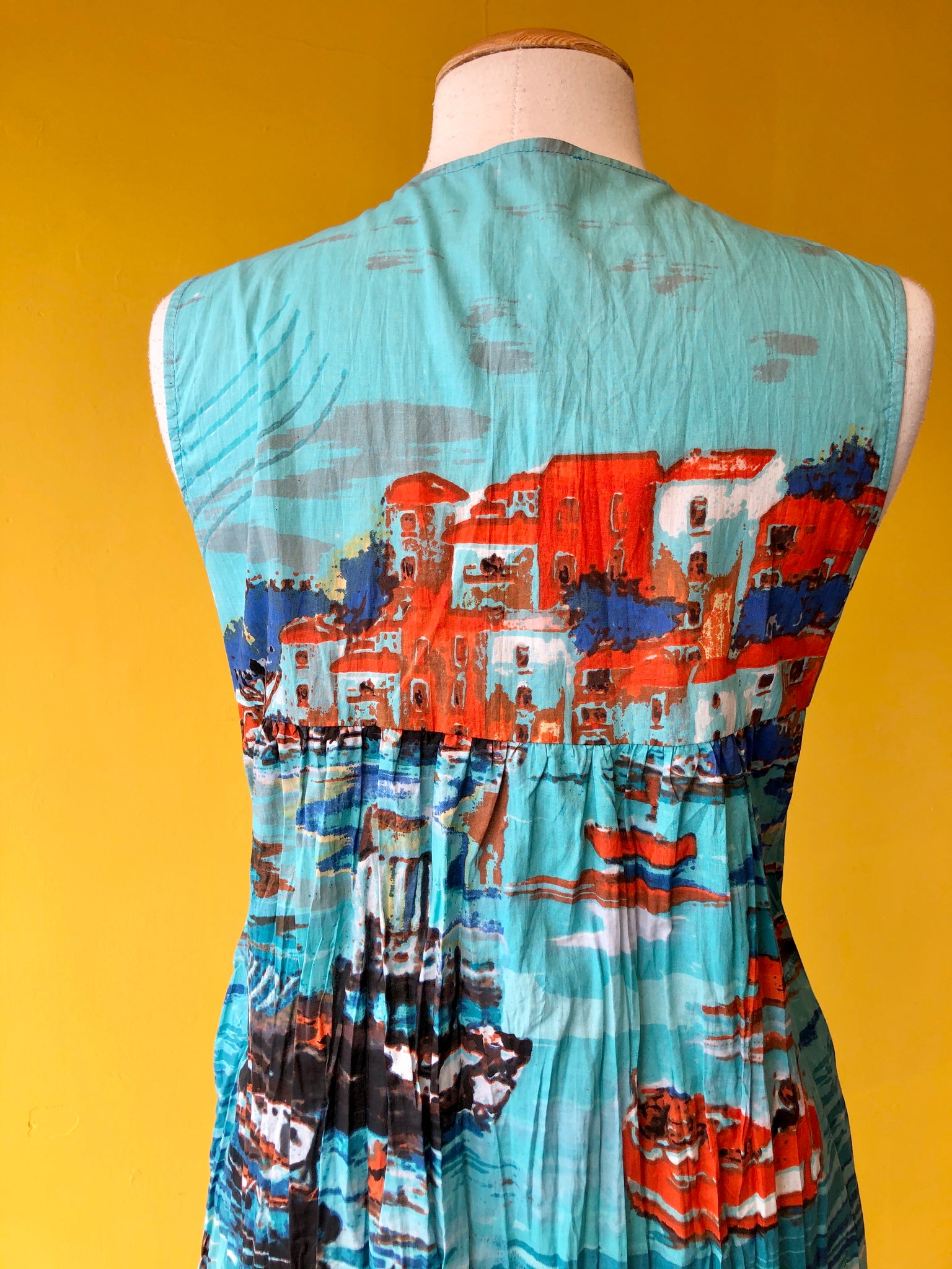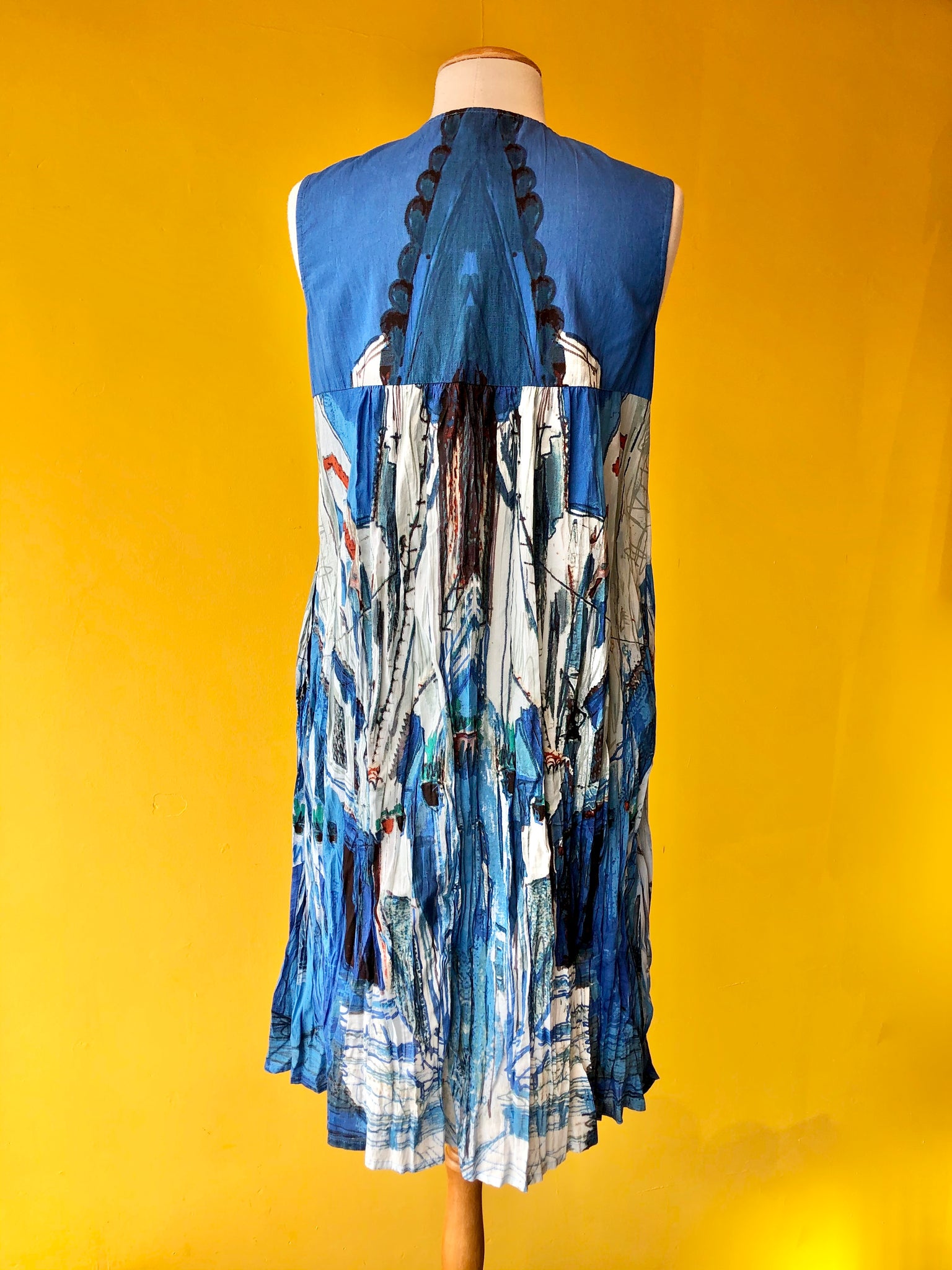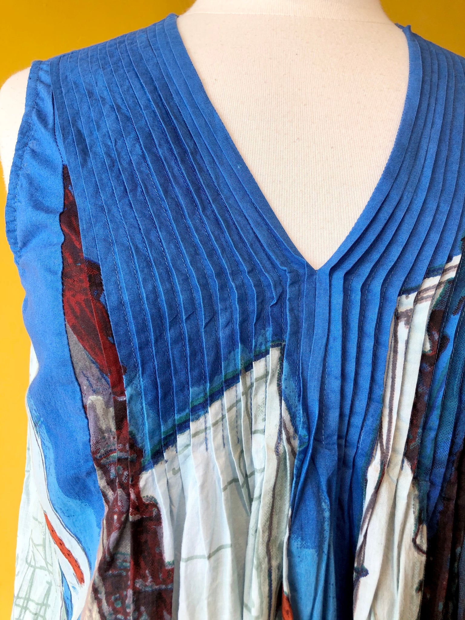 Sleeveless v-neck dress with two side pockets, pleated top, and crinkle effect.