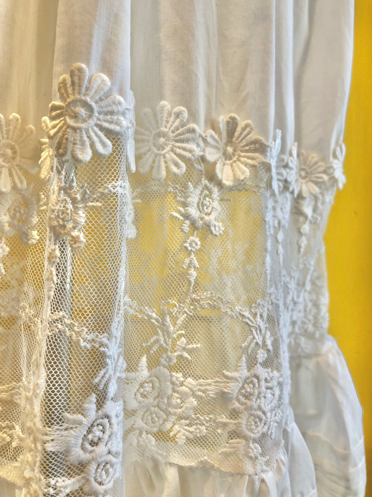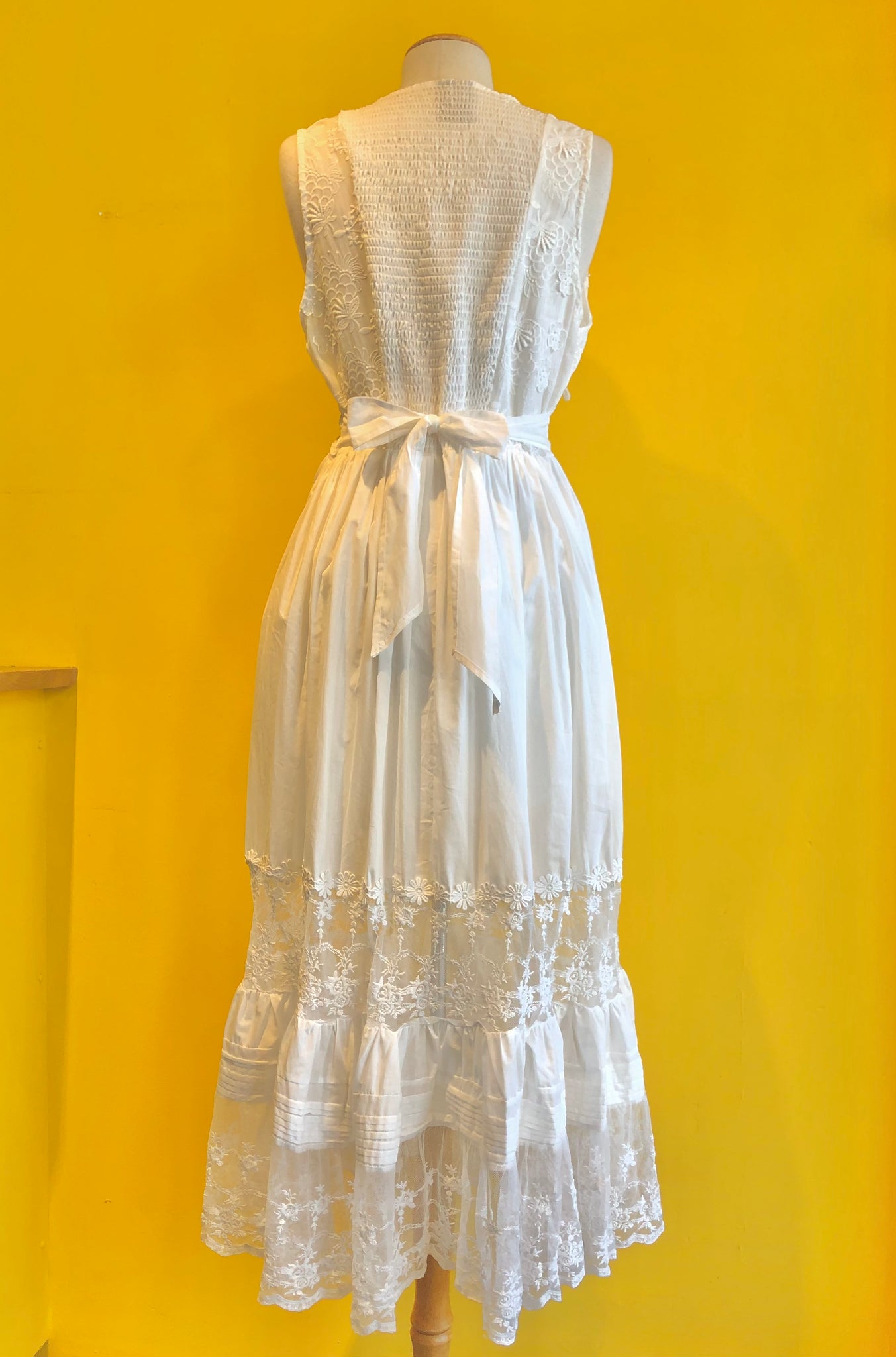 Sleeveless dress with a v-neck, floral cut-out embroidery detailing, and sheer lacework skirt. We recommend wearing with a slip if you are looking for a non-sheer look.