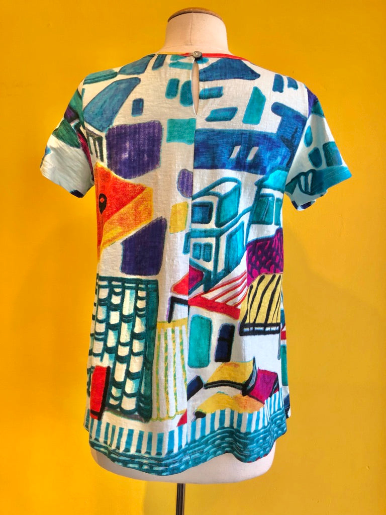 Cotton v-neck shirt with short sleeves and keyhole button closure on the back.