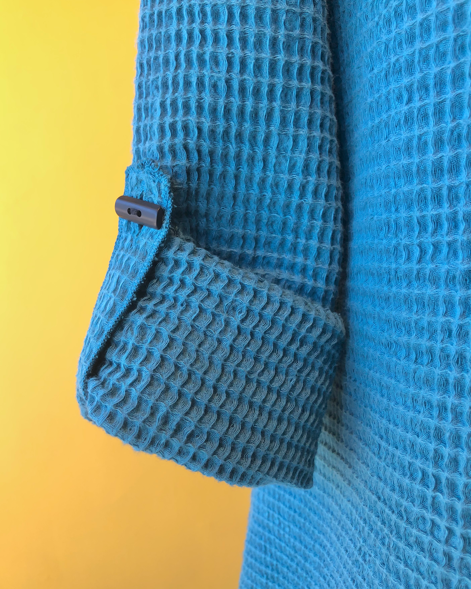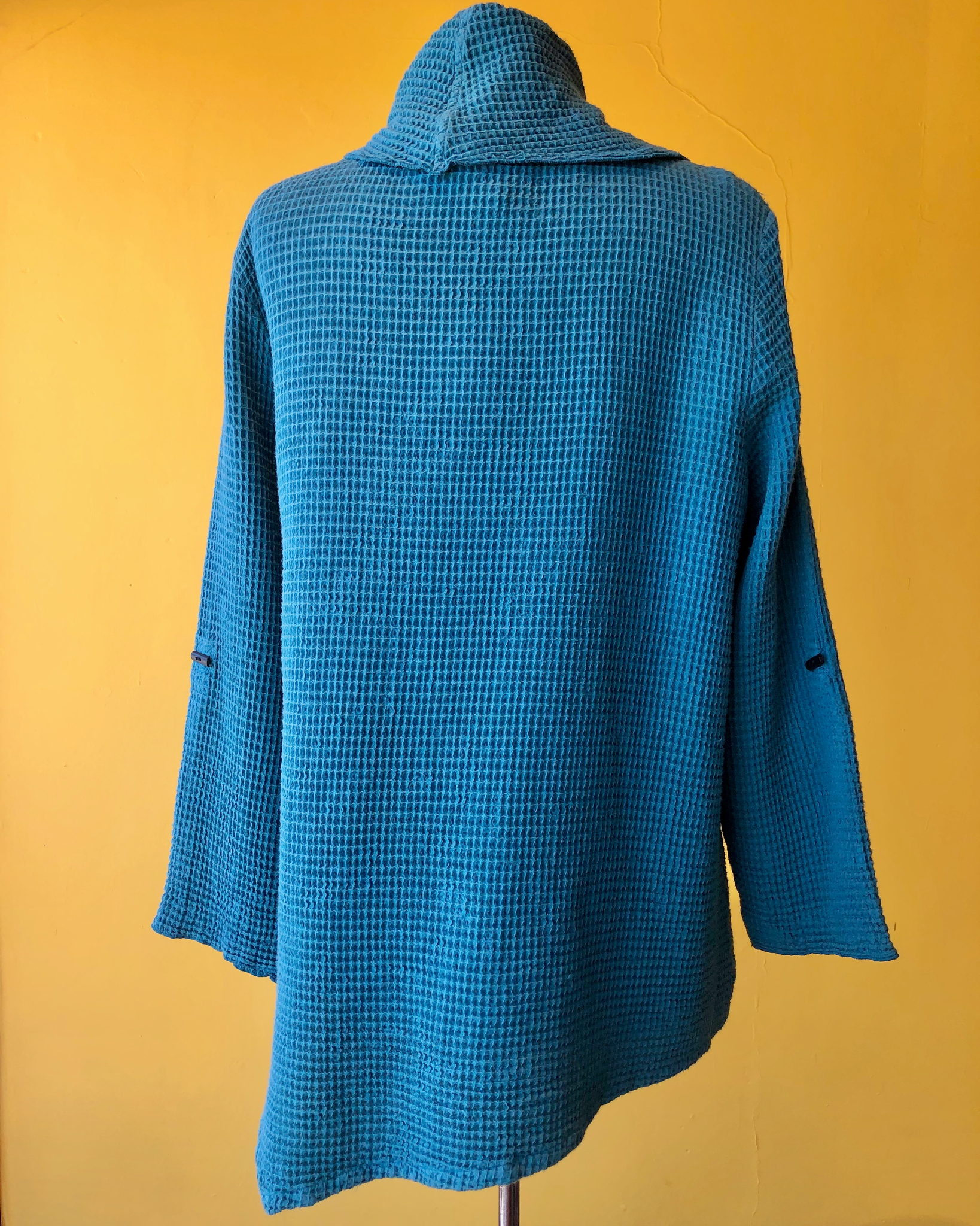 Long sleeve pull-over top with a cowl neck, one front pocket, sleeve ties, asymmetrical hem, and a waffle fabric.