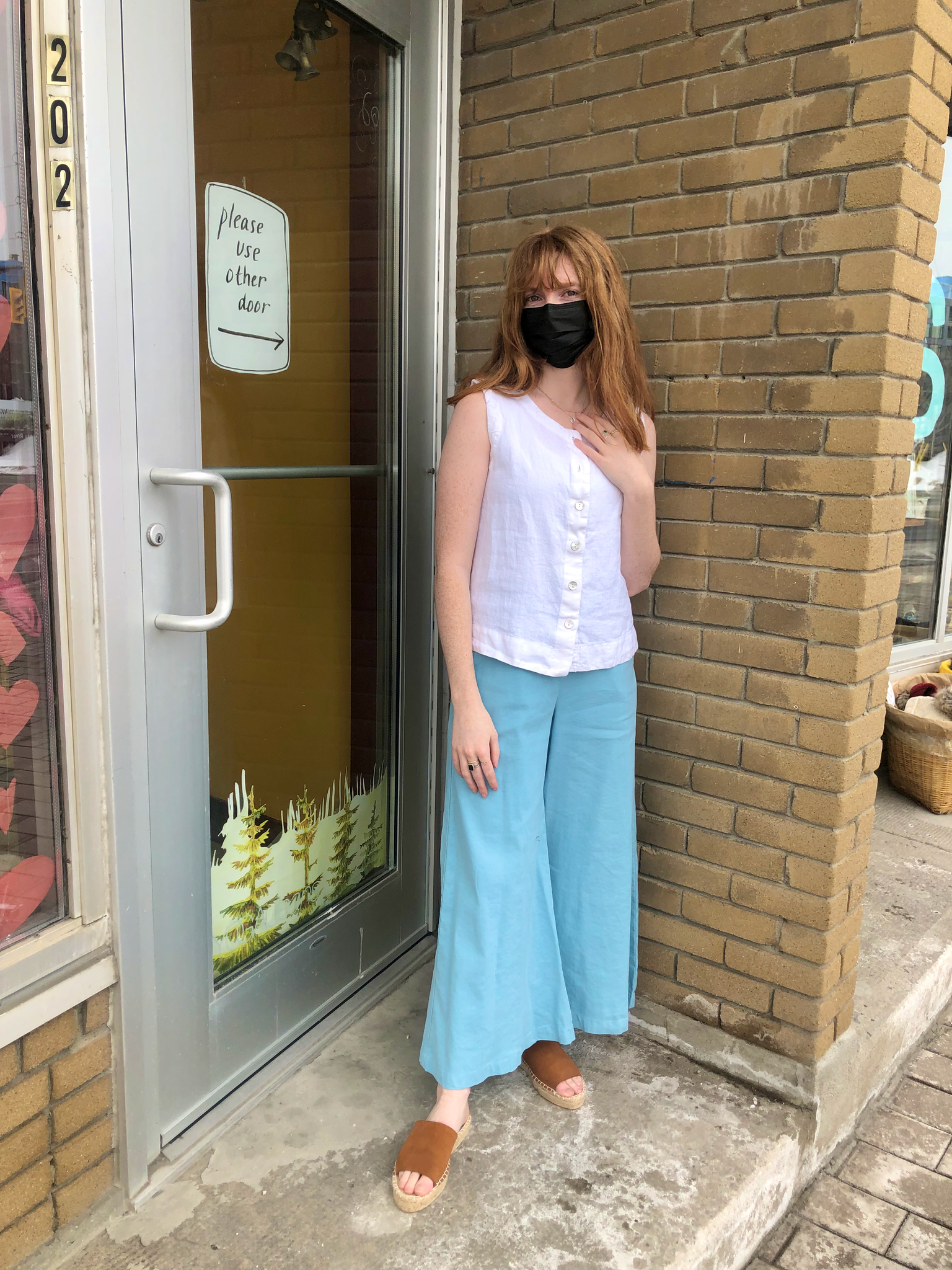 Linen tencel wide-leg pant with pockets and a stretchy waistband.