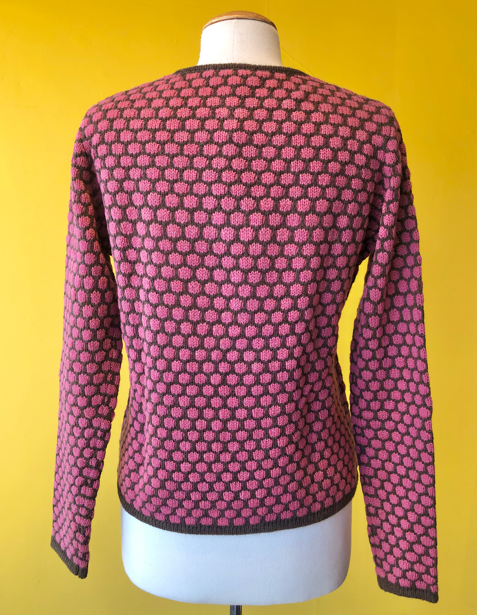 Wool / cotton blend knit top with a scoop neck, long sleeves, pink and brown pattern, and brown edging.