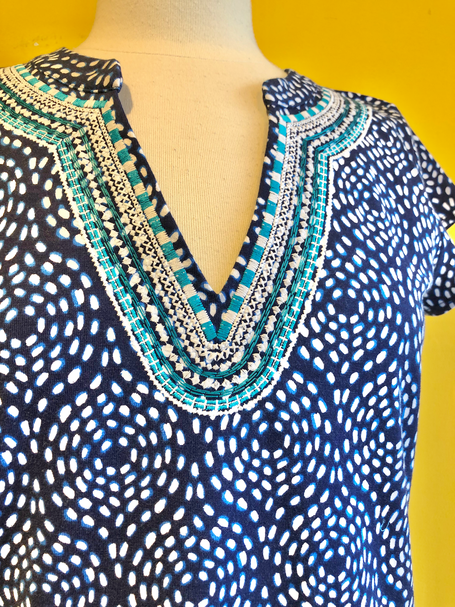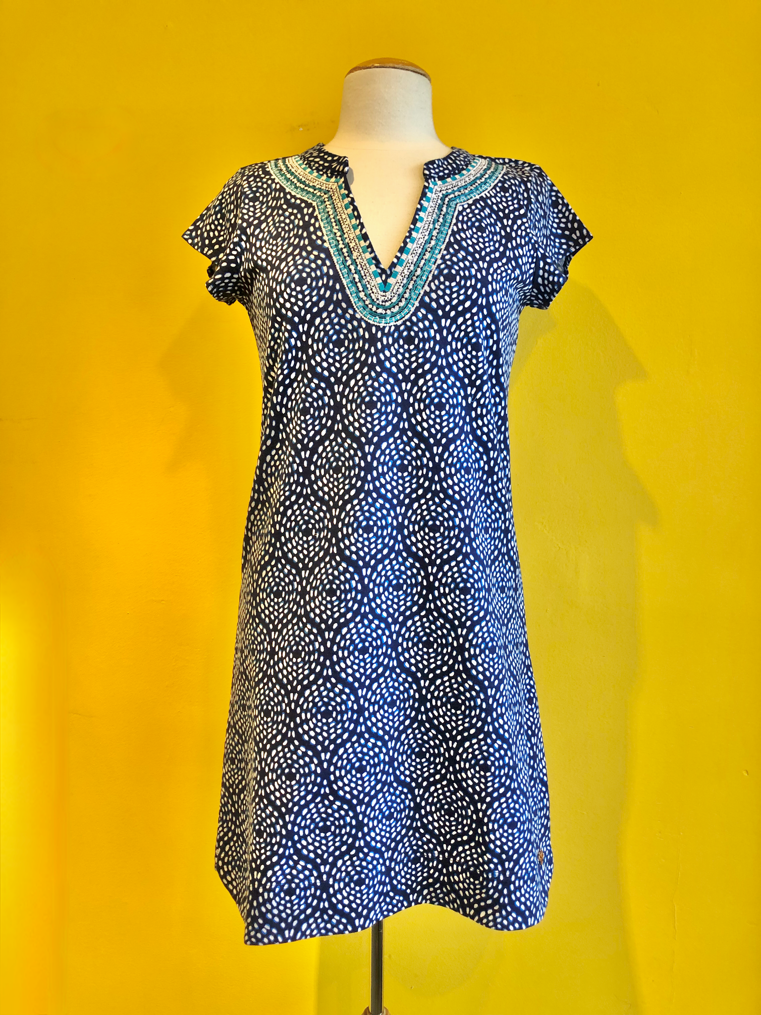 Short sleeve cotton dress with an embroidered notch v-neck.